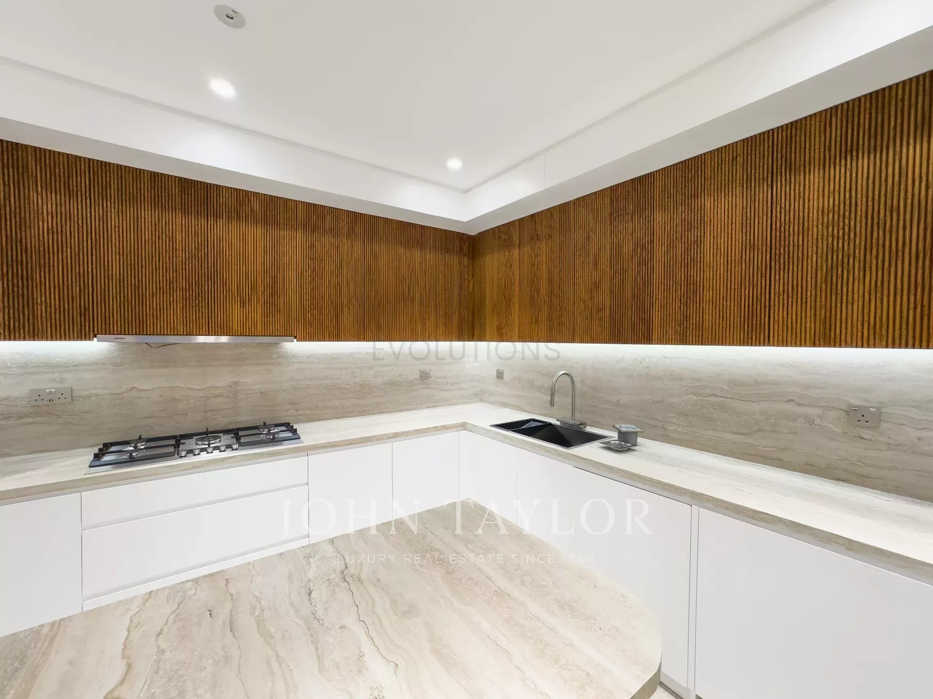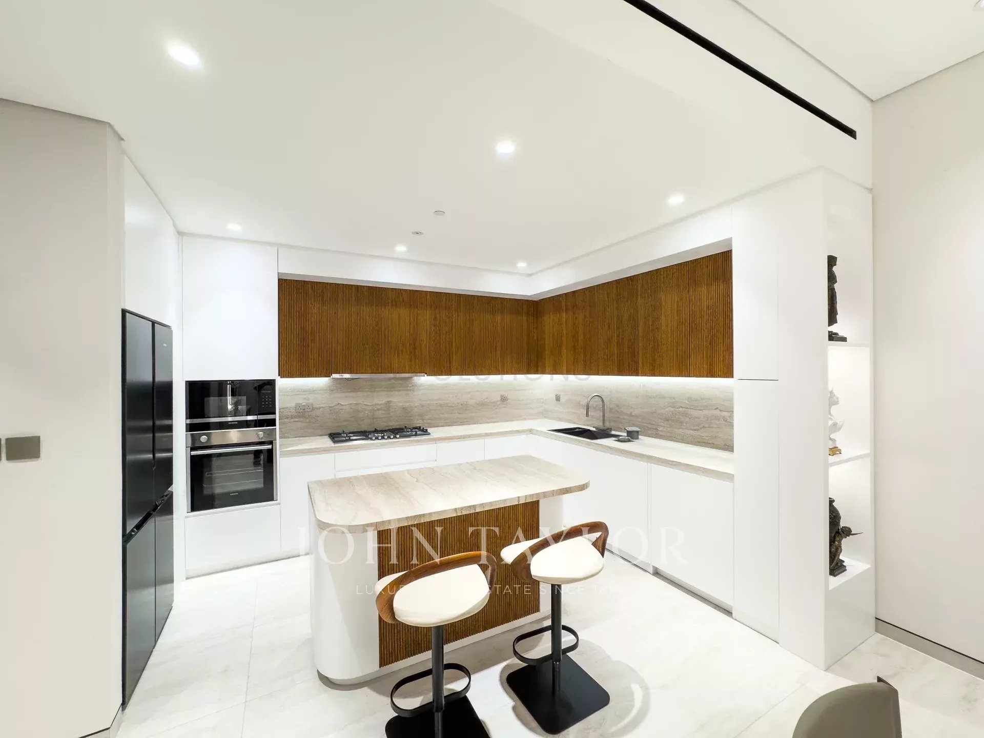 Cozinha moderna: Cozinha topo de gama totalmente equipada com electrodomésticos integrados, oferecendo um amplo espaço de balcão e arrumação para o chefe de cozinha.