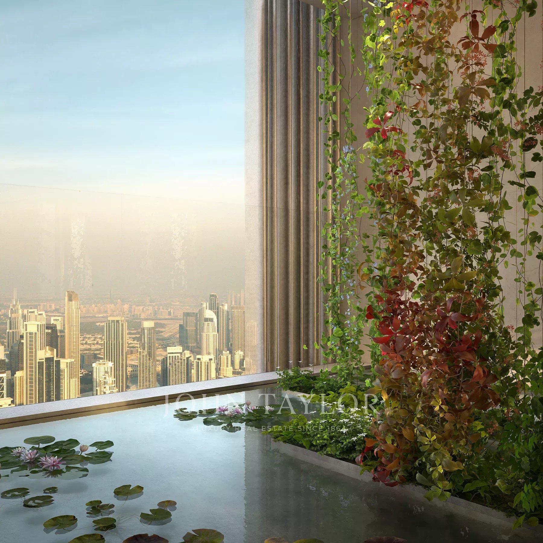 No exterior, o espaço estende-se por 5.258,82 pés quadrados. Uma longa piscina privada estende-se ao longo do terraço, acompanhada por decks lounge sombreados e bolsos de jardim paisagístico que criam uma sensação de calma e isolamento. Vários terraços estendem-se a partir das principais áreas de estar e quartos, oferecendo espaços para refeições ao ar livre ou reuniões ao pôr do sol com vista para o Canal de Água do Dubai. A interação entre a vegetação, a água e a arquitetura realça a sensação de viver num oásis urbano tranquilo.