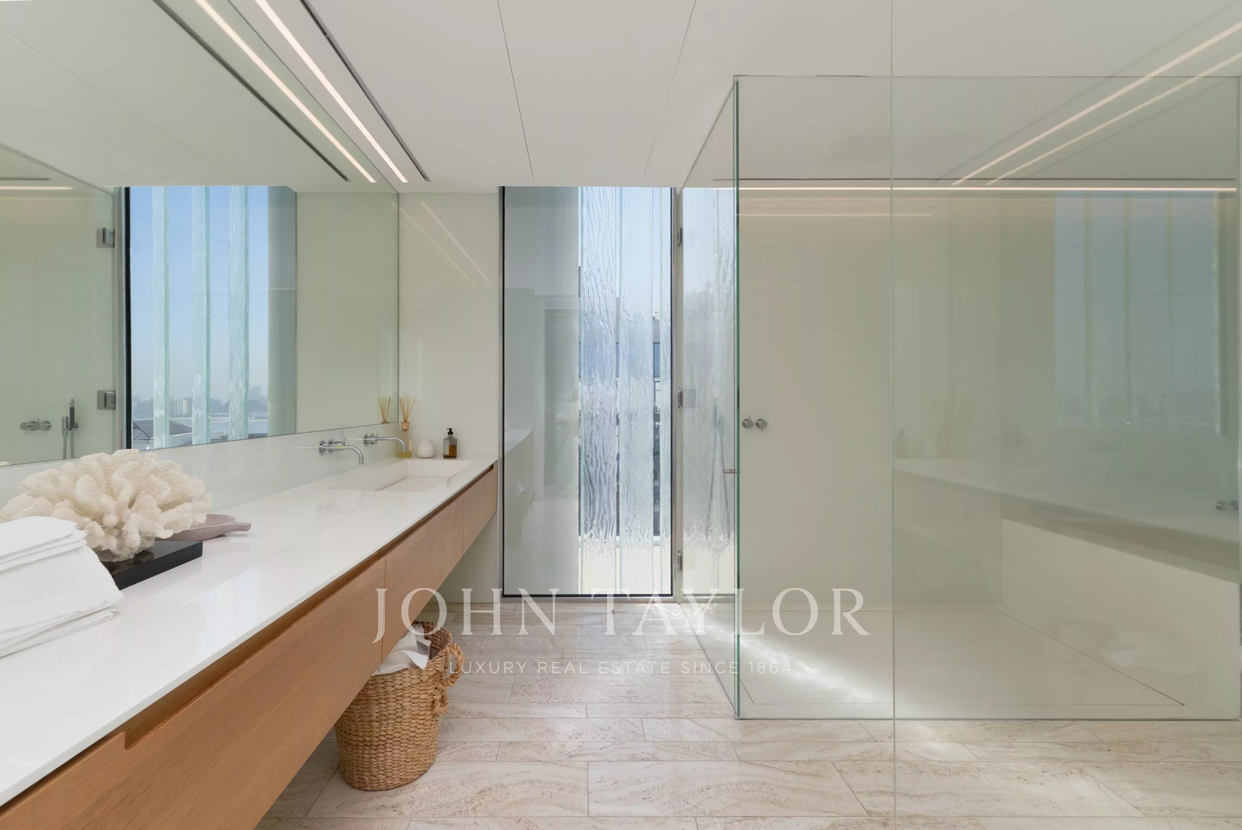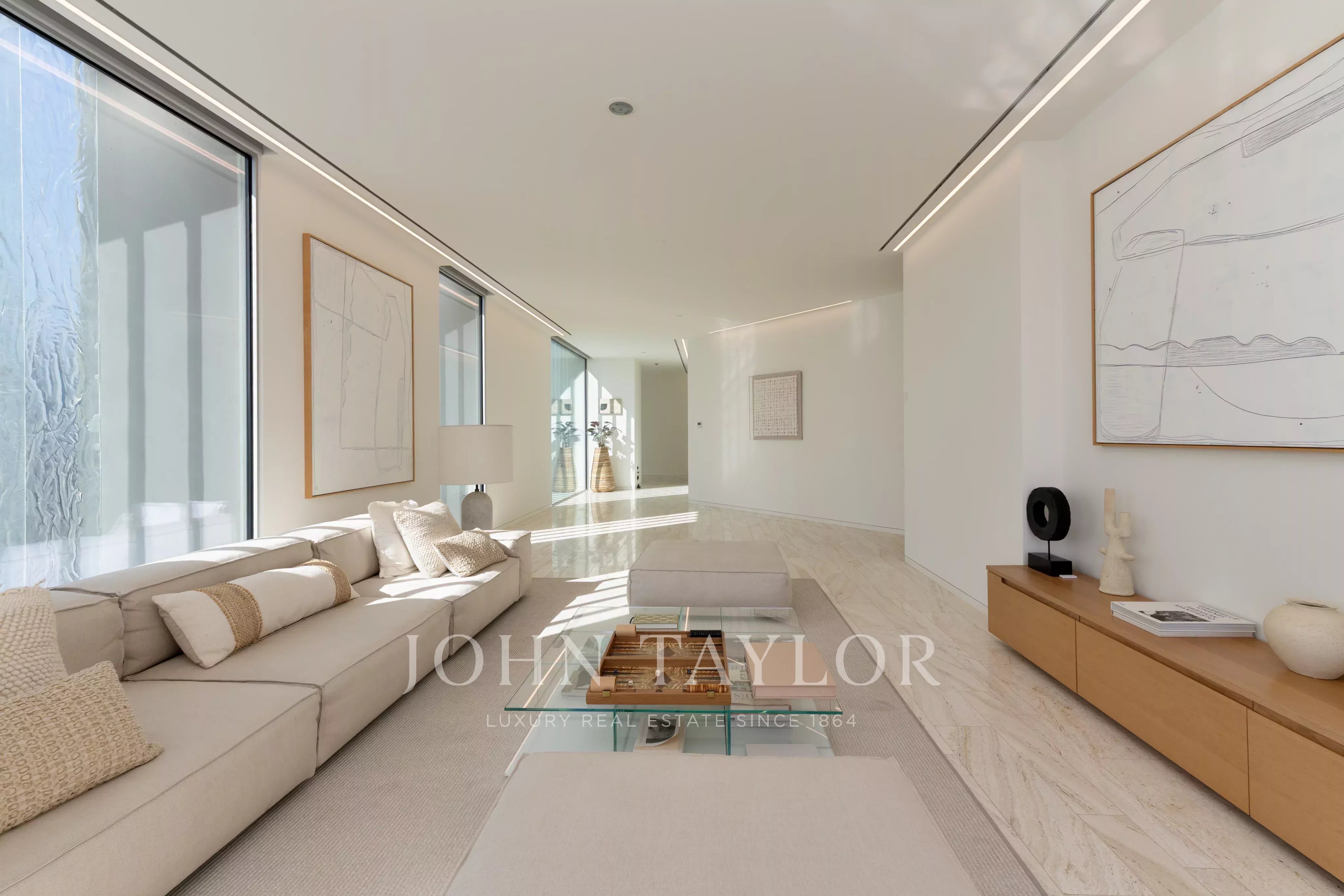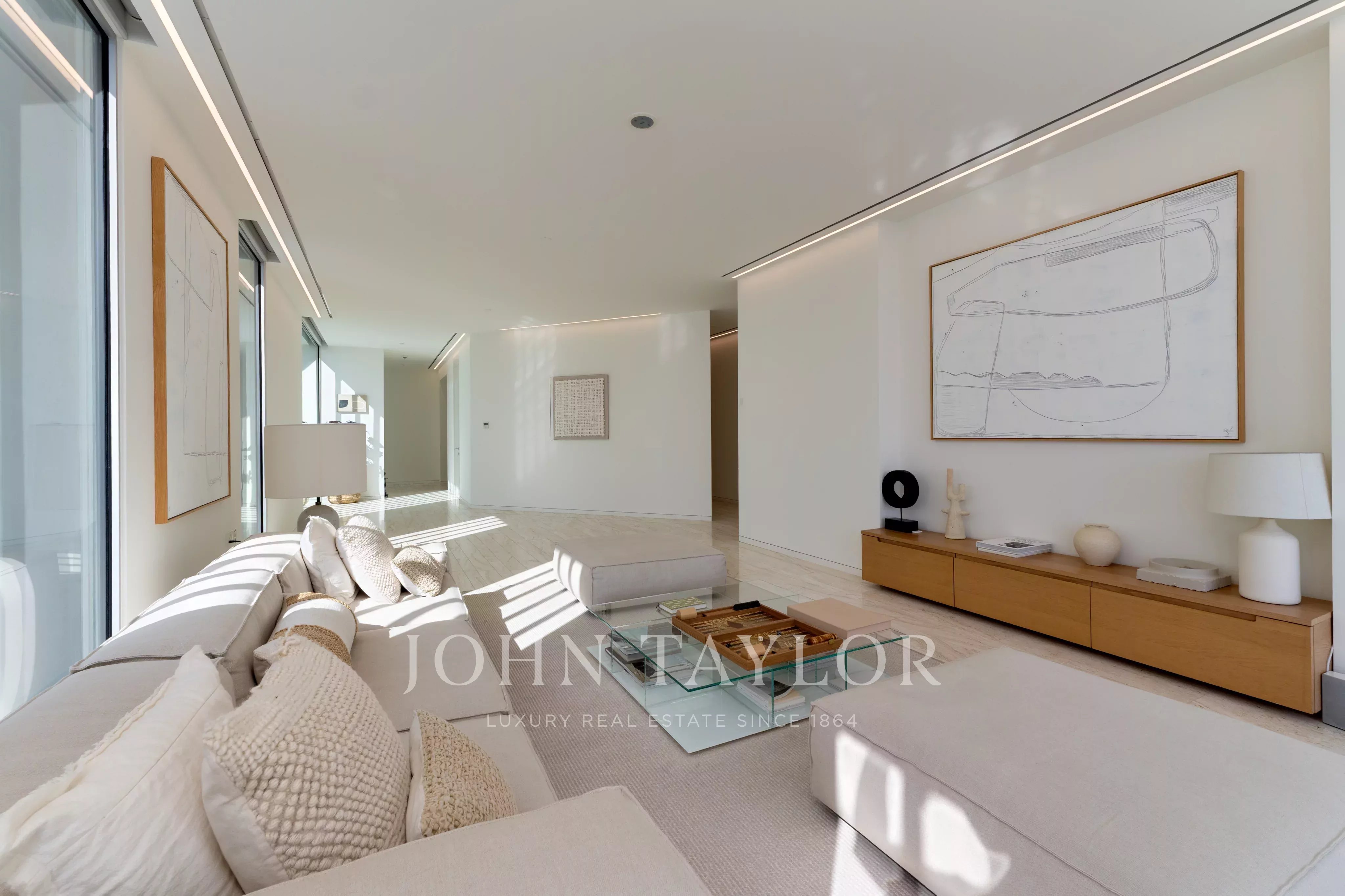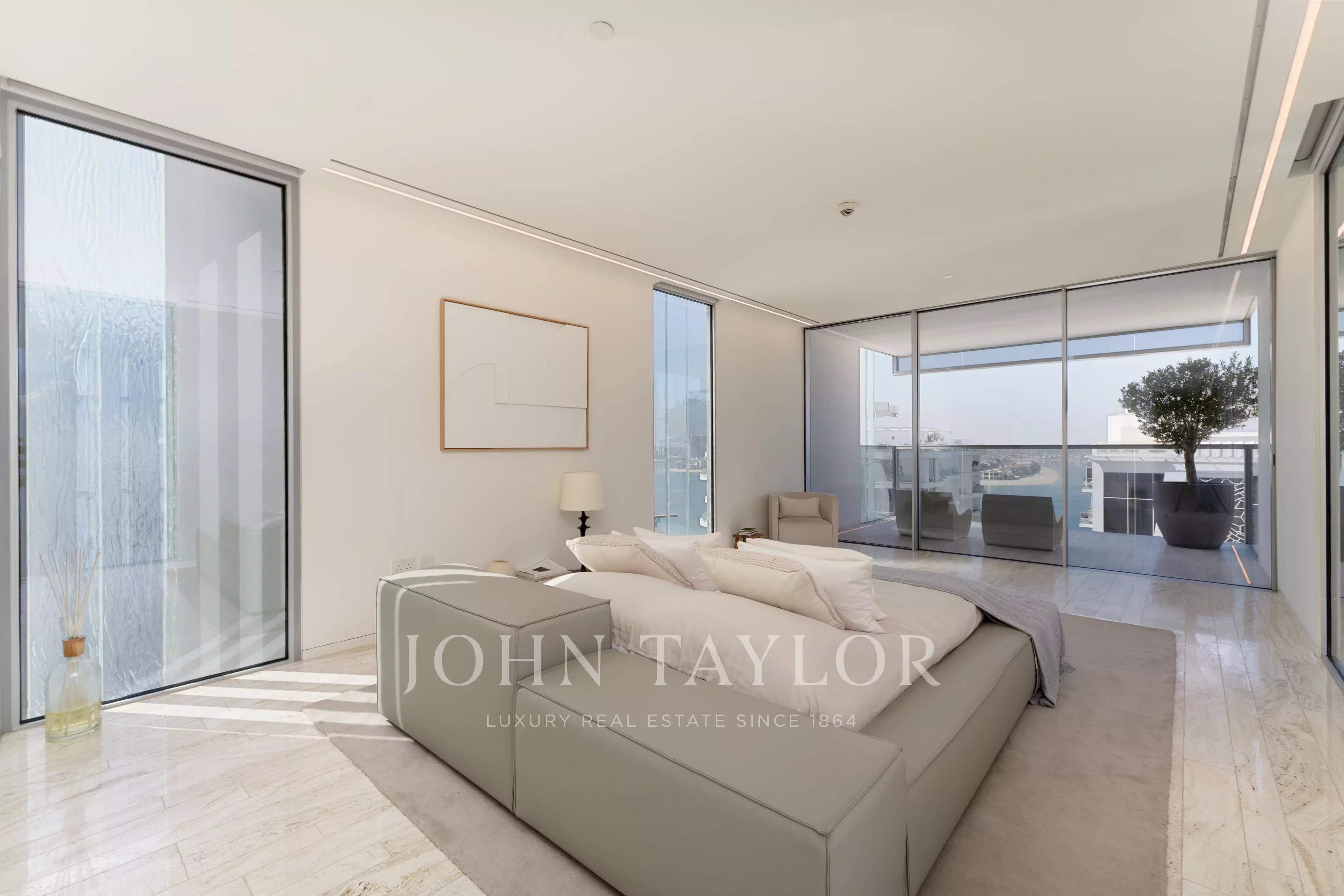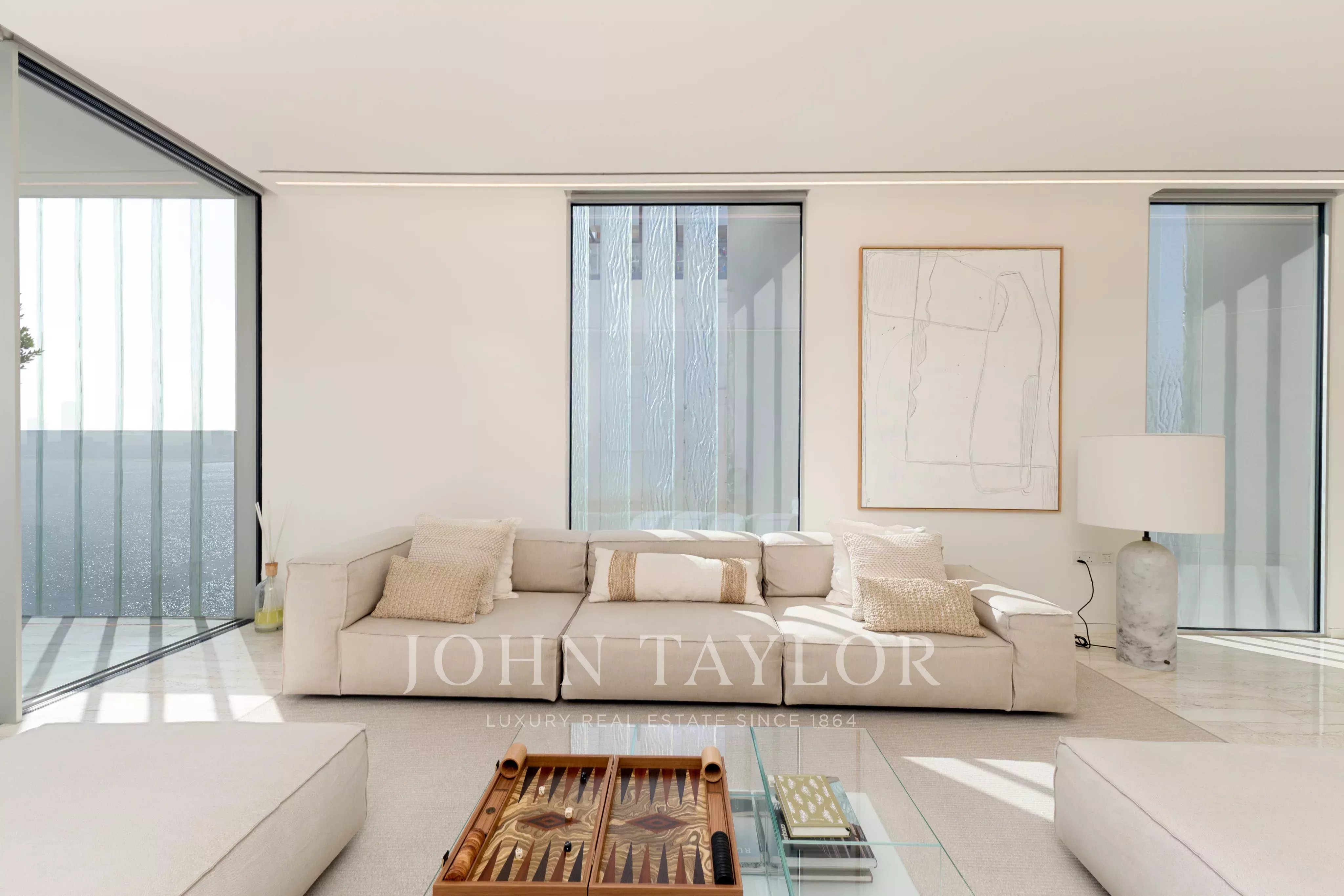 Localizado no East Crescent do Palm Jumeirah, encontra-se um apartamento impecável no Muraba Dia, concebido pelo RCR Arquitectes, galardoado com o Prémio Pritzker de 2017. Orientada de leste para oeste, a residência permite ao residente apanhar sol durante as diferentes fases do dia, enquanto desfruta de vistas para o mar e para as palmeiras. Com uma área total de construção de 4.792 pés quadrados, a casa é definida por linhas simples e detalhes minimalistas que lhe conferem uma sensação única de leveza, juntamente com janelas do chão ao teto que equilibram delicadamente a privacidade e a abertura.