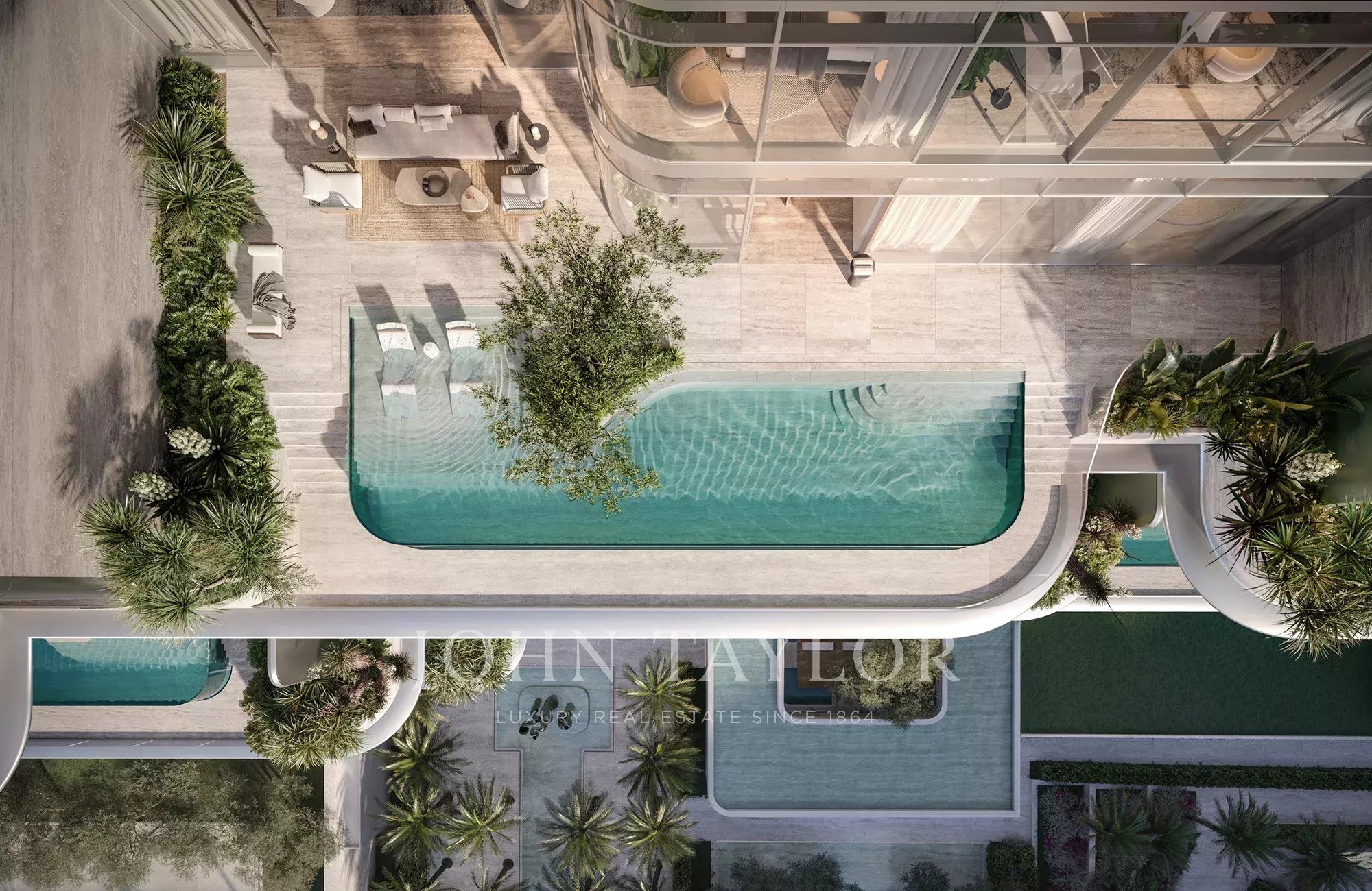 Uma caraterística de destaque do duplex é o amplo terraço exterior e o deck da piscina infinita. A piscina privada estende-se até 18 m de comprimento e 3 m de largura. Os moradores podem optar por maximizar esta área de 2.921 pés quadrados para incluir um espaço de refeições ao ar livre, espreguiçadeiras e muito mais. Esta área exterior liga-se perfeitamente à cozinha e aos espaços de refeições, tornando-a num cenário perfeito para entreter os convidados enquanto desfrutam de excelentes vistas da cidade e do mar.