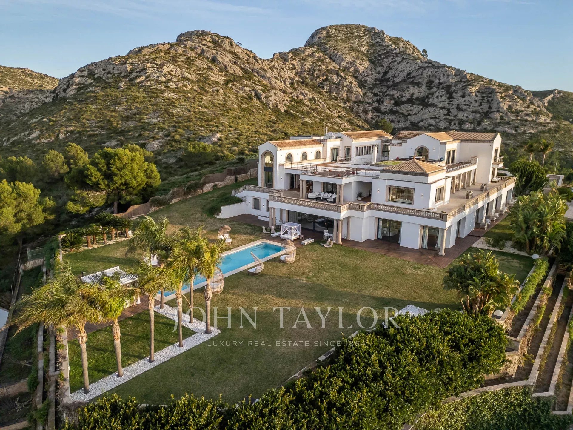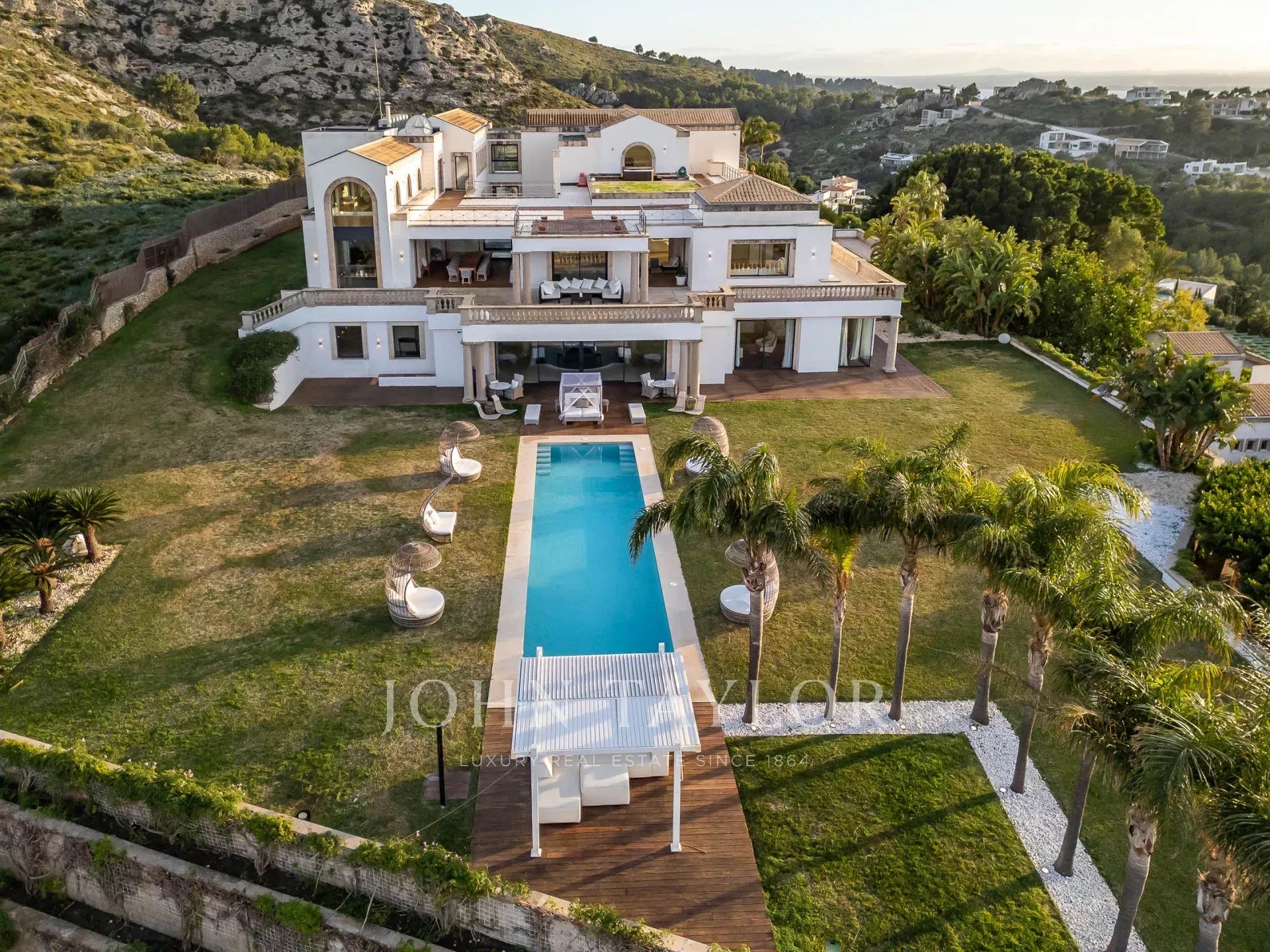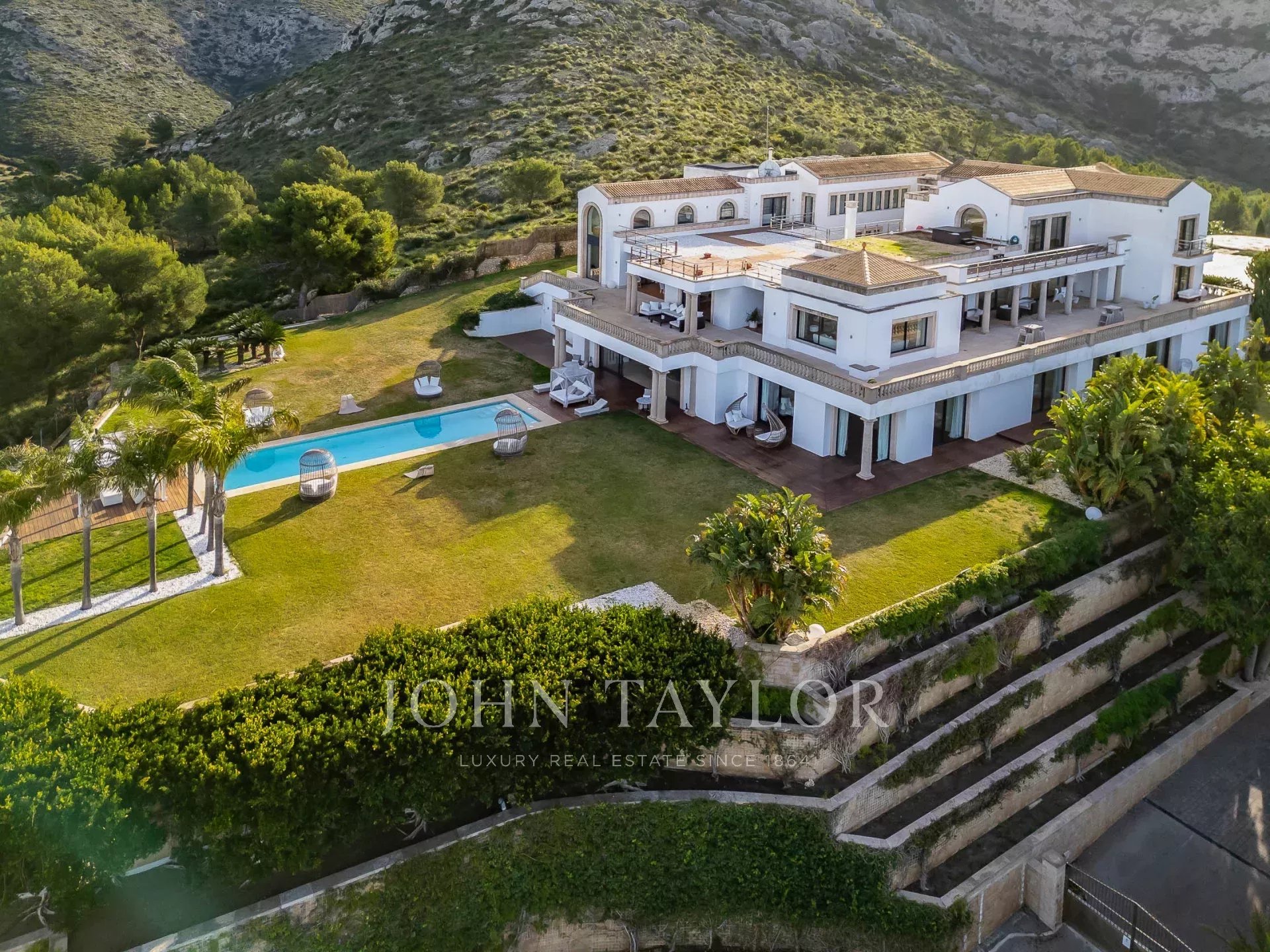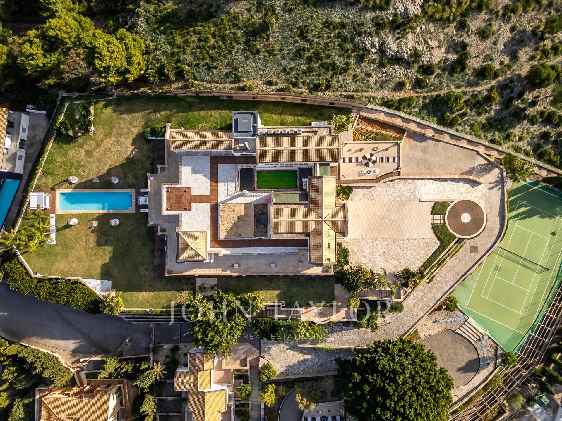 O exterior da propriedade oferece uma variedade de áreas diferentes para refeições ao ar livre e entretenimento para atender a grupos grandes ou pequenos, piscina, jardins bem cuidados, campo de ténis, a "estufa" e heliporto para acesso aéreo direto à propriedade.