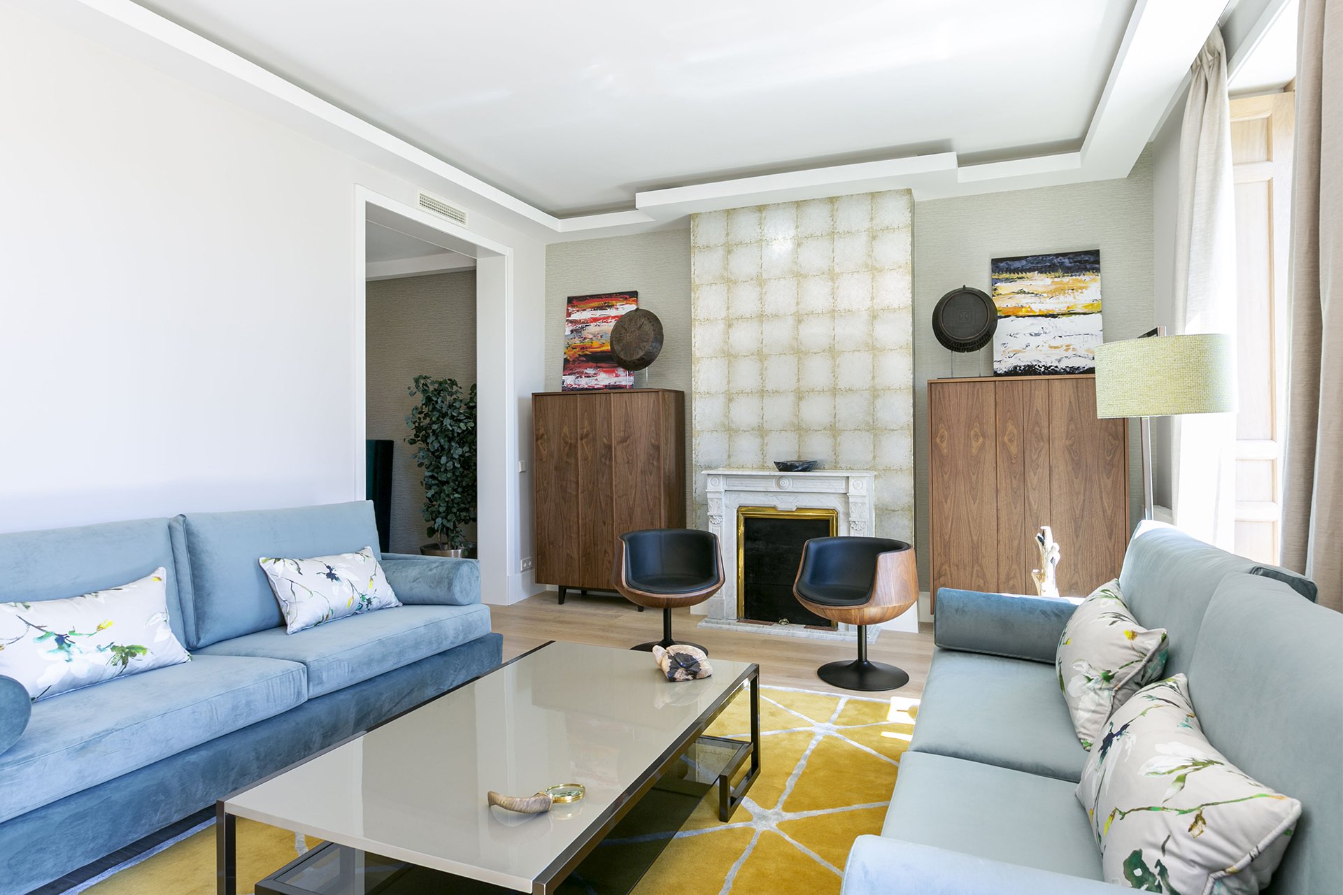 A grande sala de estar tem duas varandas viradas para leste com vista para a Praça da Villa de Paris.