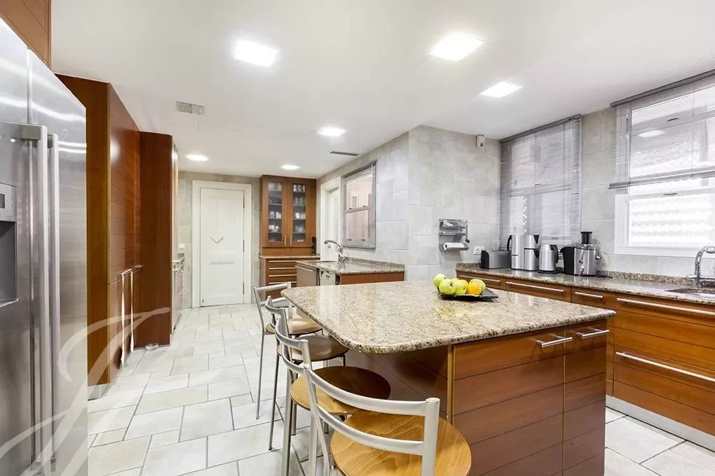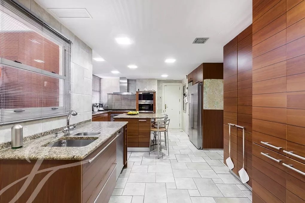 Do hall de entrada, onde a elegante escadaria com corrimão em ferro forjado nos conduz ao piso dos quartos, temos acesso à ampla sala de estar com mais de 80m² completamente em plano aberto e com grandes janelas que lhe conferem uma elevada luminosidade e sensação de espaço, A sala de estar liga-se a uma grande sala de jantar formal, e esta por sua vez a uma outra sala de jantar mais informal de onde se acede à magnífica cozinha de quase 30m2, a zona de serviço completa-se com uma lavandaria-engomadoria, um quarto de serviço com casa de banho e um terraço de secagem.