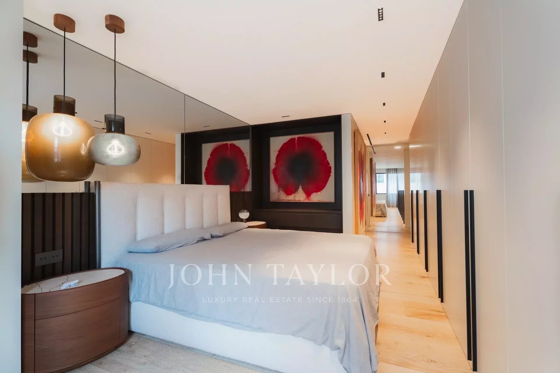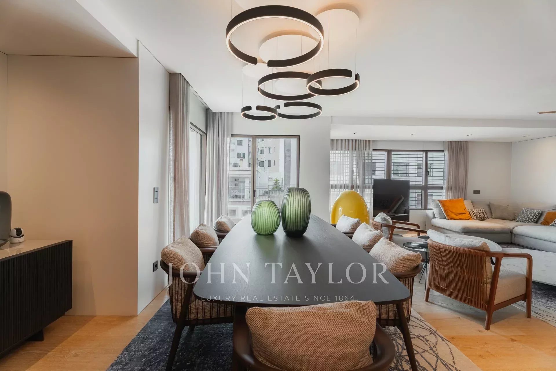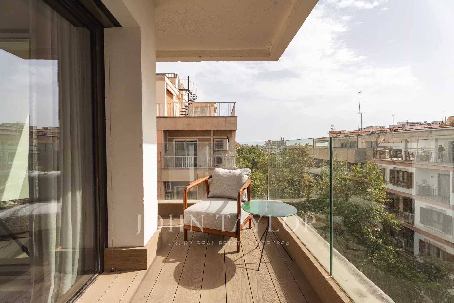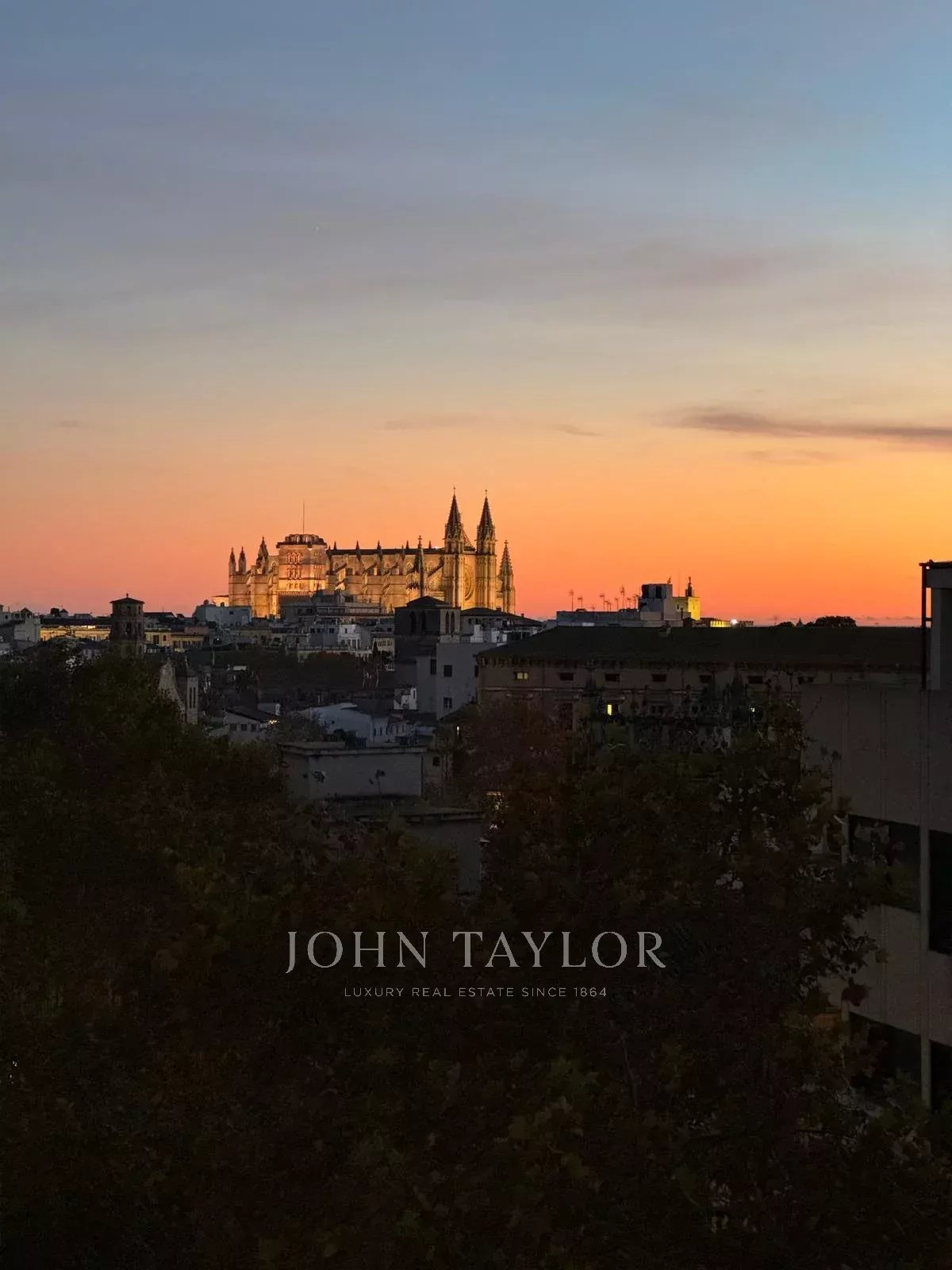 Este apartamento moderno e totalmente mobiliado apresenta um amplo espaço em conceito aberto, com cozinha de design, elegante sala de jantar e luminosa sala de estar, todas com acesso direto a um terraço coberto que oferece vistas deslumbrantes da icônica Catedral de Palma.