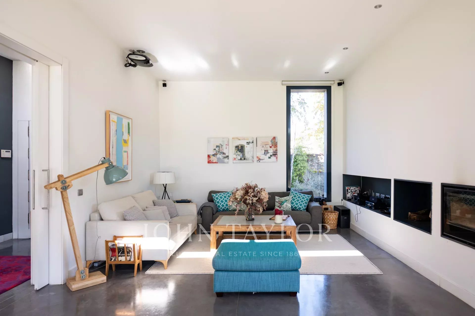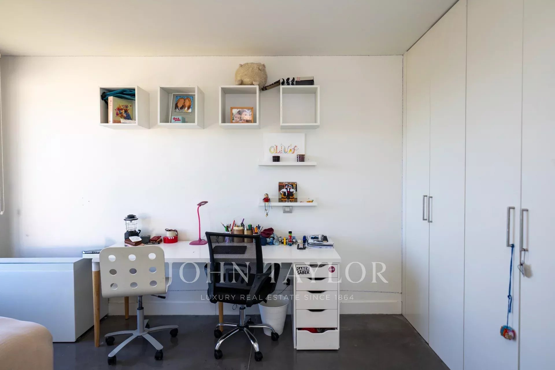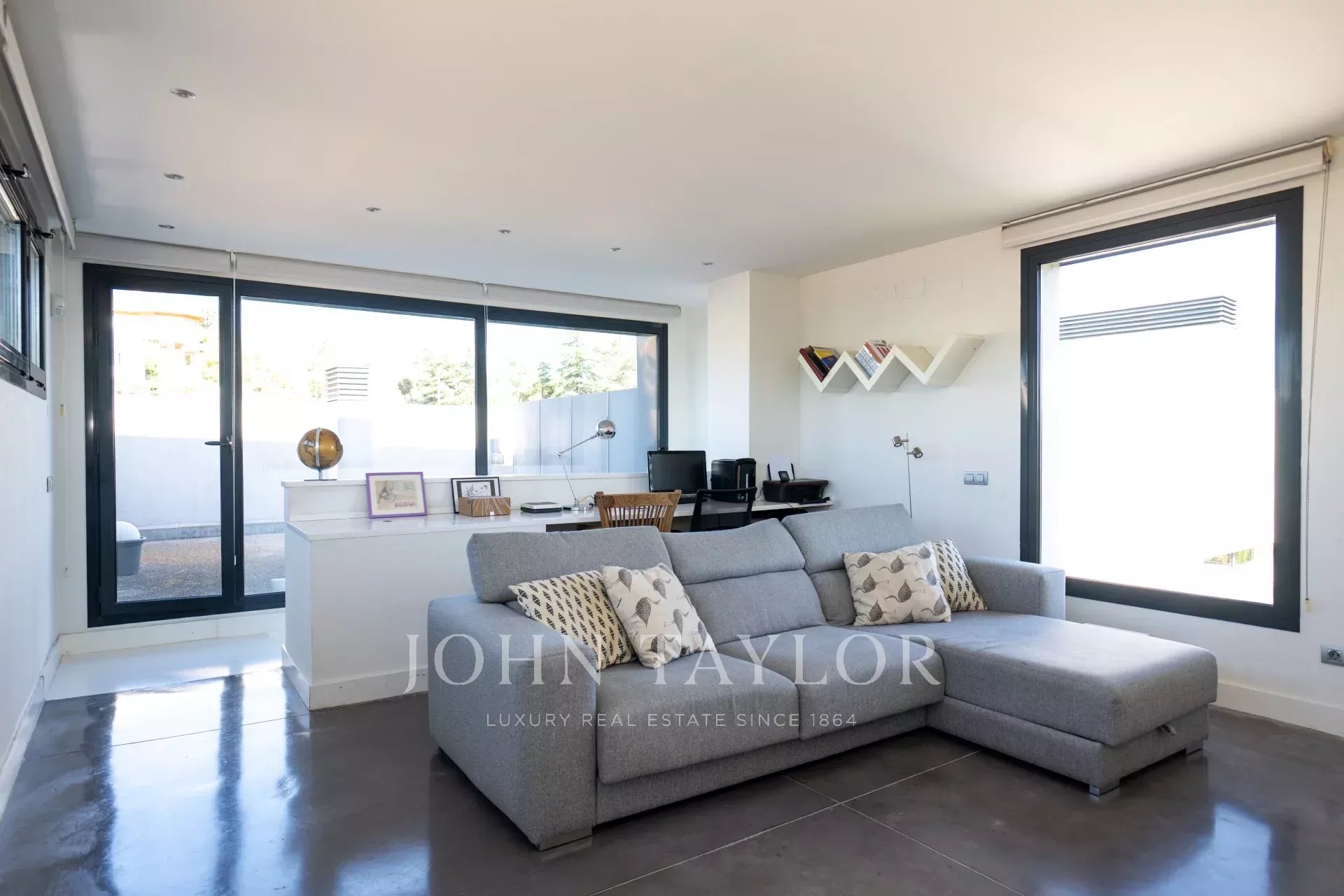 No primeiro andar, existe uma grande sala de estar com ventilação cruzada que pode ser facilmente convertida num quarto. Ao lado, dois quartos grandes e luminosos, ambos com casas de banho privativas e roupeiros embutidos. Um enorme terraço com vista para o horizonte de Madrid completa esta zona de descanso.