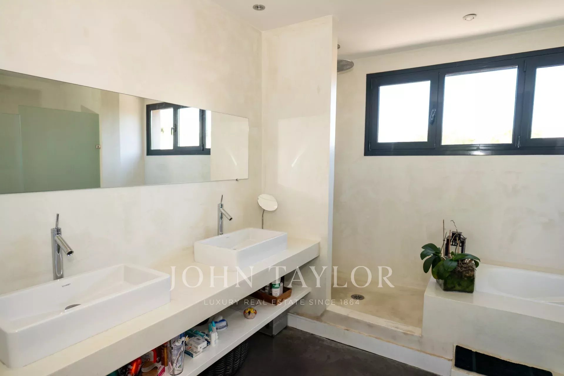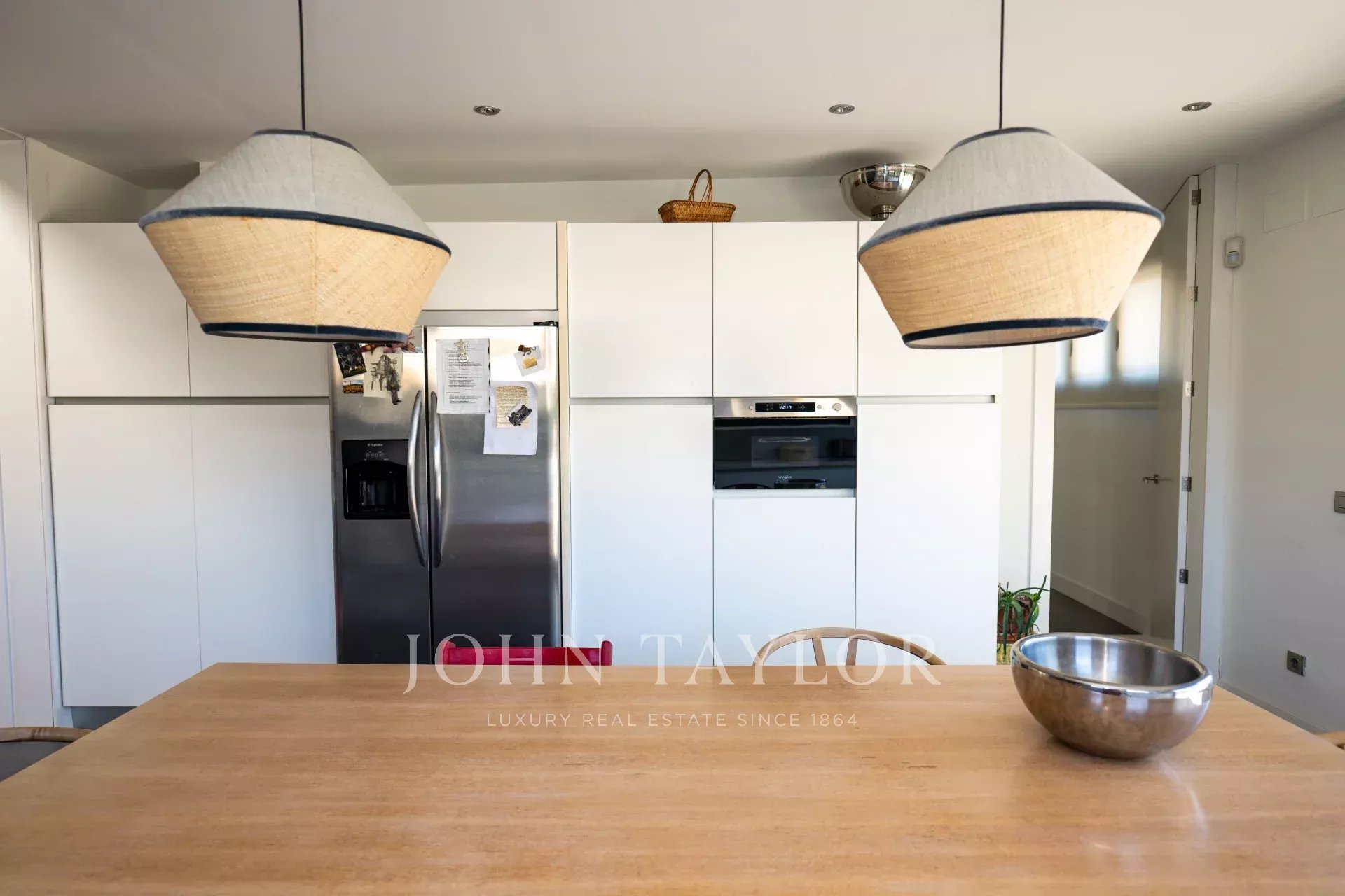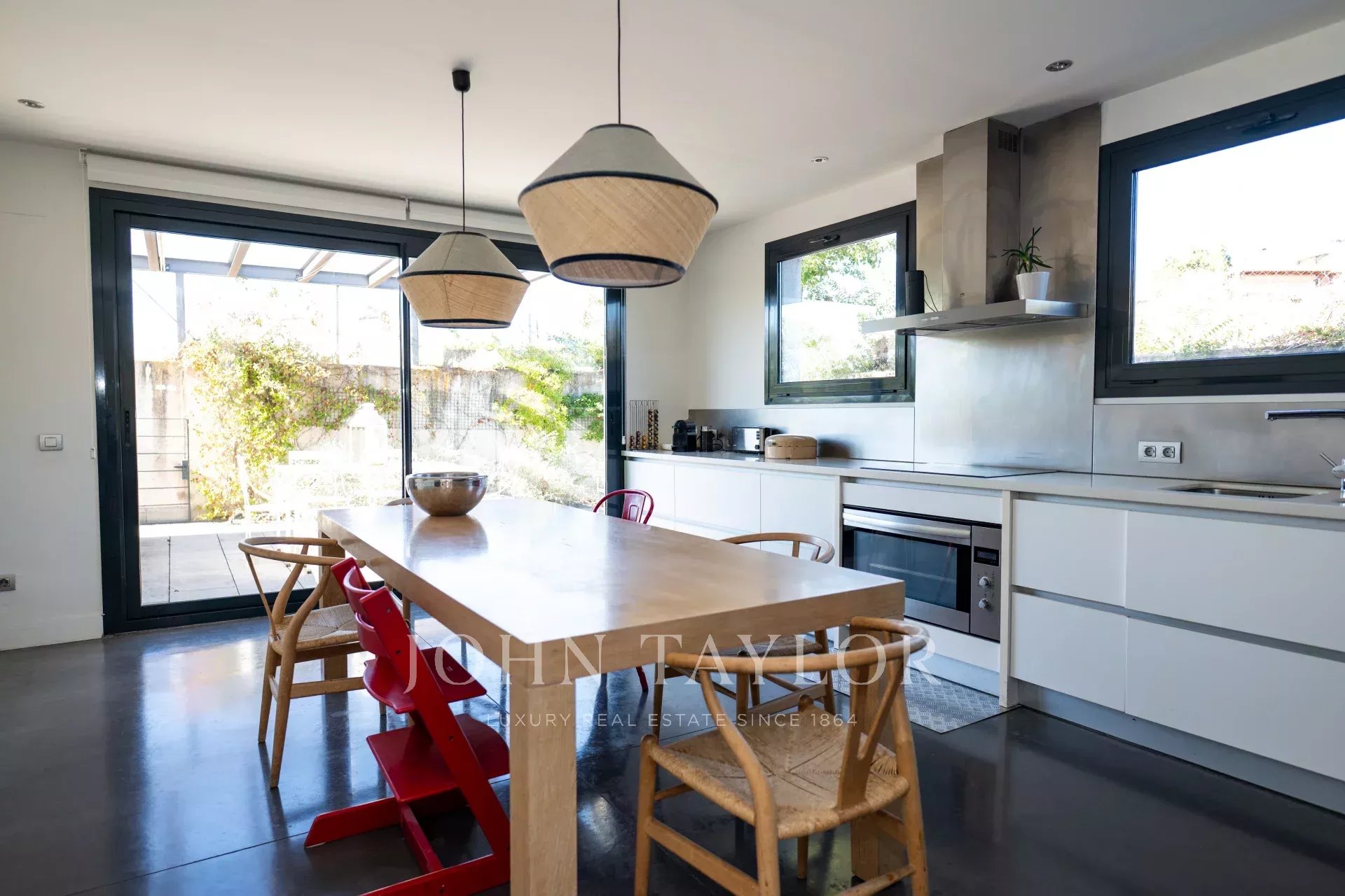 Num terreno de 1000m2, e com um design moderno, a propriedade recebe-nos com um encantador hall de entrada, que dá acesso a uma cozinha imensa e perfeitamente equipada, com uma mesa de jantar central em estilo de ilha.