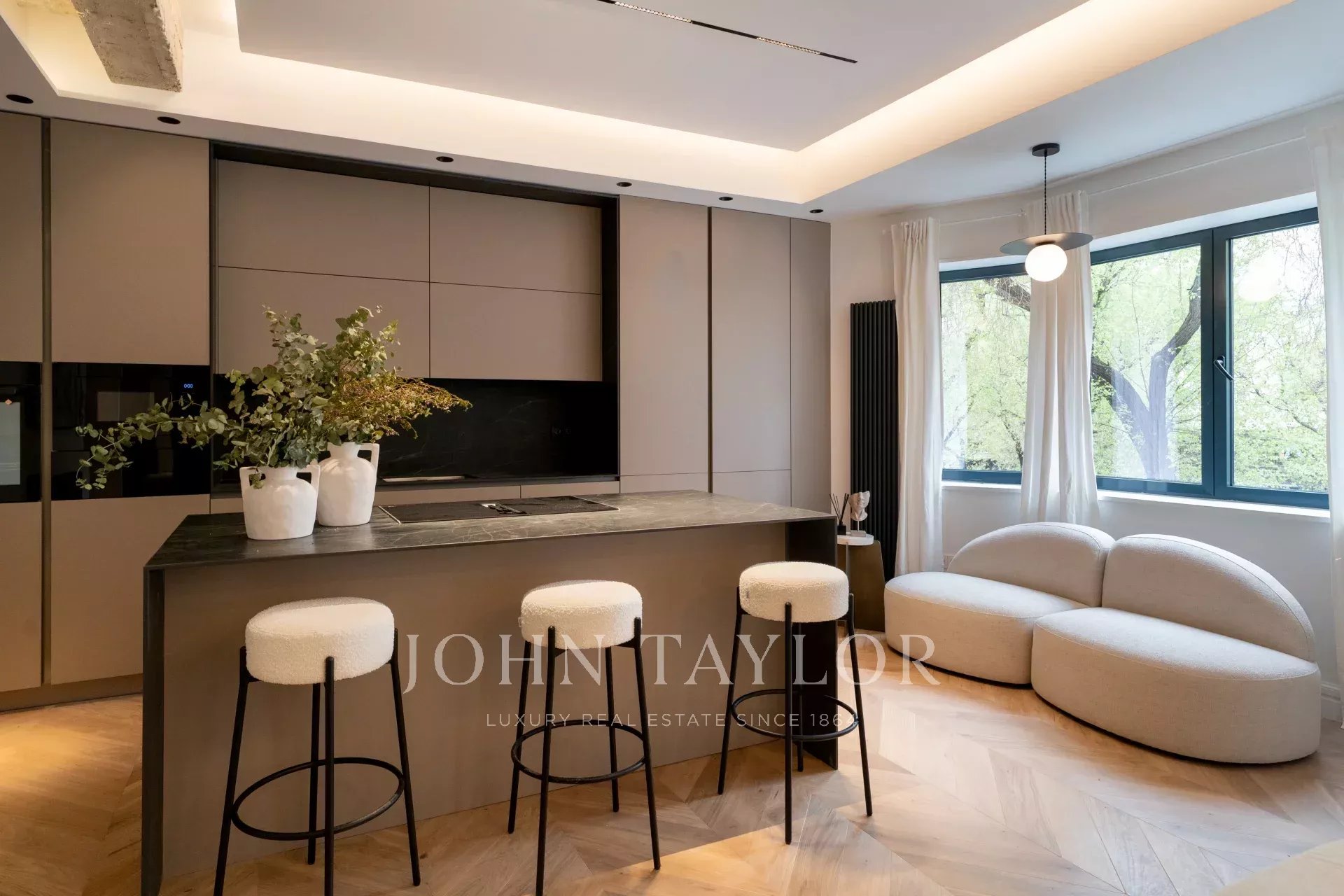 A sala de estar principal abre-se para uma grande varanda com vistas desafogadas, perfeita para desfrutar do bom tempo, enquanto as janelas do chão ao teto inundam todo o apartamento de luz natural.