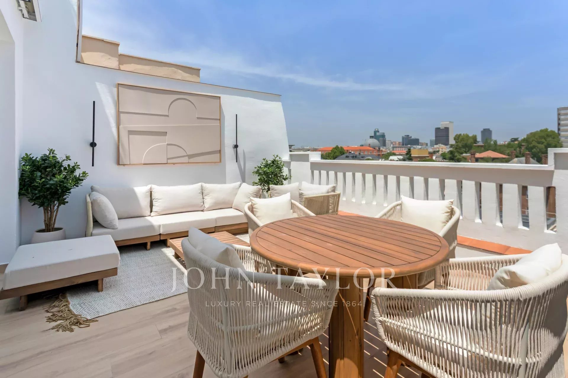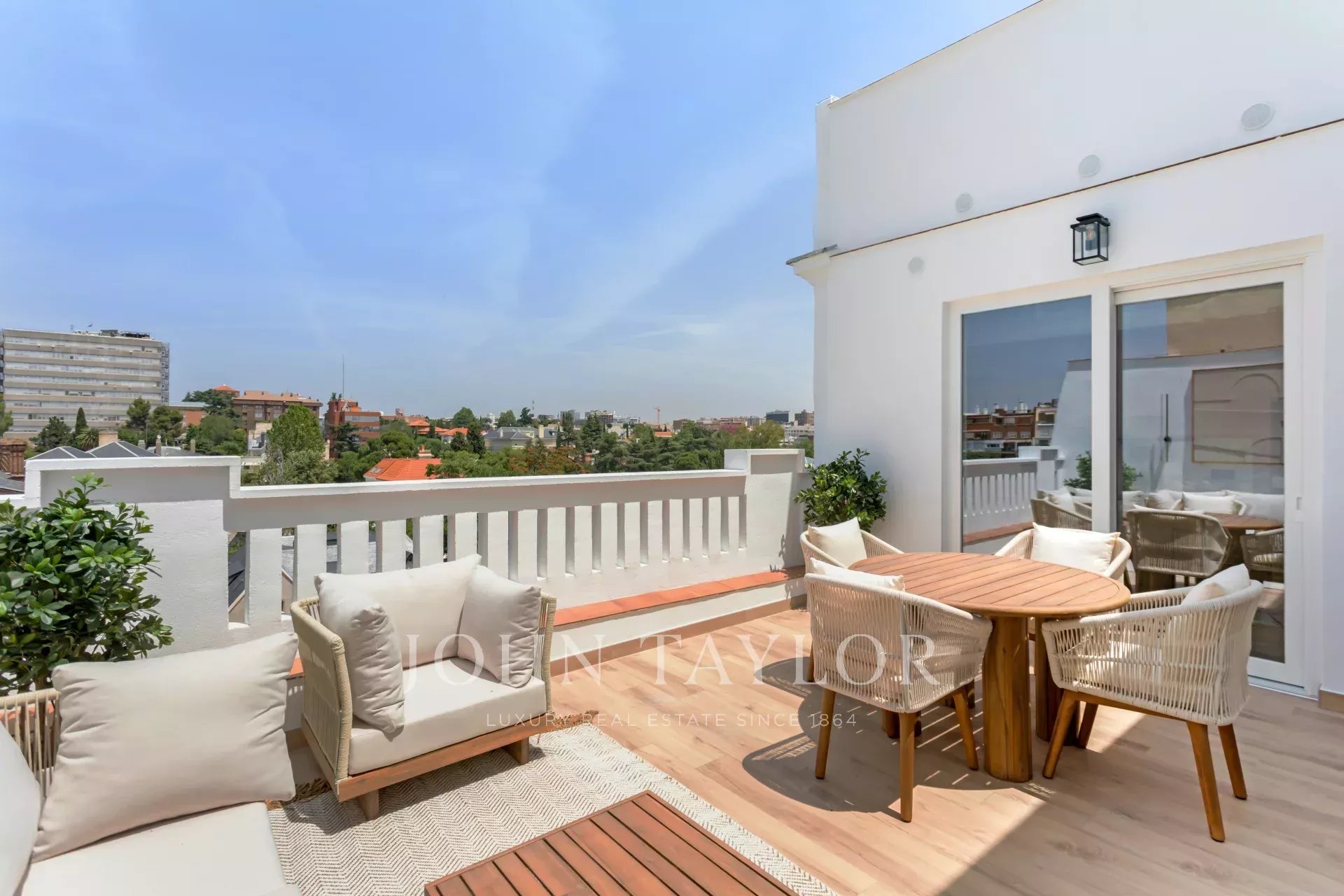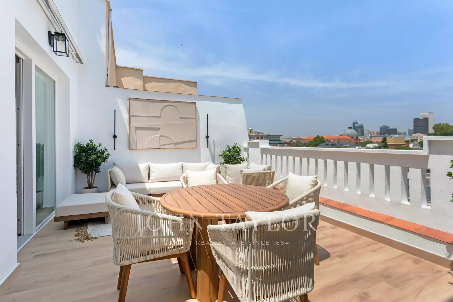 O terraço tem uma forma quadrada, uma superfície de 20 m² e goza de belas vistas panorâmicas para o norte da capital.