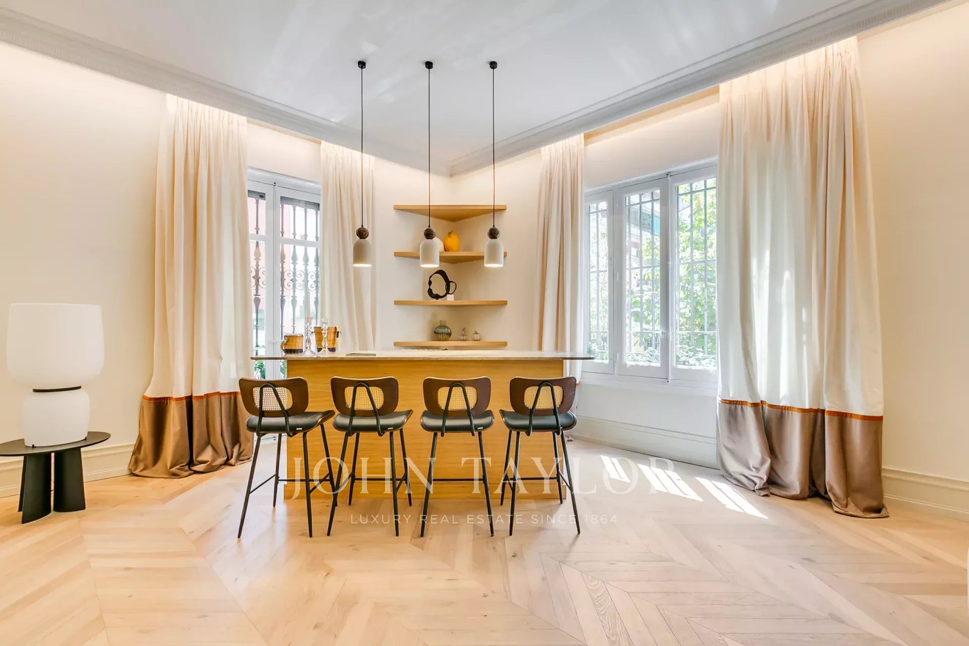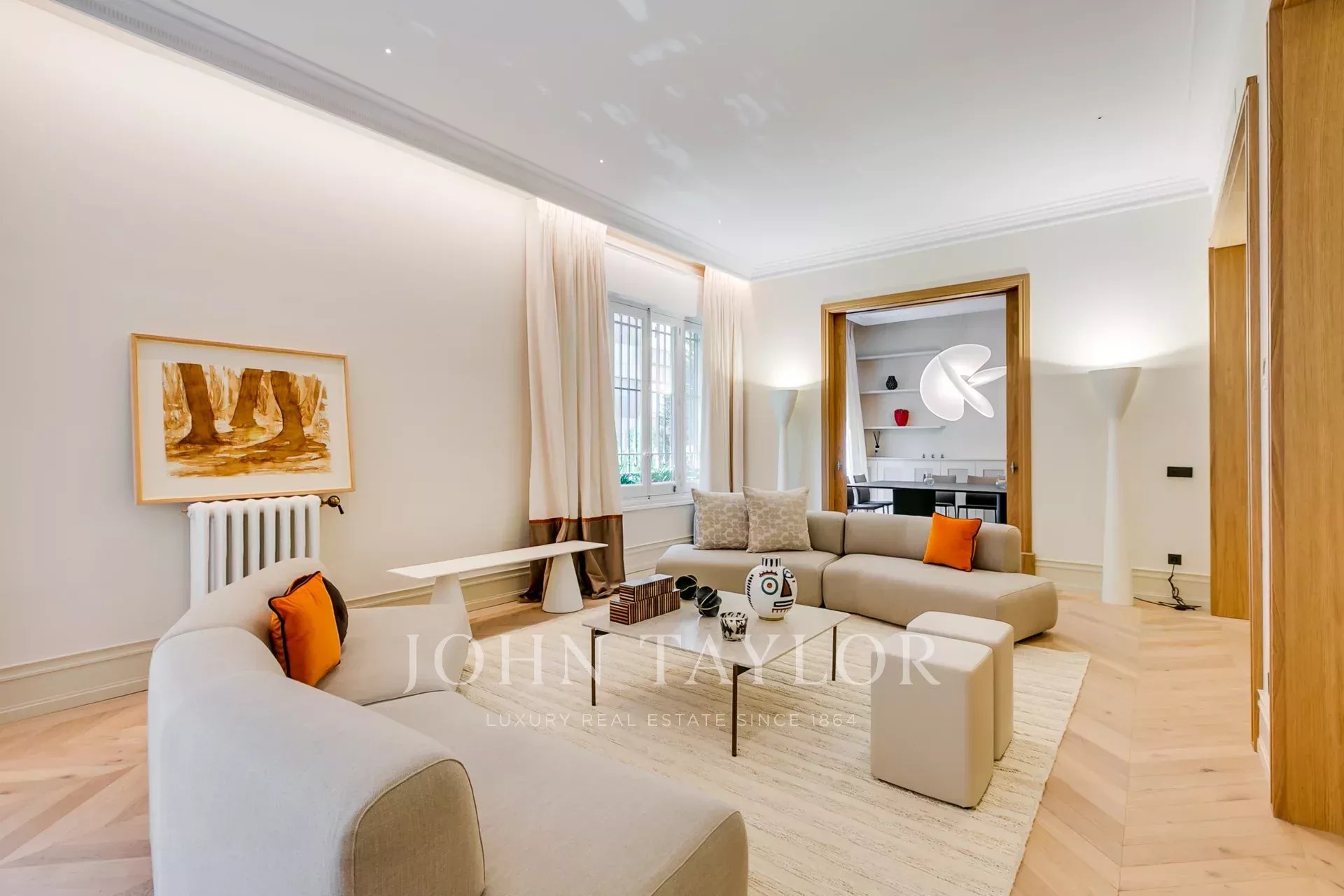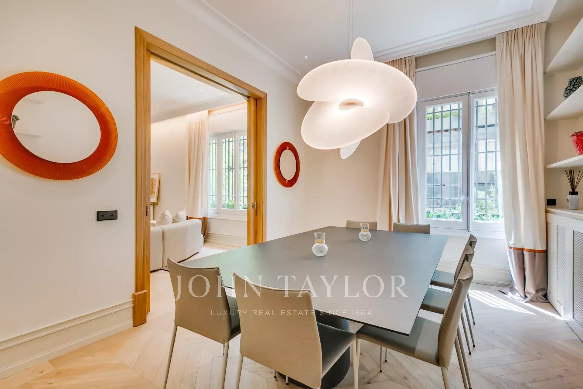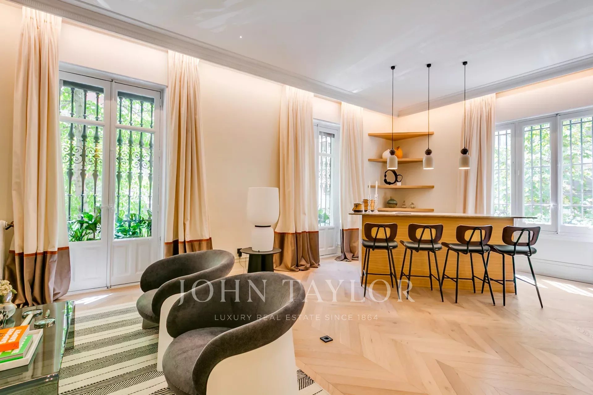 Num belo edifício do início do século XX, com uma fachada clássica e no coração do bairro de Salamanca, encontramos esta fabulosa propriedade renovada e mobilada junto à Golden Mile de Madrid. Está localizado num mezanino com quatro belas janelas para a rua e outras 10 janelas para um jardim privado da comunidade.