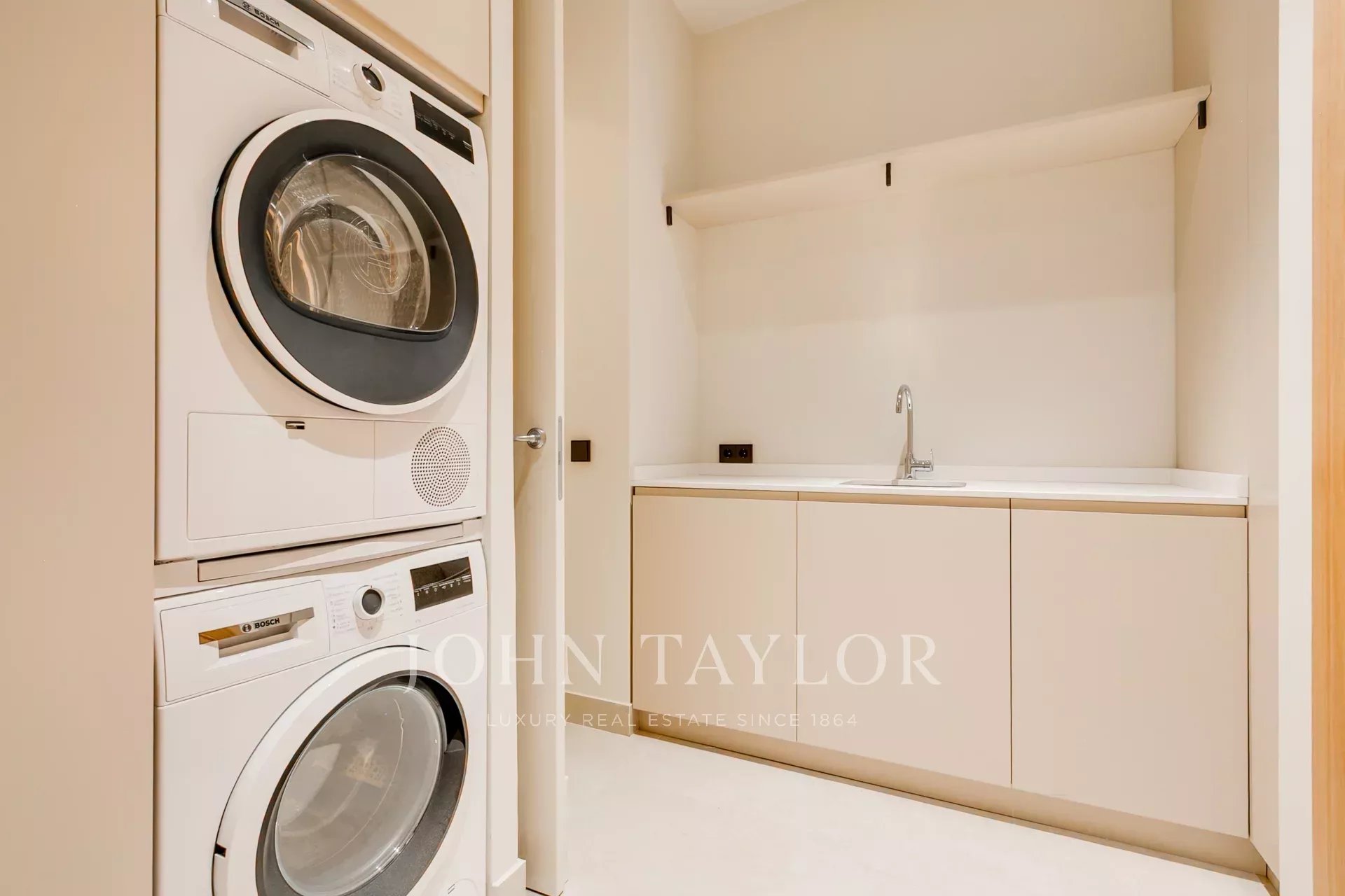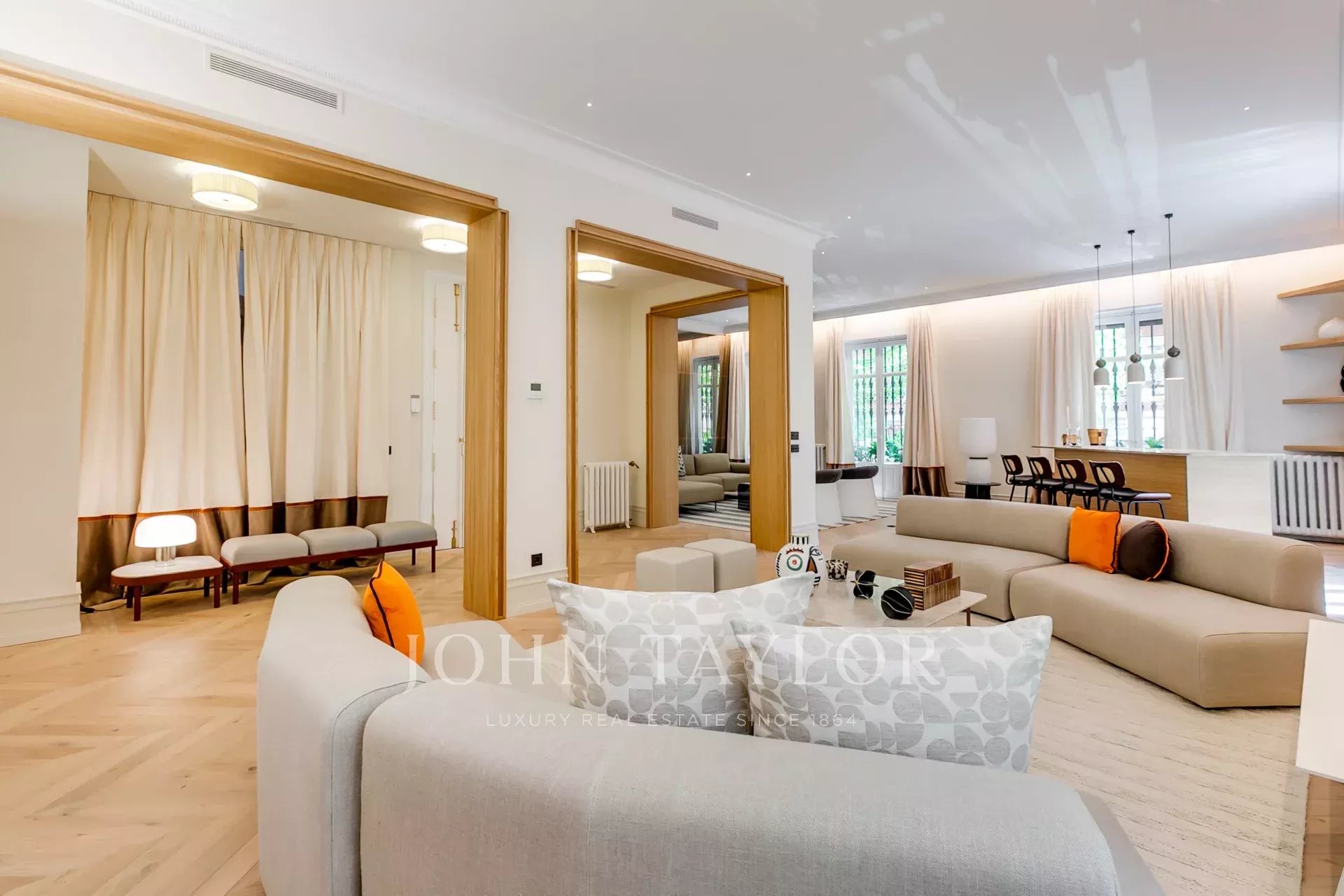 A zona privada inclui quatro quartos, todos com casa de banho privativa e vista para o jardim comum. O quarto principal oferece três bons espaços com uma zona de estar, uma zona de cama e um grande quarto de vestir e casa de banho.