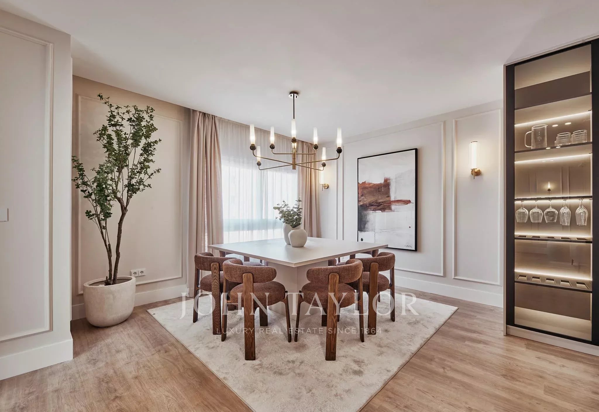 Habitação exterior exclusiva de 253 m² situada numa sexta andar no coração de Castellana, uma das zonas mais prestigiadas do bairro de Salamanca. Reformada com uma abordagem contemporânea, destaca-se pela sua amplitude, luminosidade e elegante distribuição.