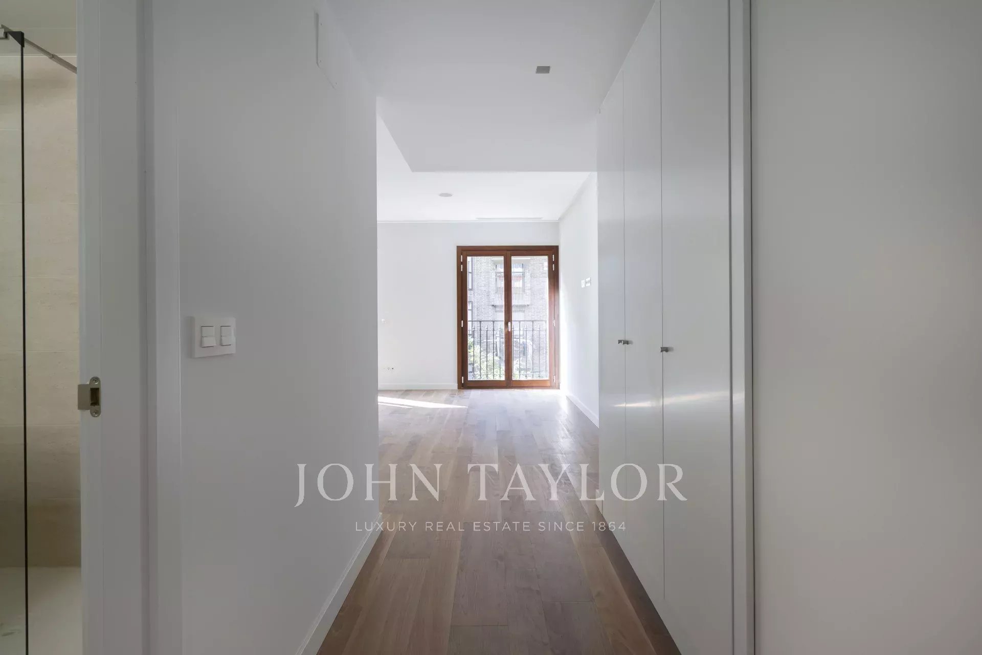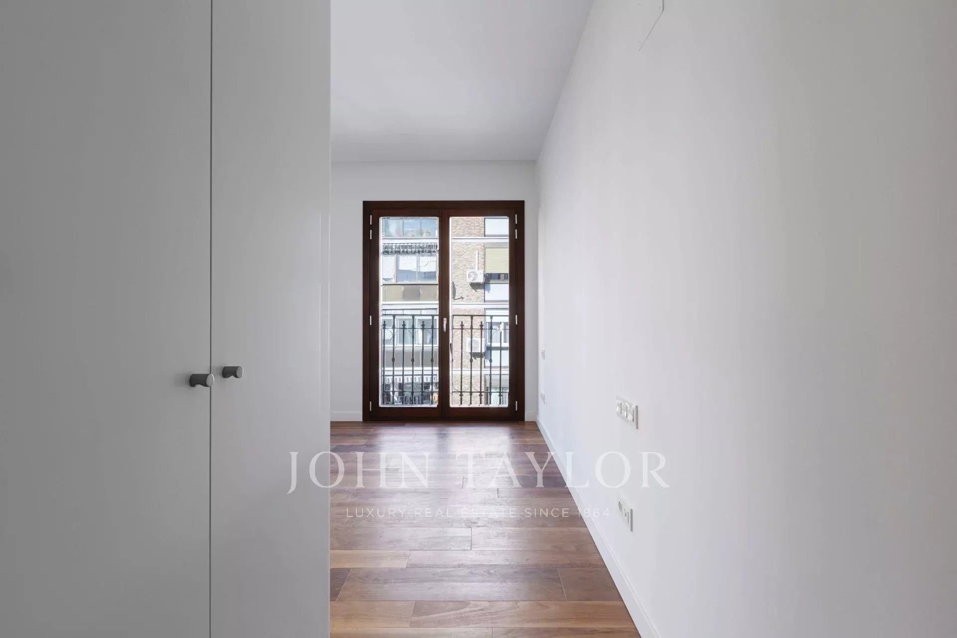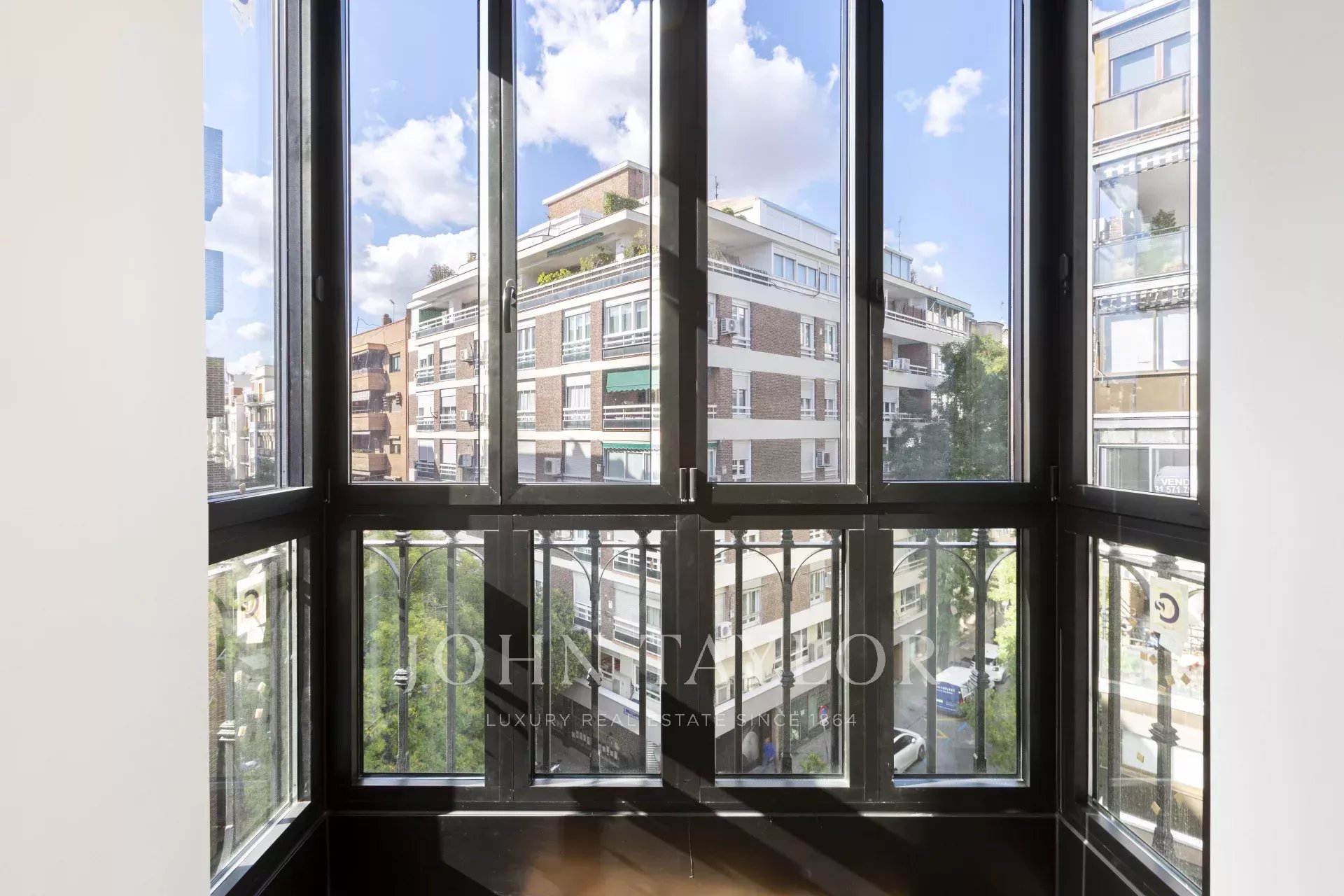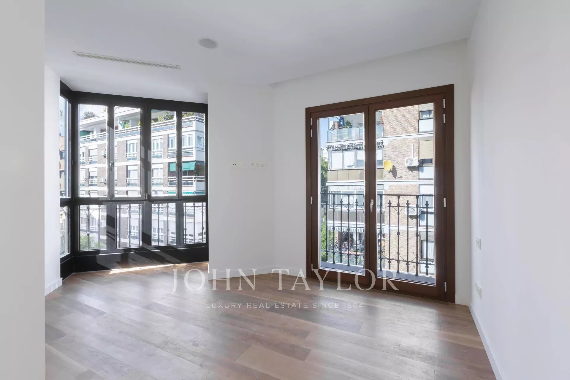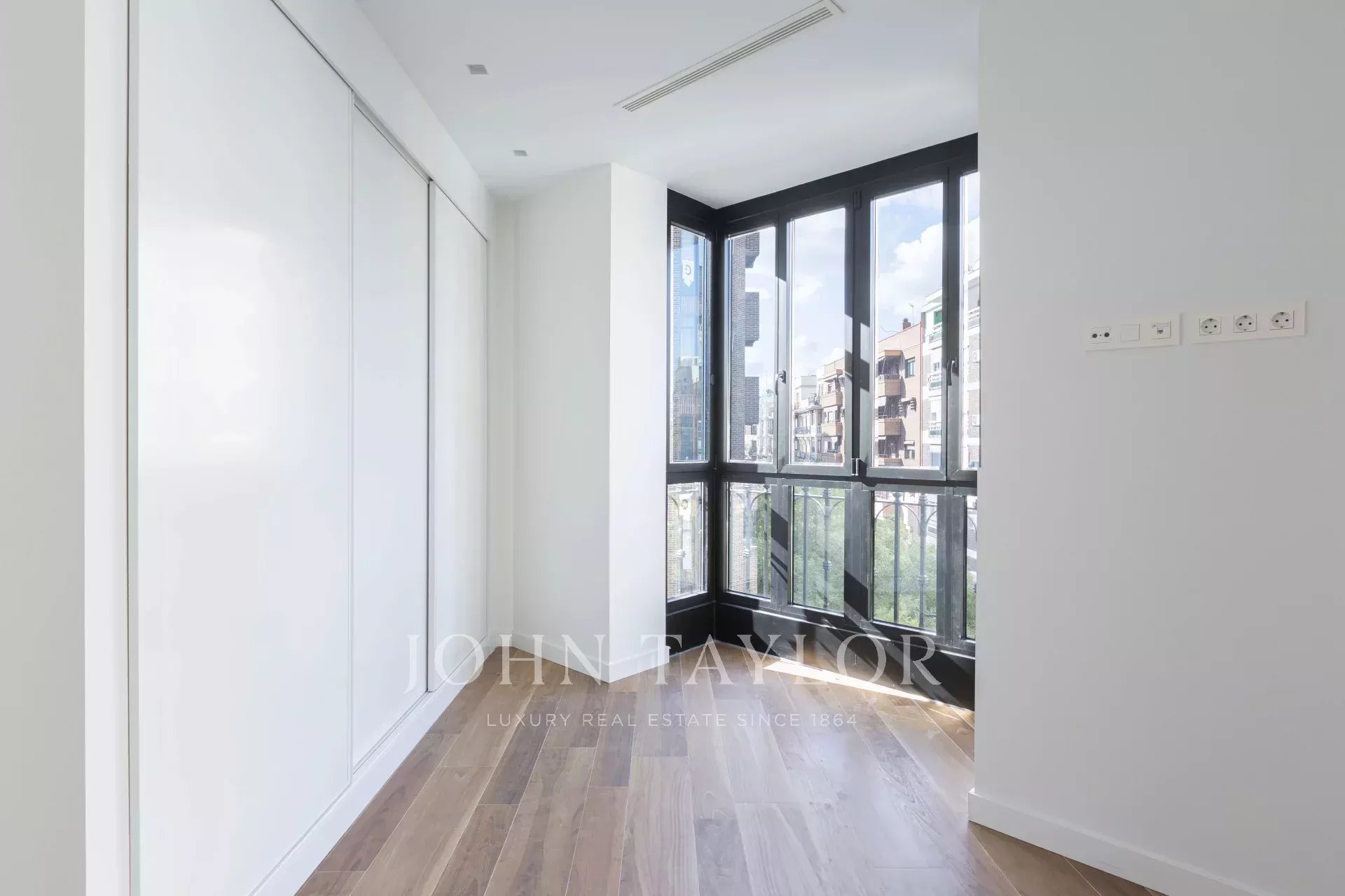 Num dos poucos edifícios novos do Barrio de Salamanca, encontramos este fabuloso apartamento novo. Com cinco varandas com vista para a rua e ocupando a esquina do quarto andar do edifício, o apartamento goza de uma luminosidade e de uma amplitude fantásticas.