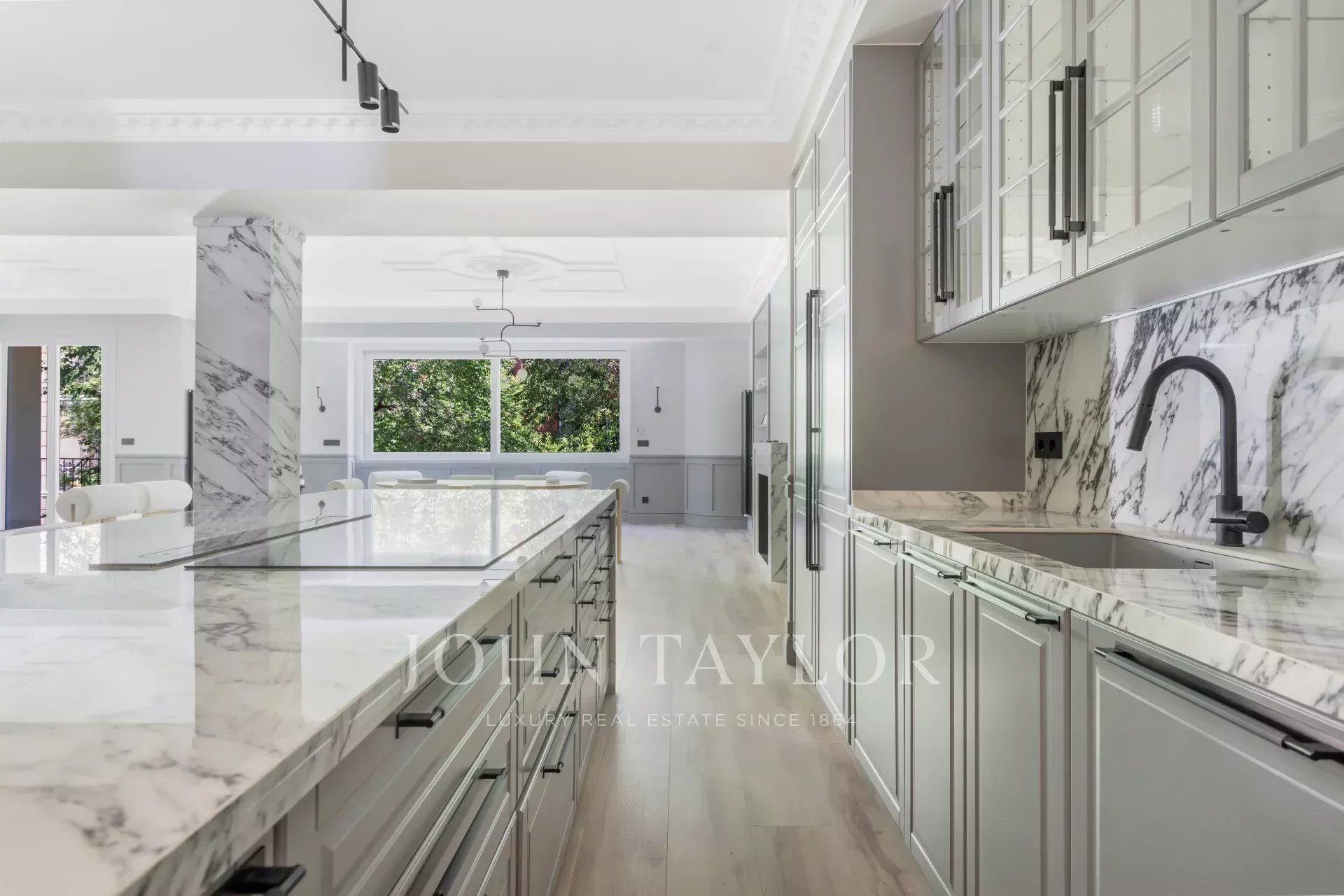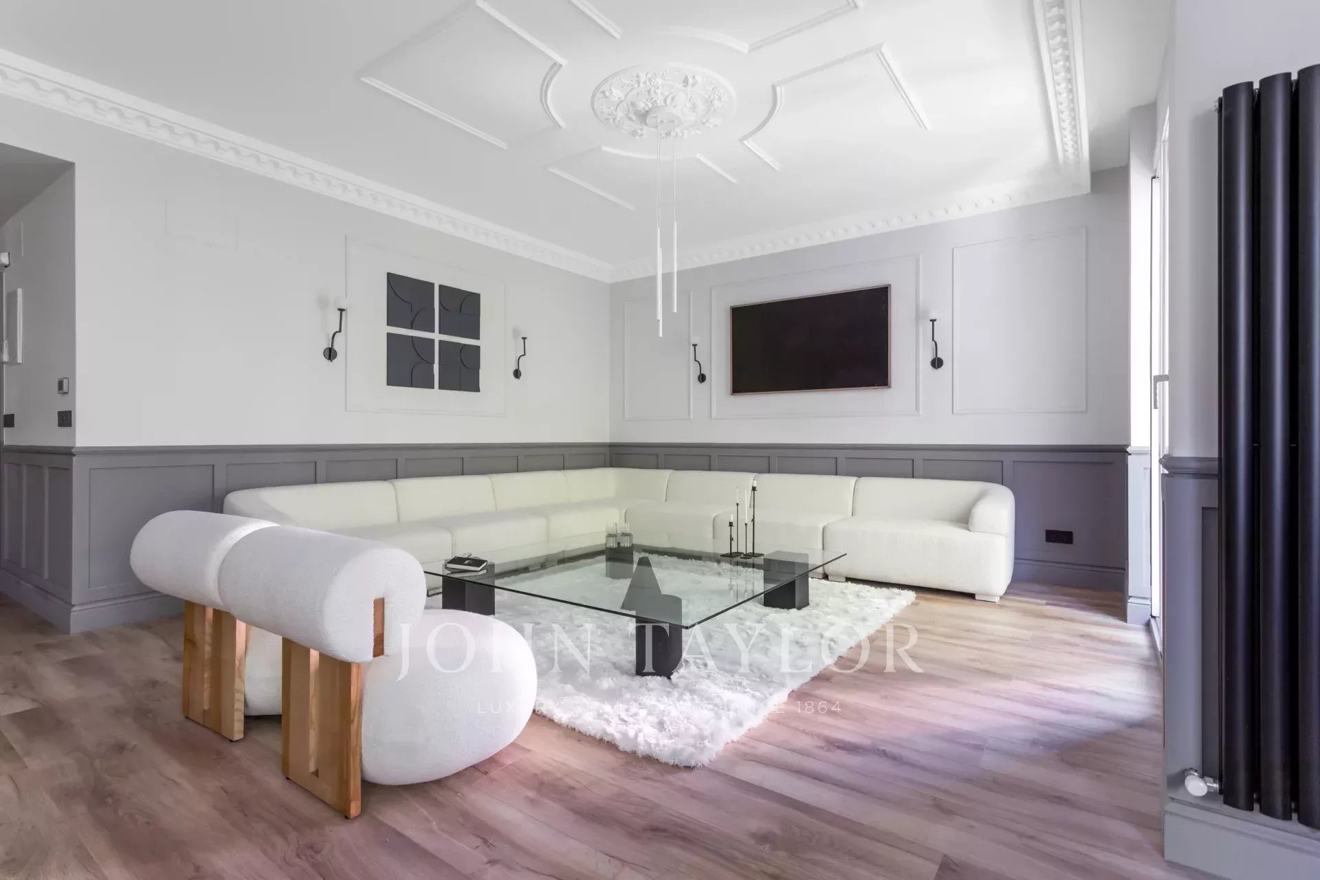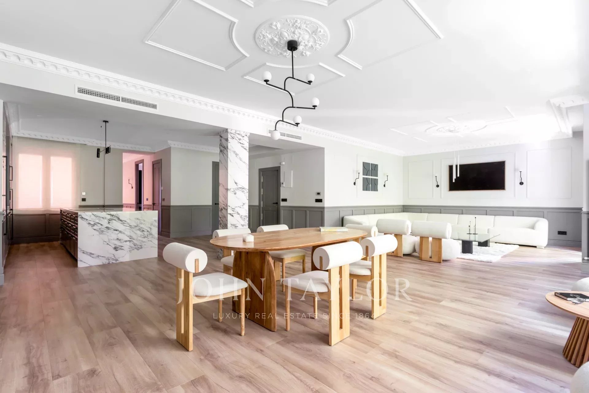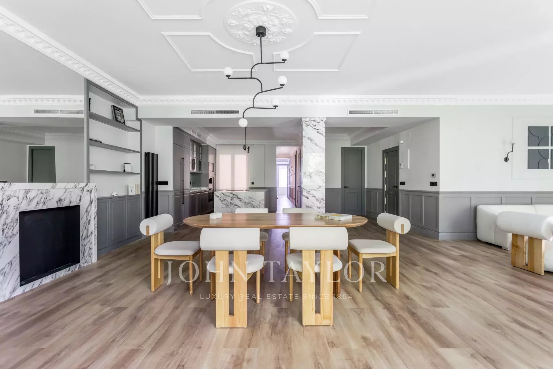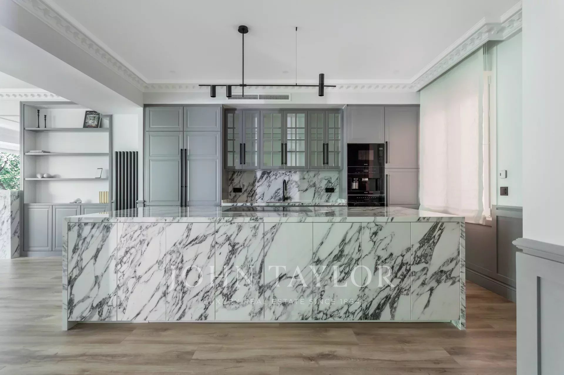 A grande sala de estar e jantar, com várias divisões, goza de uma agradável luz natural graças às suas grandes janelas. Aberta para a sala de estar encontramos a cozinha espaçosa com a sua grande ilha central e equipada com electrodomésticos topo de gama.