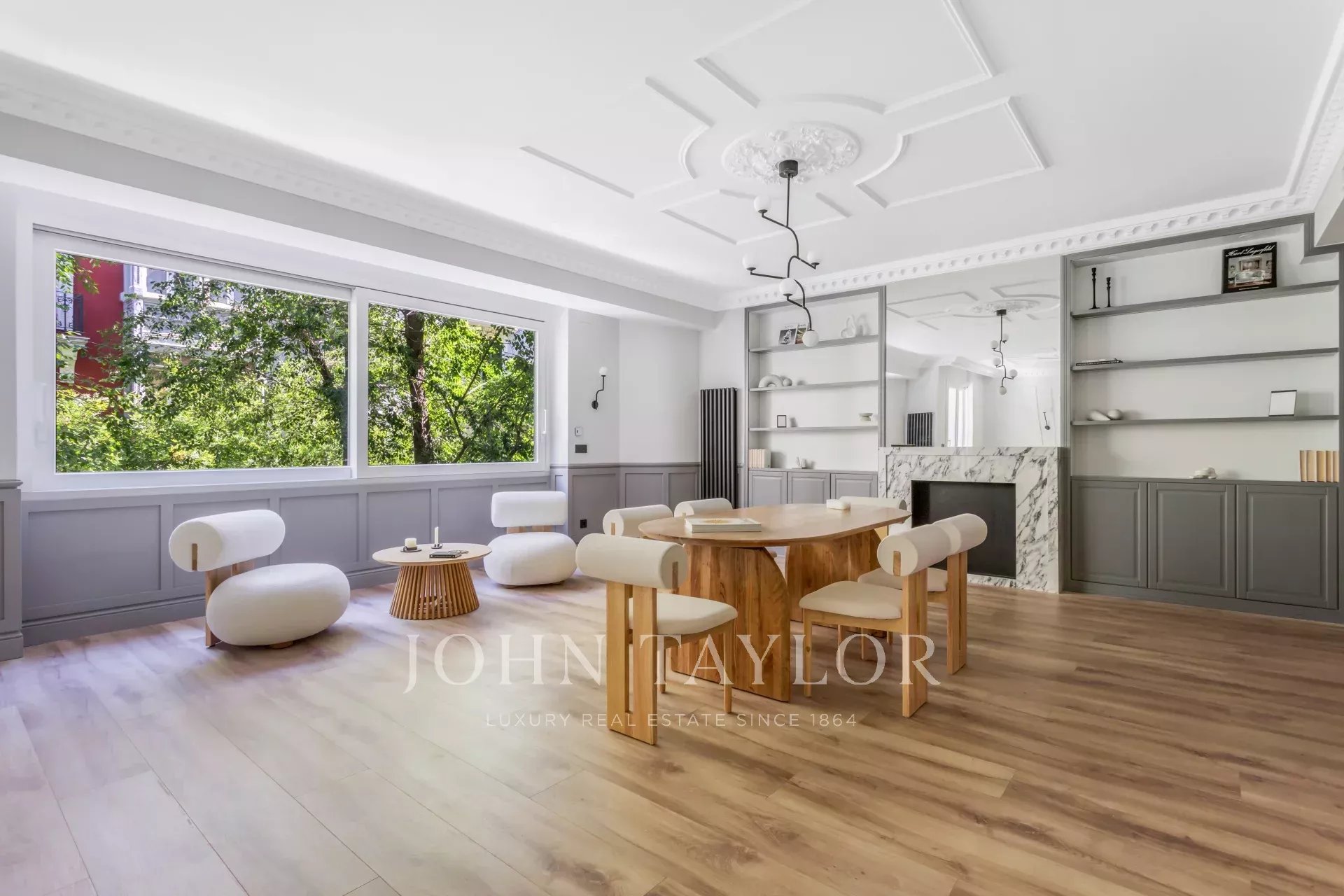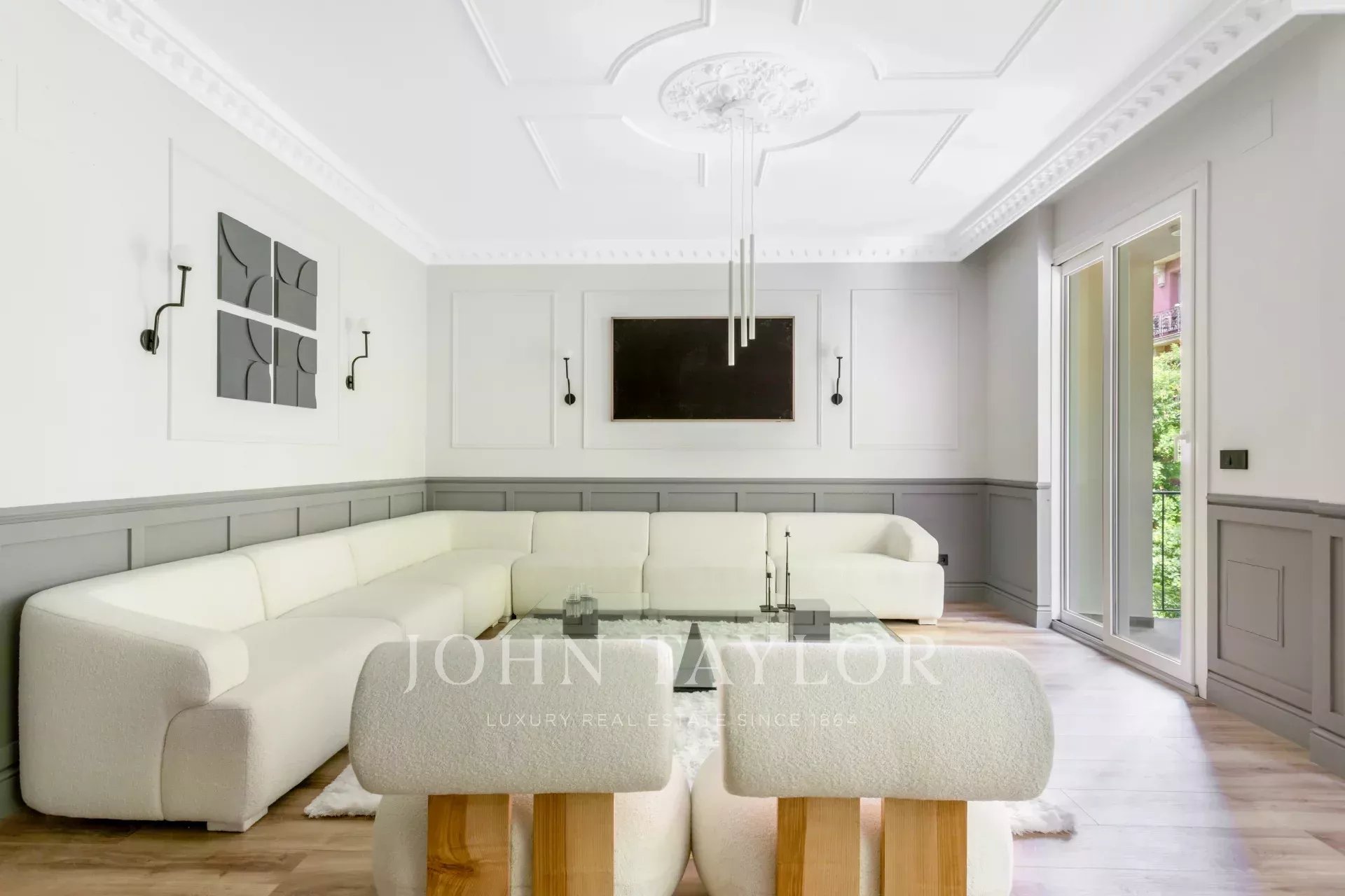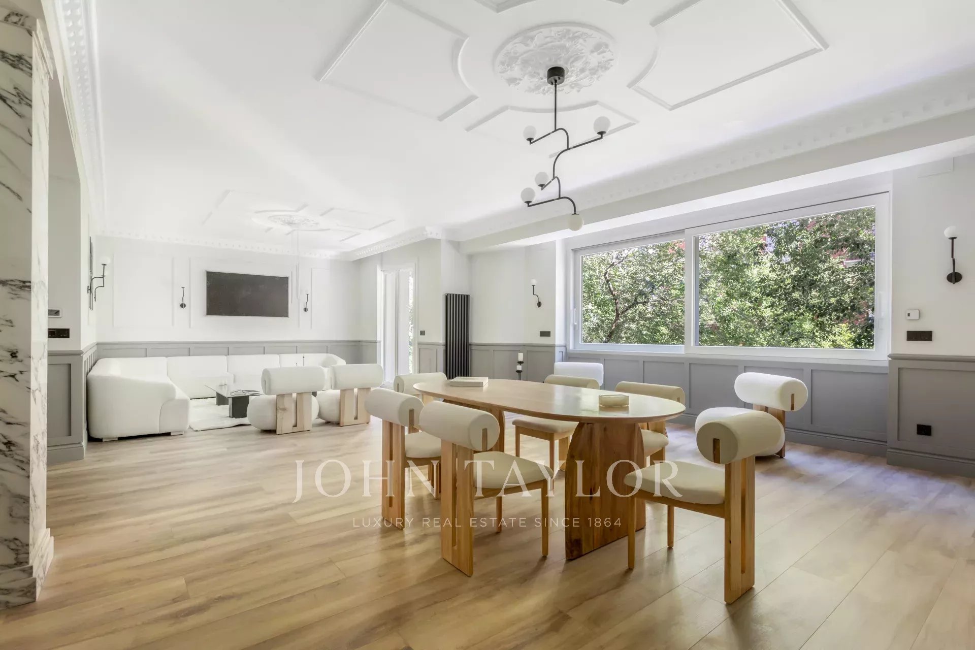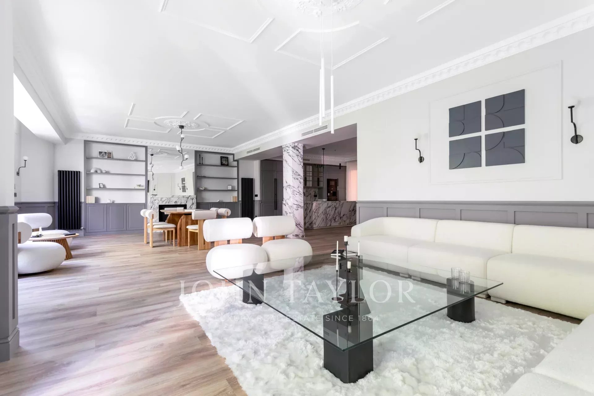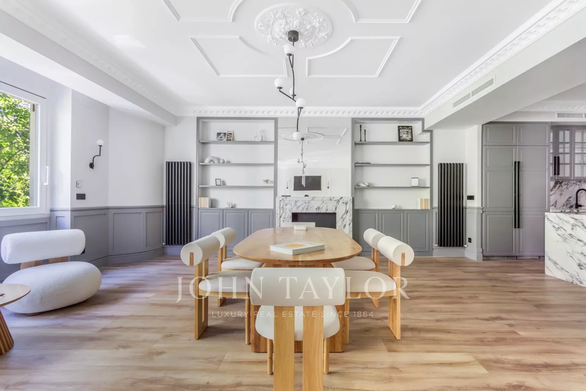 A grande sala de estar e jantar, com várias divisões, goza de uma agradável luz natural graças às suas grandes janelas. Aberta para a sala de estar encontramos a cozinha espaçosa com a sua grande ilha central e equipada com electrodomésticos topo de gama.