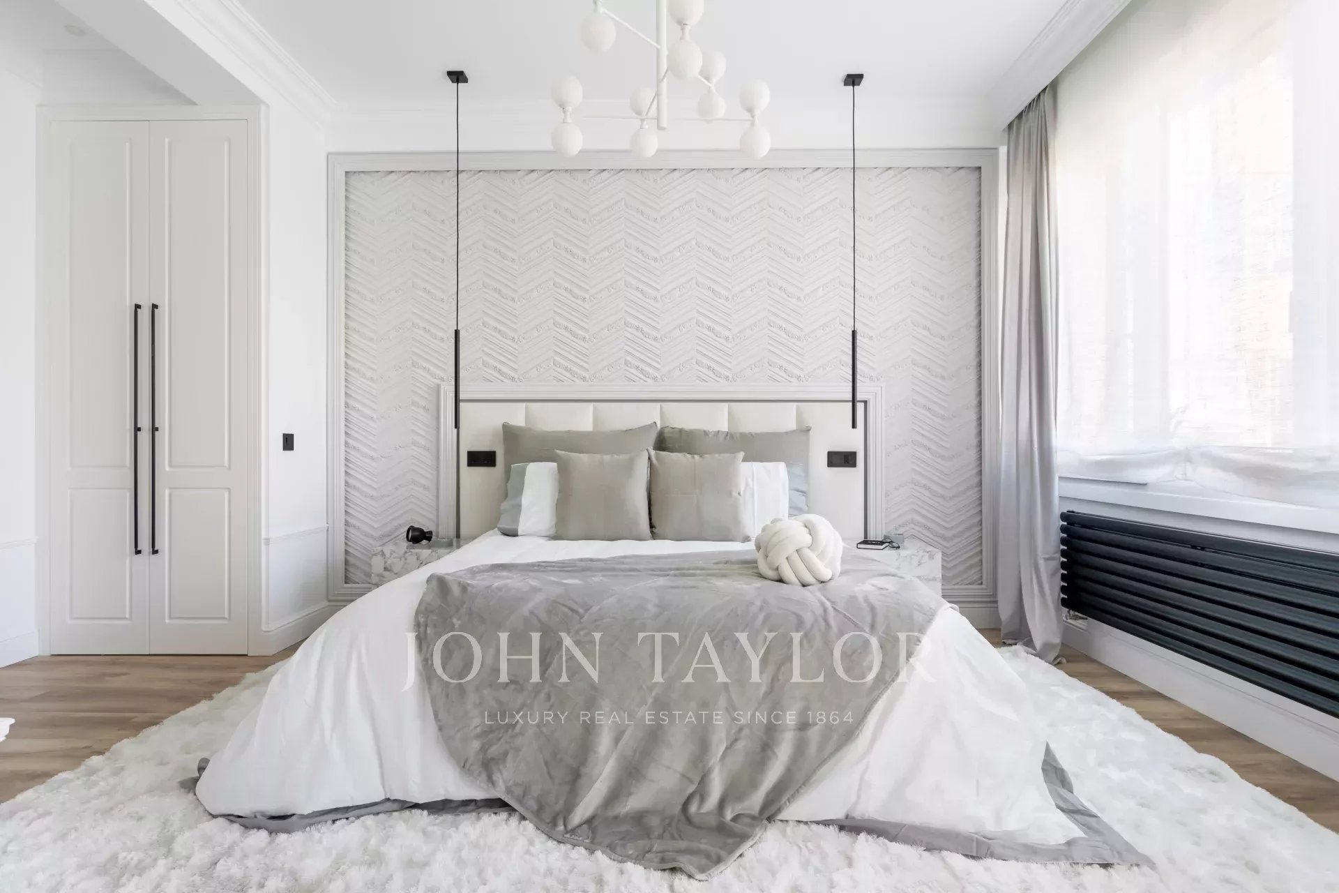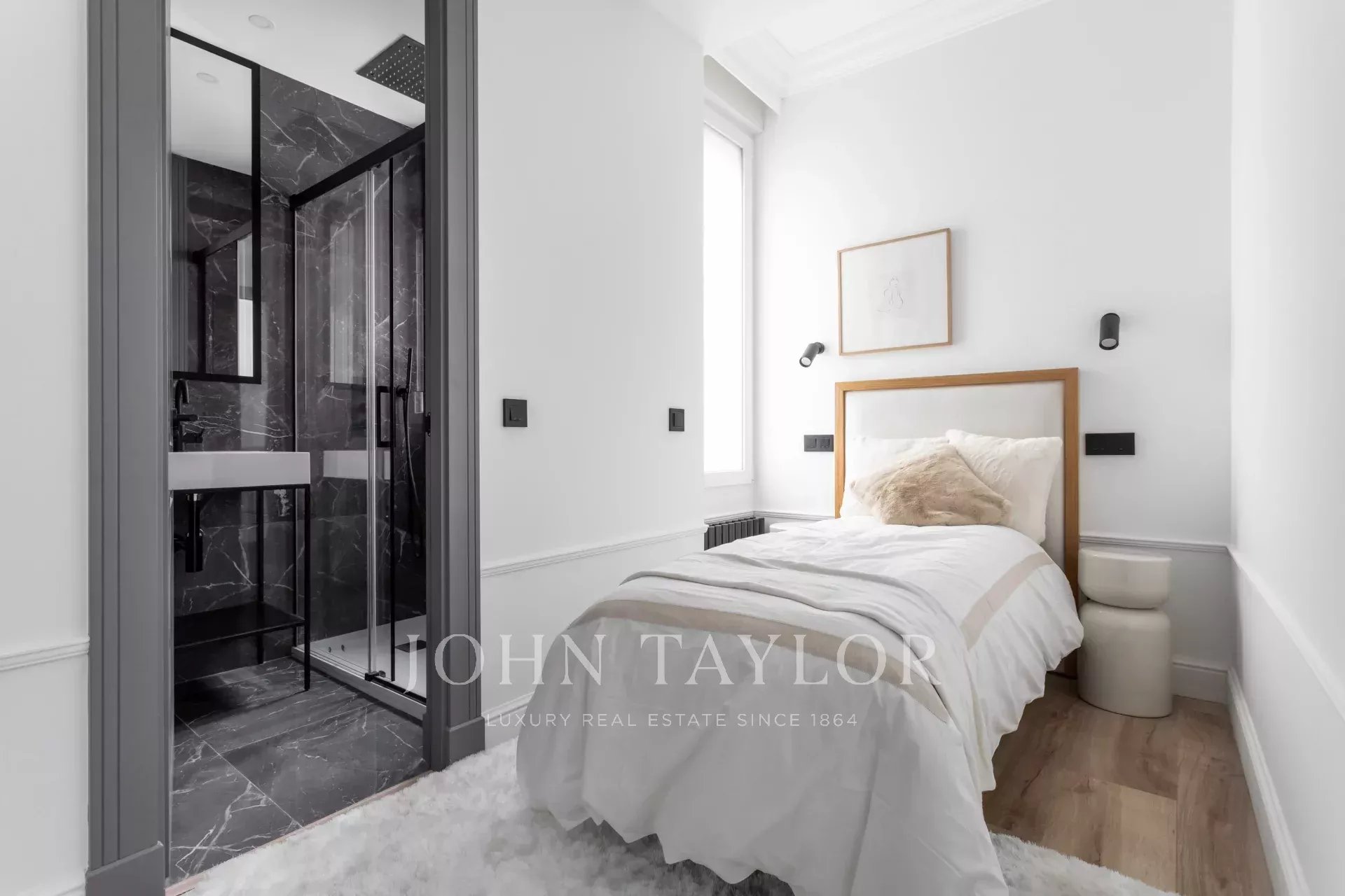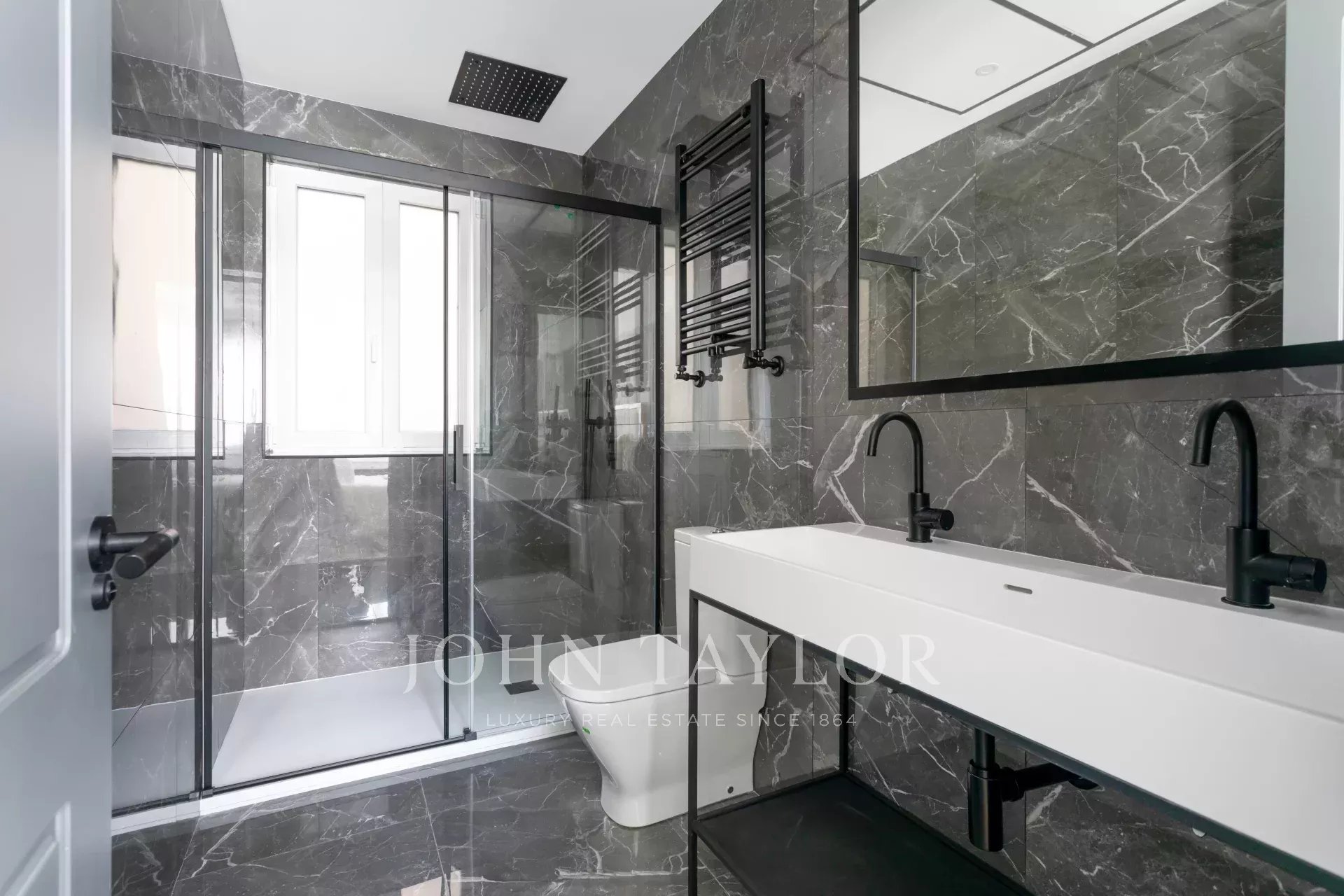O apartamento tem quatro quartos, todos com casa de banho privativa e grandes roupeiros embutidos. Além disso, há uma casa de banho para hóspedes, uma área de lavandaria e uma arrecadação.