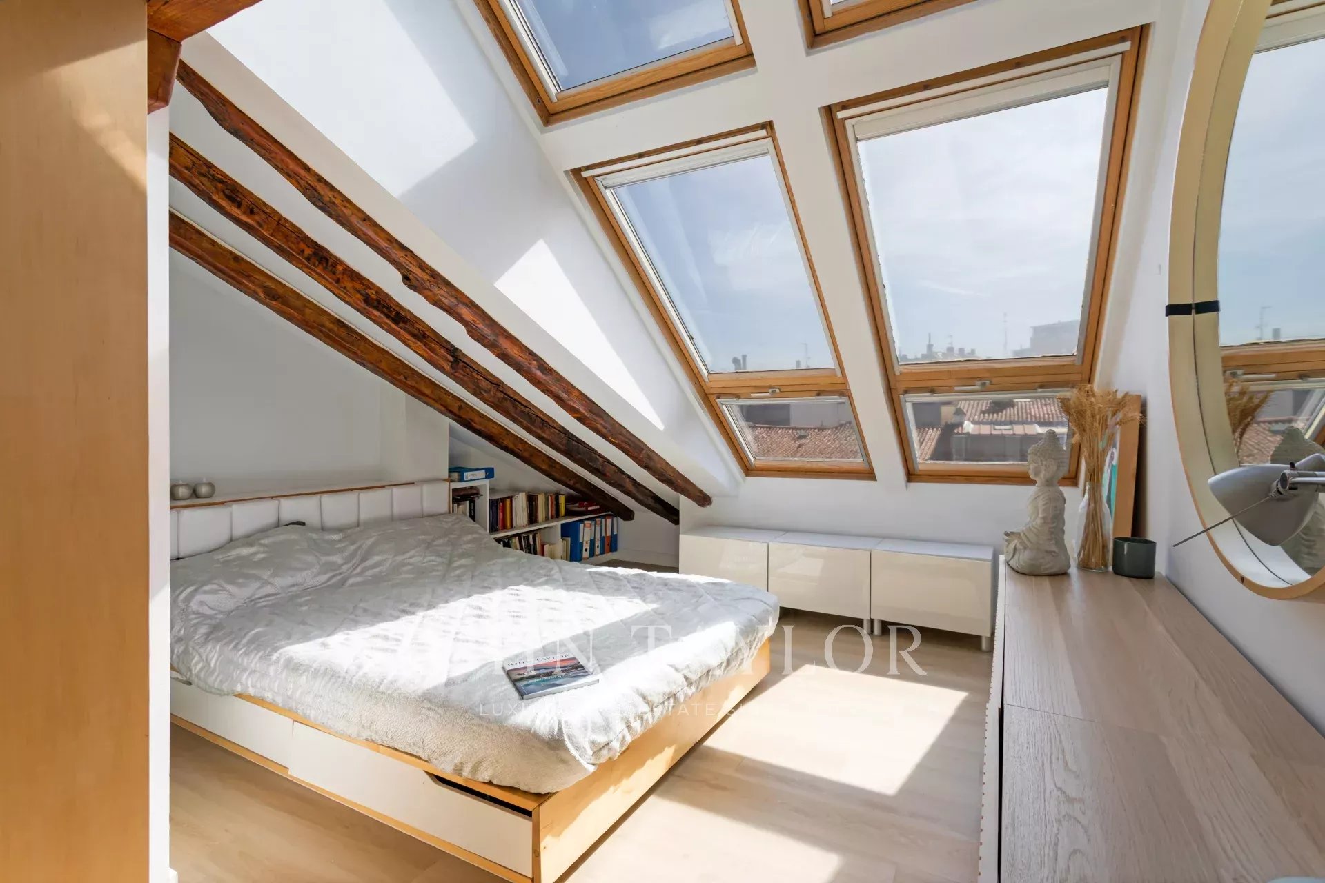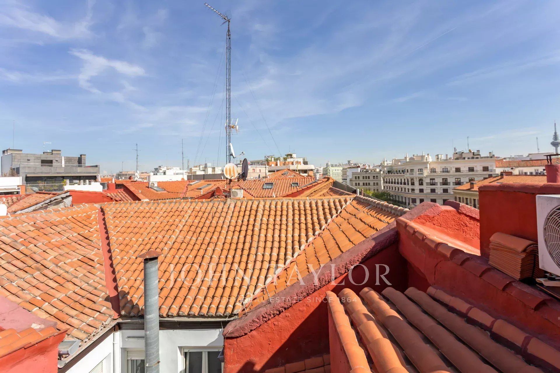 A sala e o quarto têm janelas de sótão com vista para a rua Alcalá, de onde se podem admirar belos edifícios clássicos e parte do Parque do Retiro. Esta é uma penthouse para os amantes do sol e da luz natural.