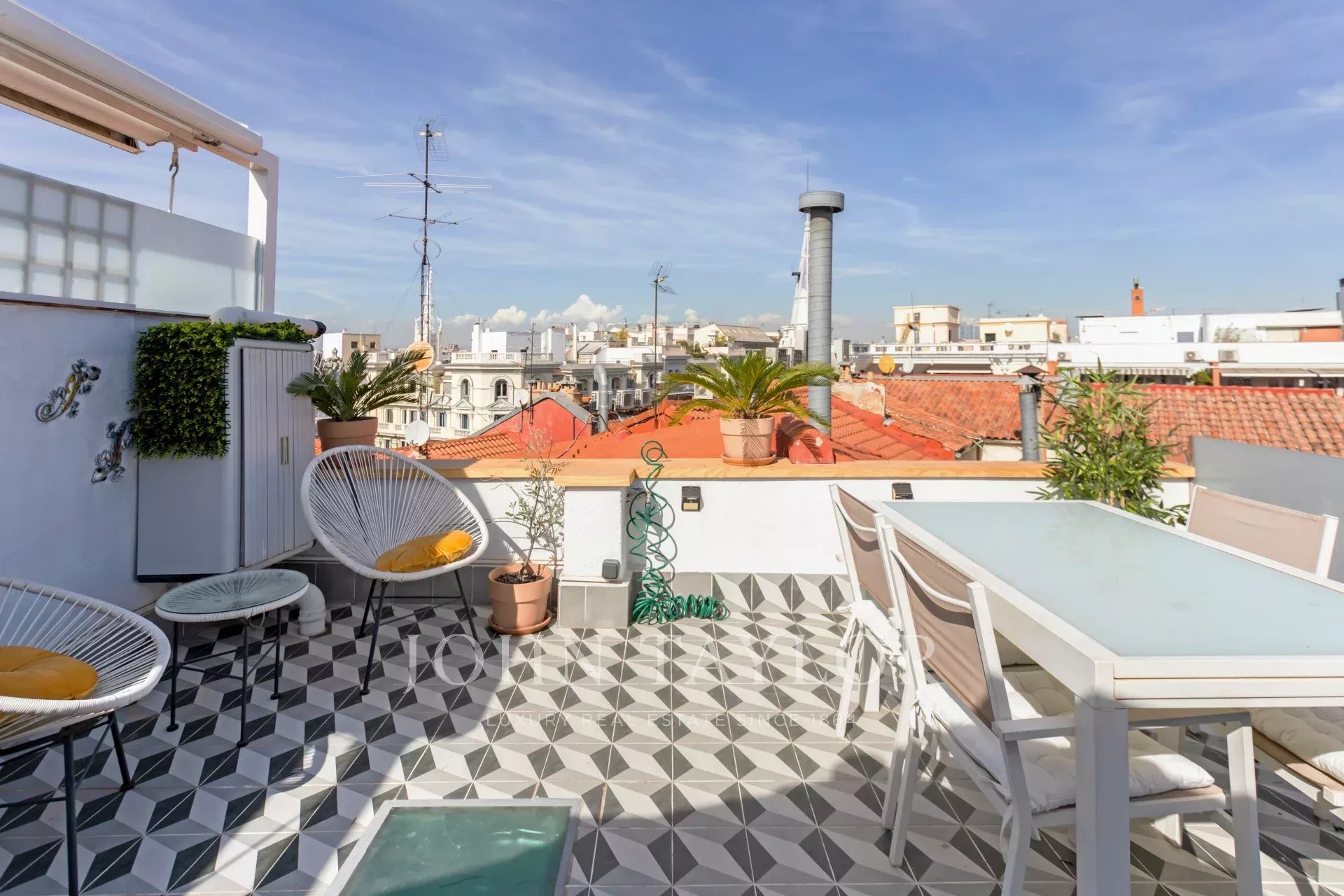 Apresentamos em exclusivo esta penthouse única com terraço e vista para as cúpulas e telhados mais emblemáticos do bairro de Salamanca, a apenas um minuto a pé do Parque do Retiro.
