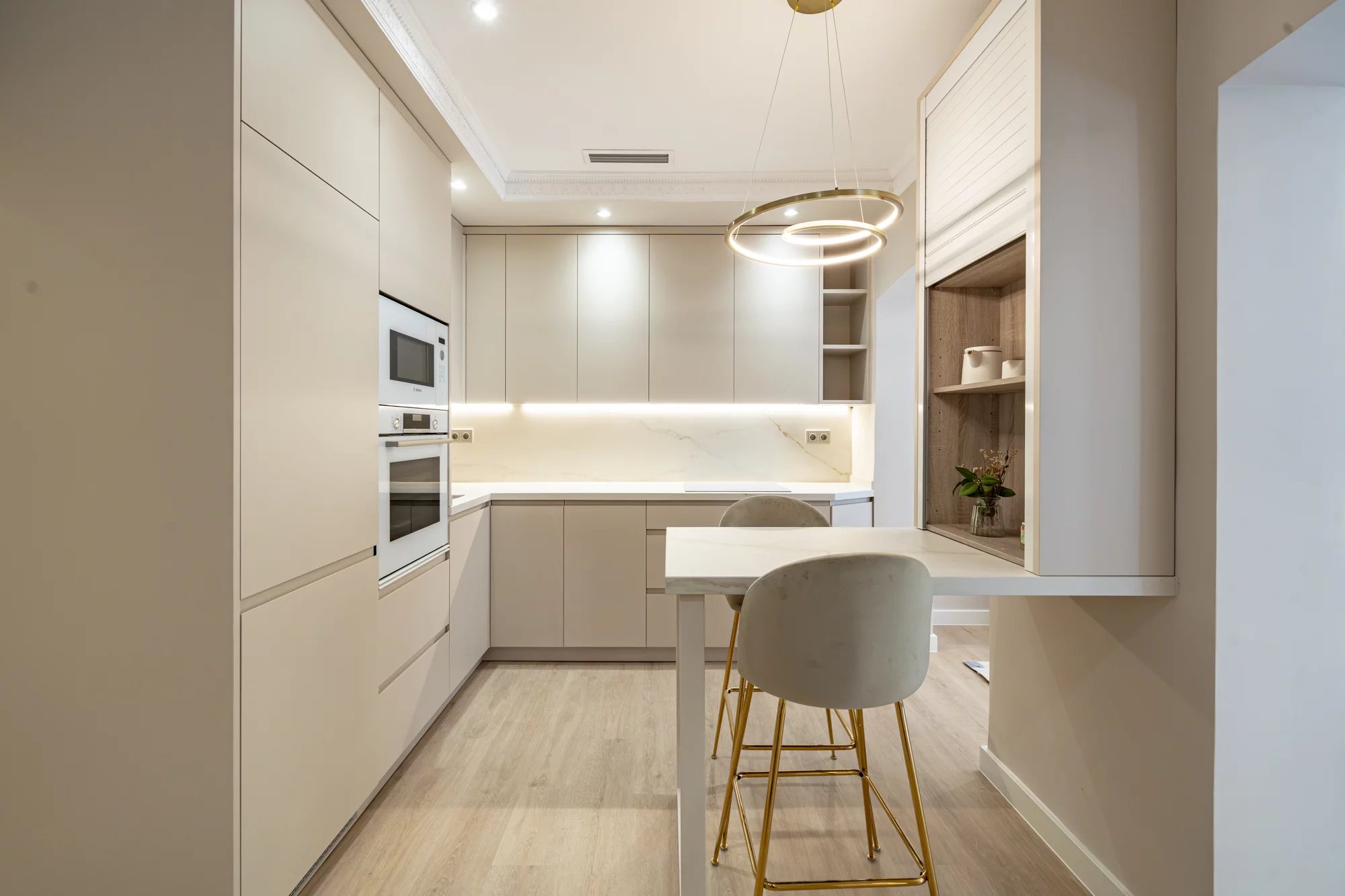 A cozinha, com um design moderno, está totalmente equipada com electrodomésticos de marcas de topo e dispõe ainda de uma lavandaria independente, proporcionando conforto e organização ao espaço.
