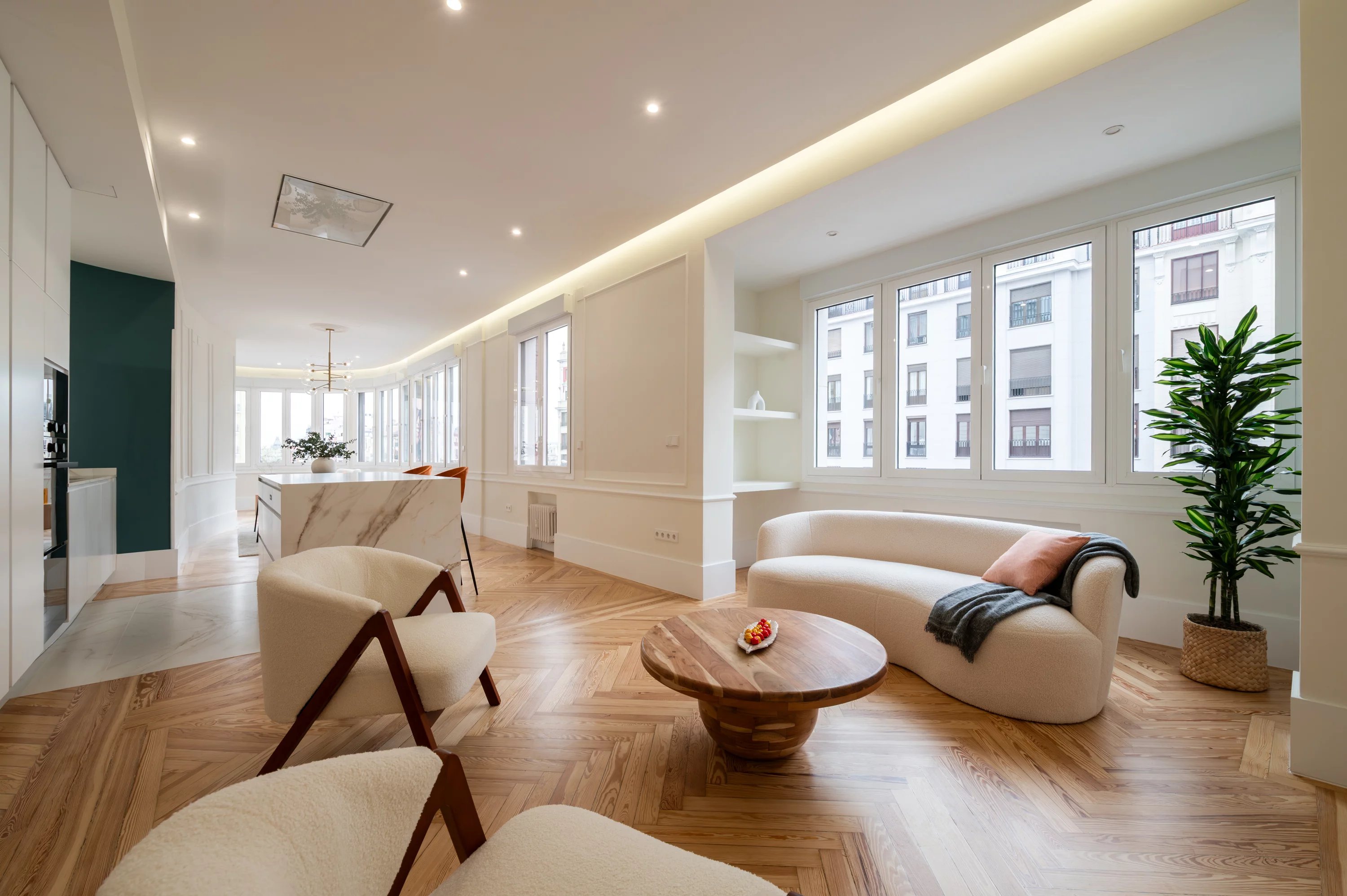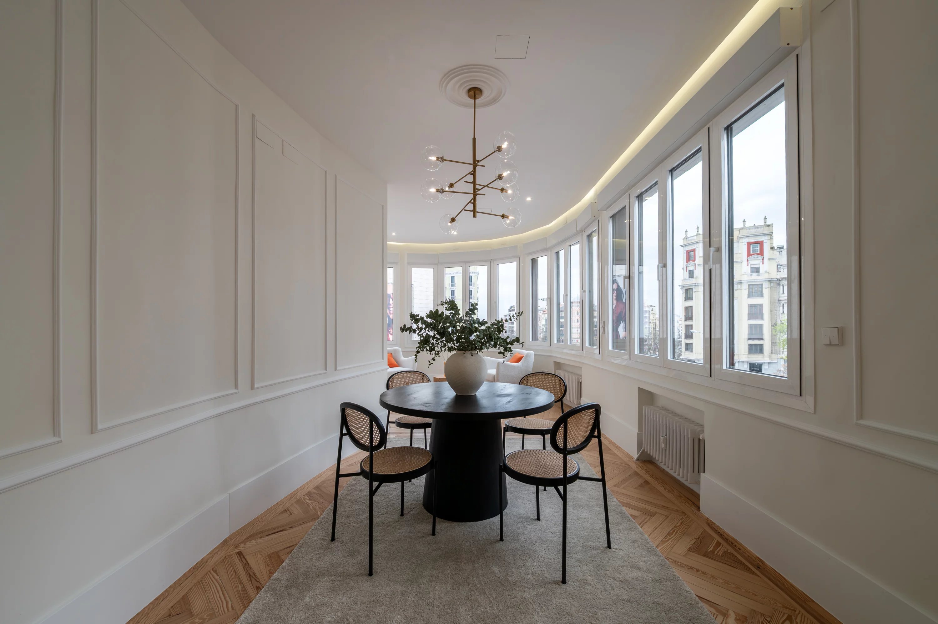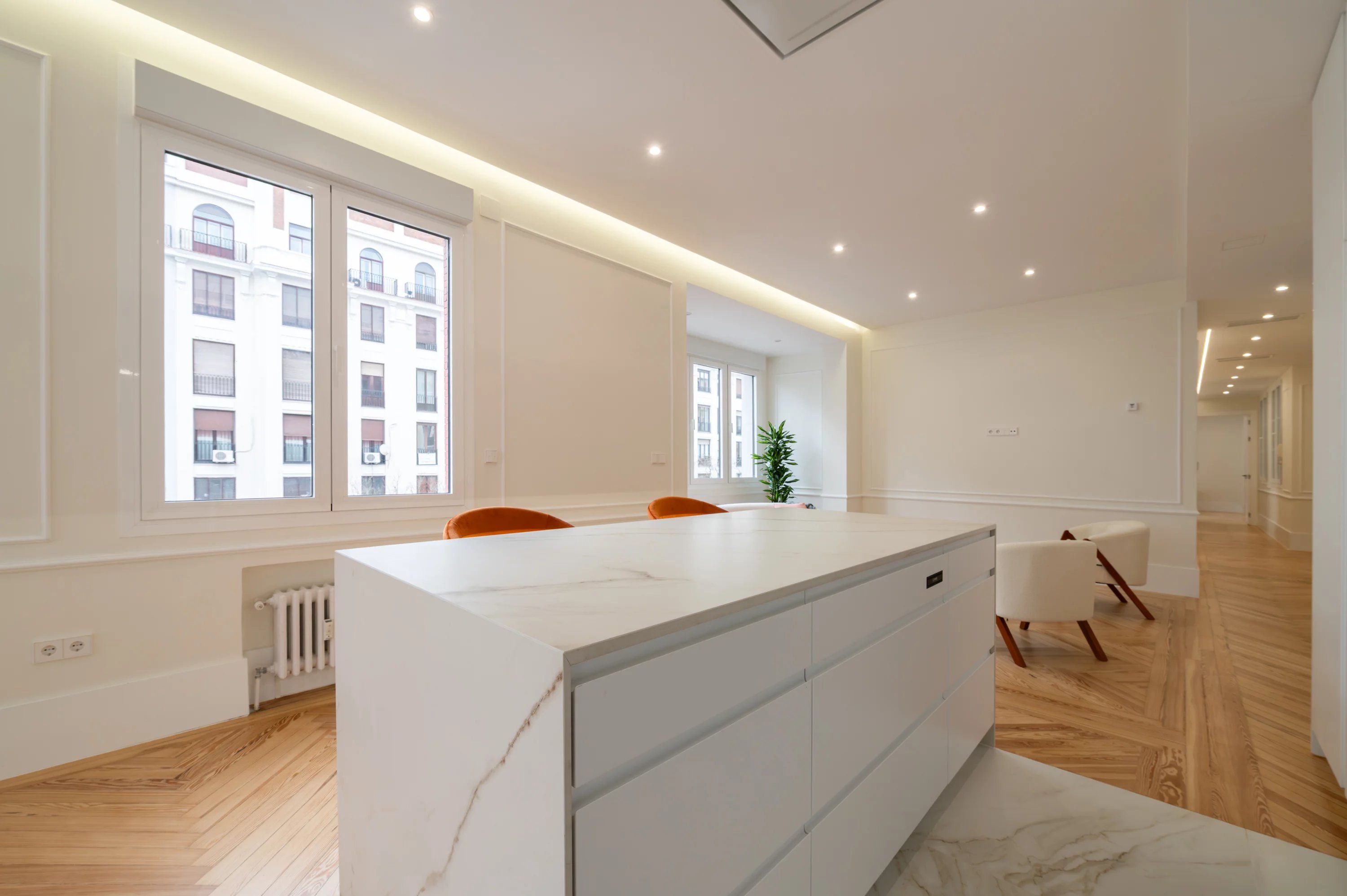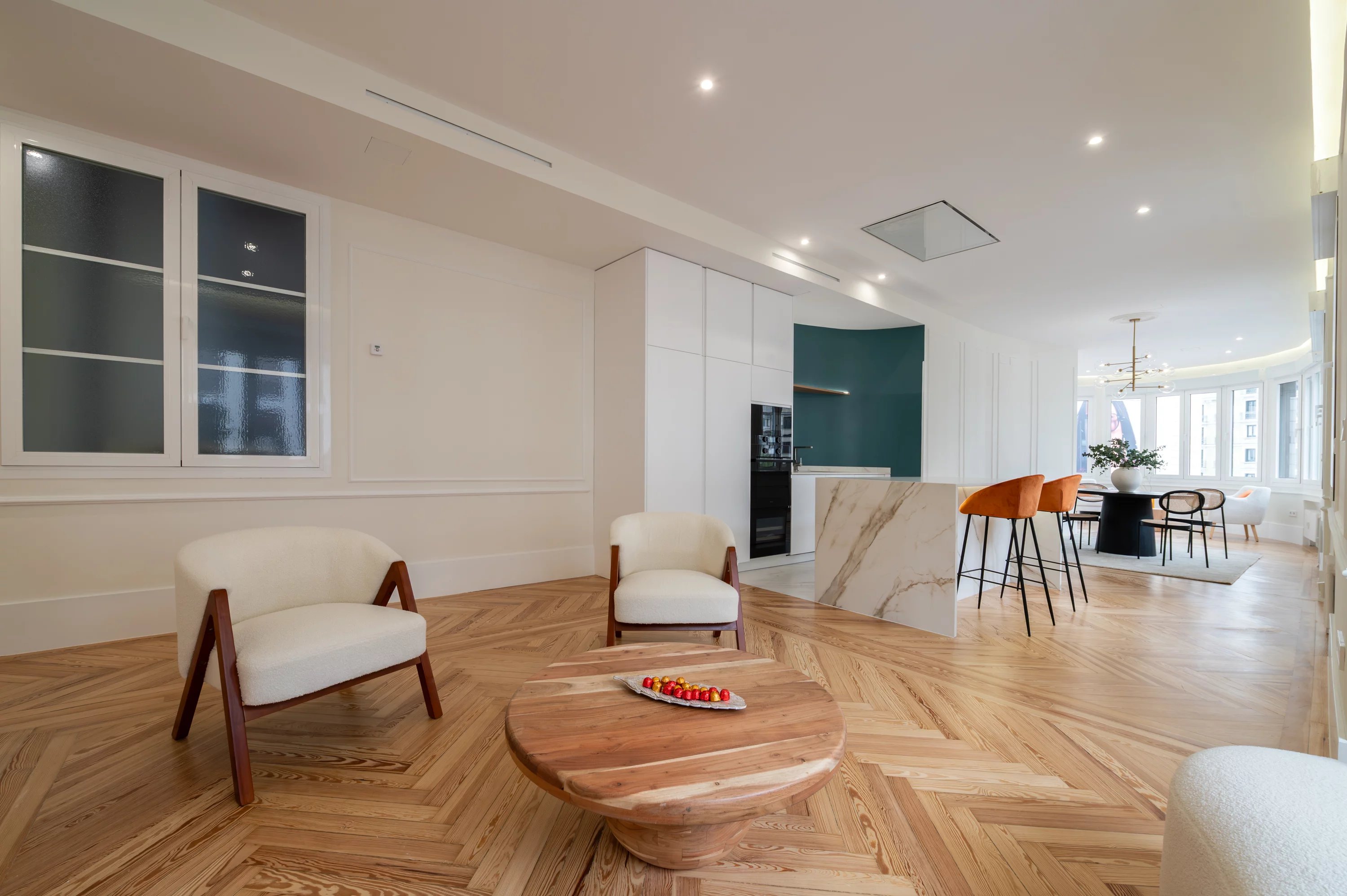 A sala principal, espaçosa e luminosa, torna-se o local ideal para desfrutar das vistas urbanas e do dinamismo de Madrid, enquanto a cozinha, completamente equipada, oferece um espaço prático e elegante para o dia a dia.