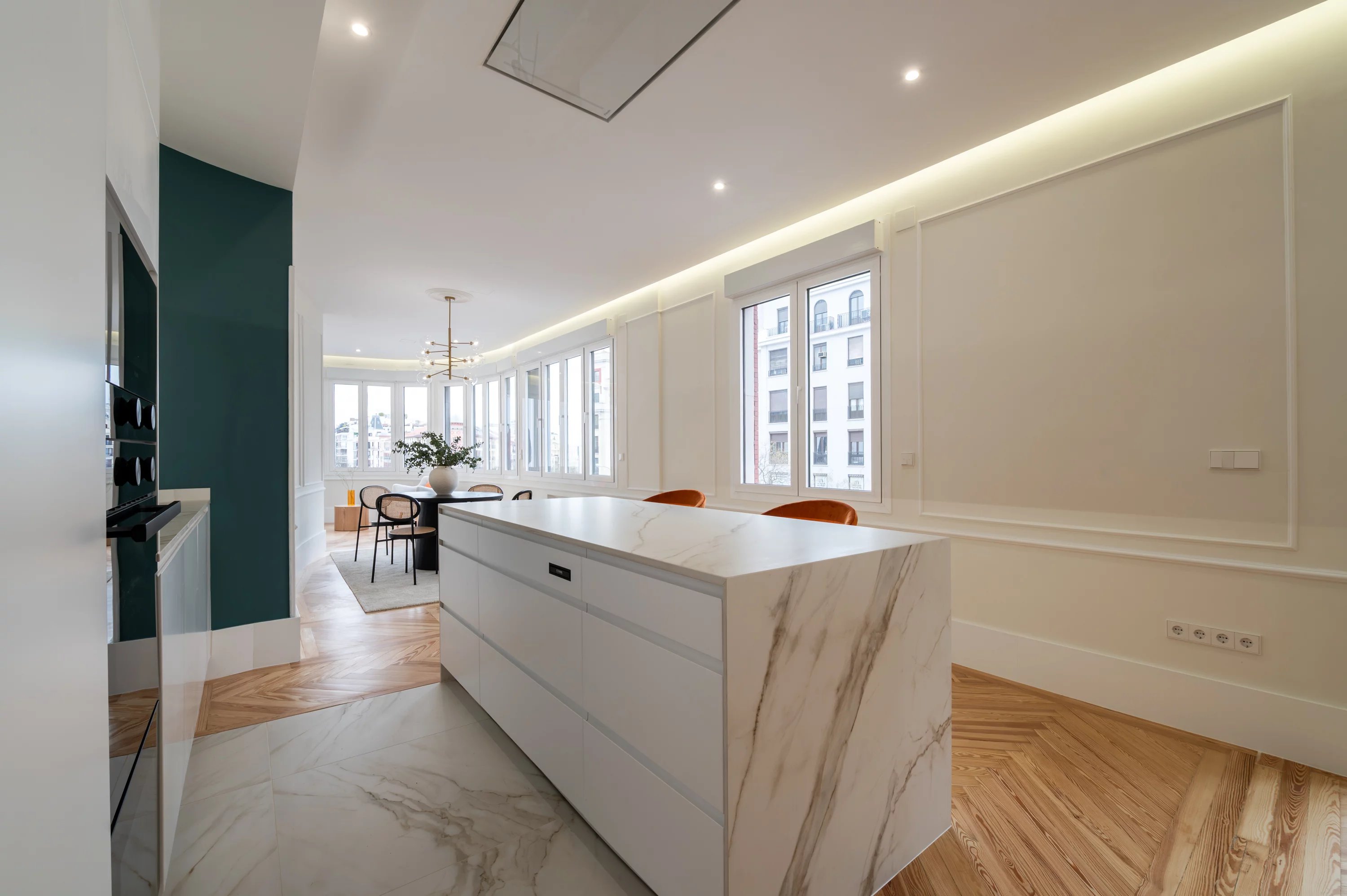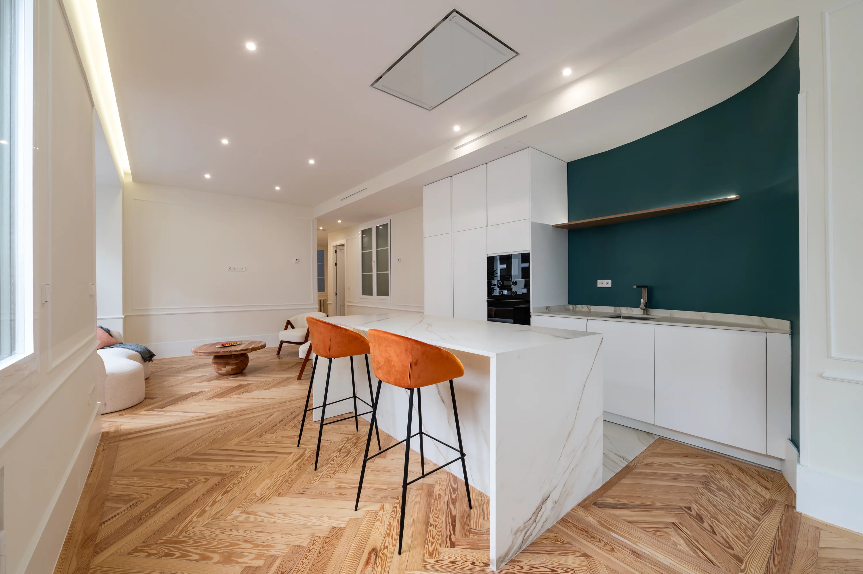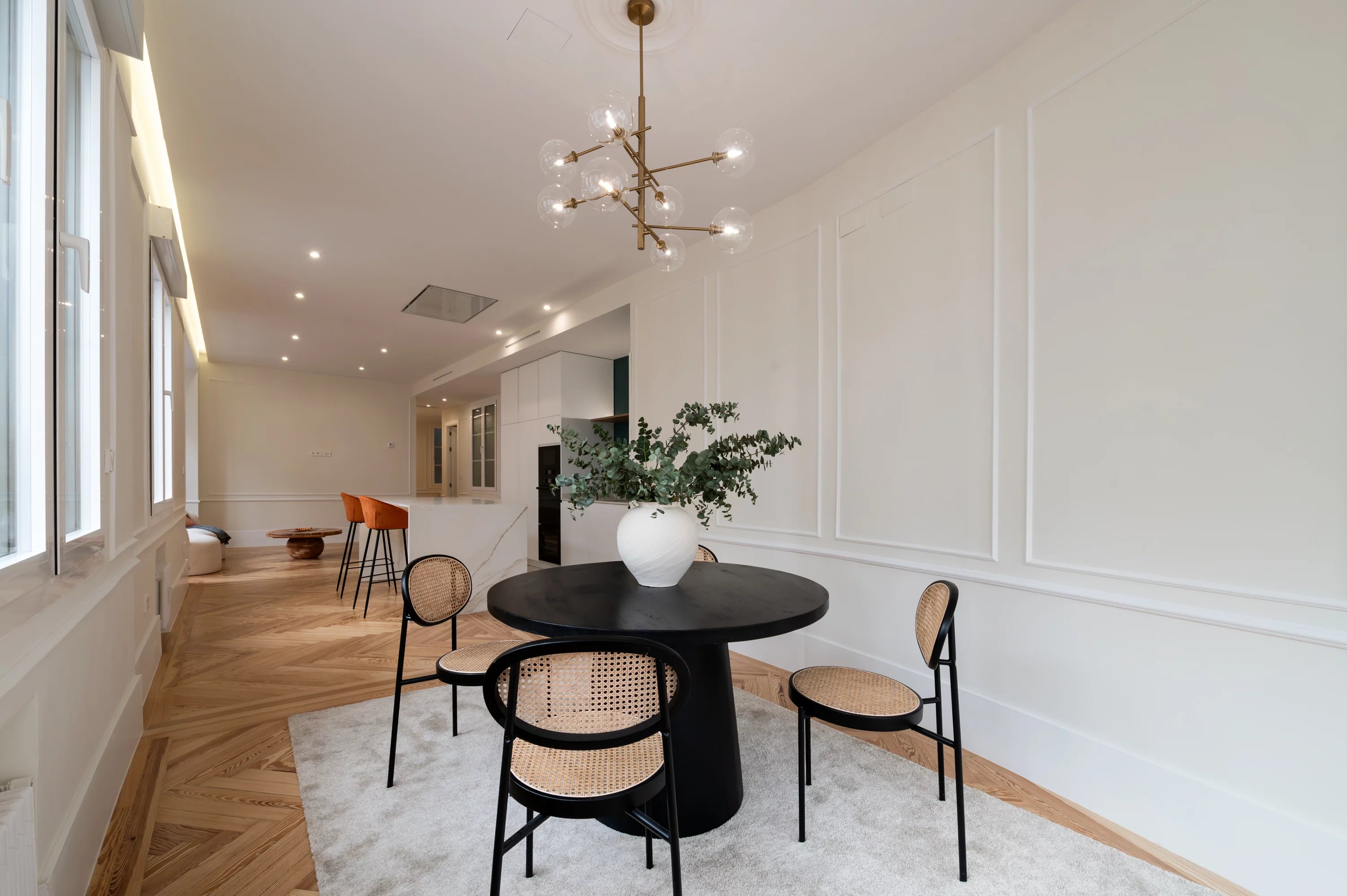 A sala principal, espaçosa e luminosa, torna-se o local ideal para desfrutar das vistas urbanas e do dinamismo de Madrid, enquanto a cozinha, completamente equipada, oferece um espaço prático e elegante para o dia a dia.