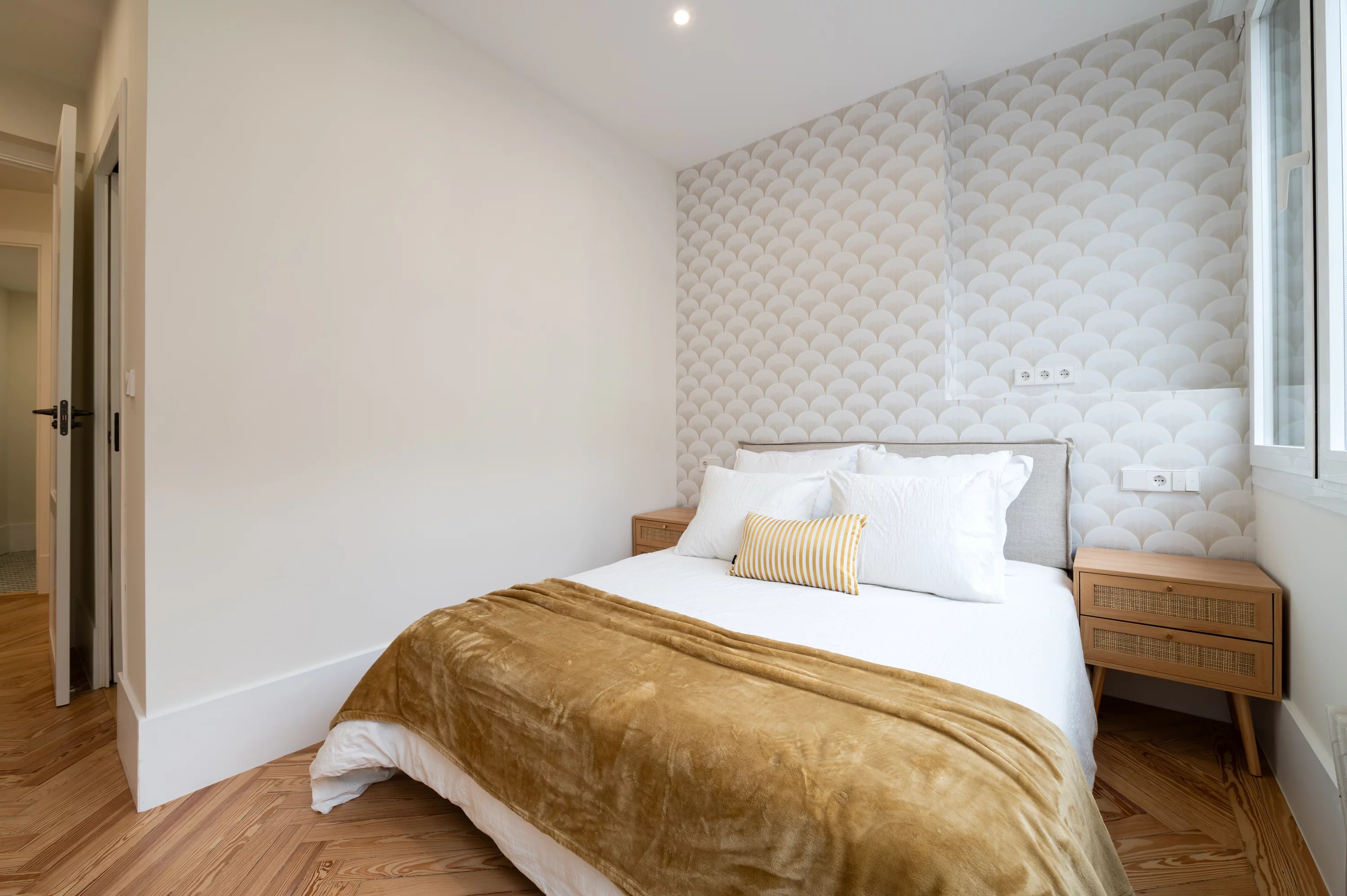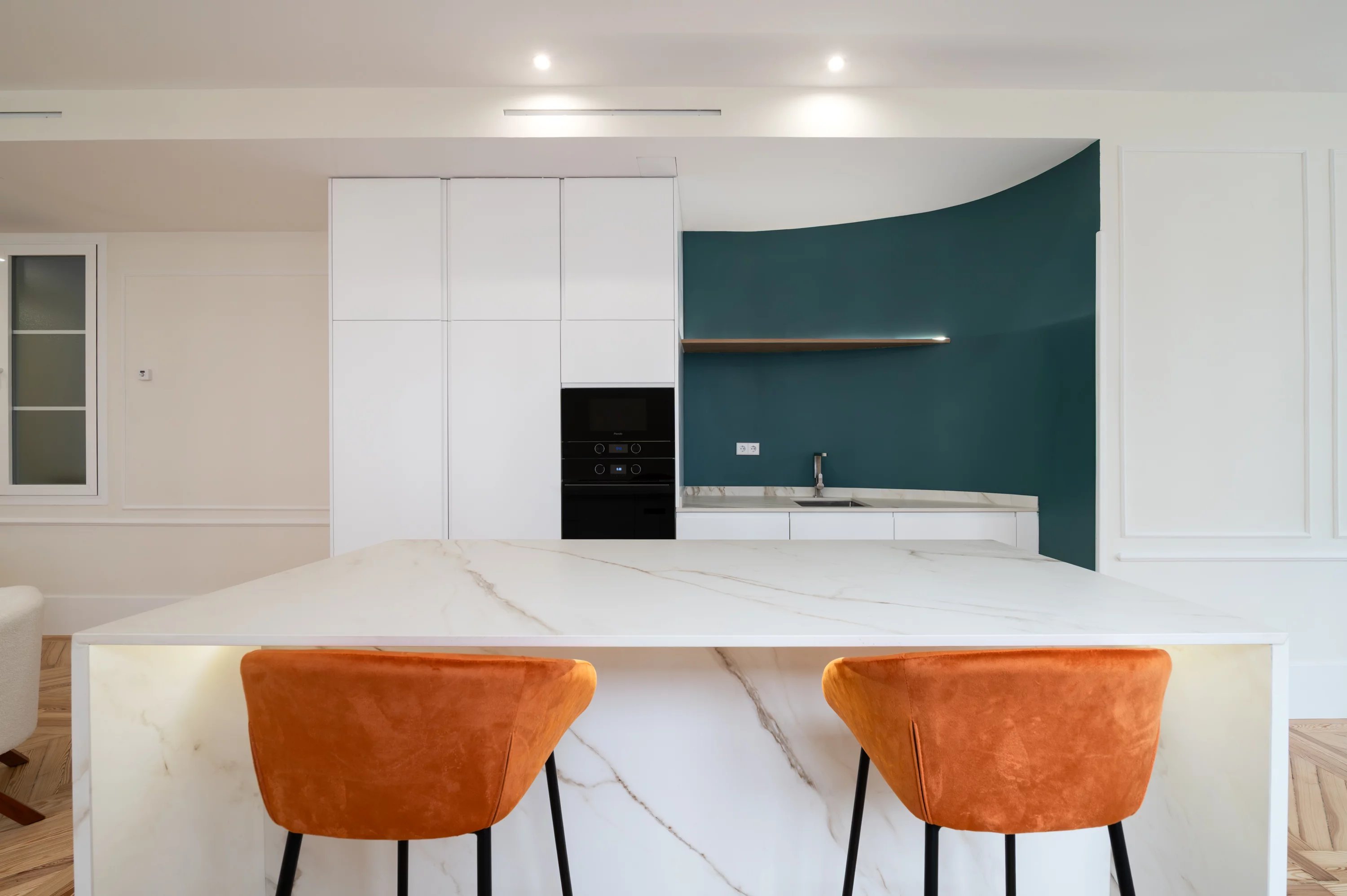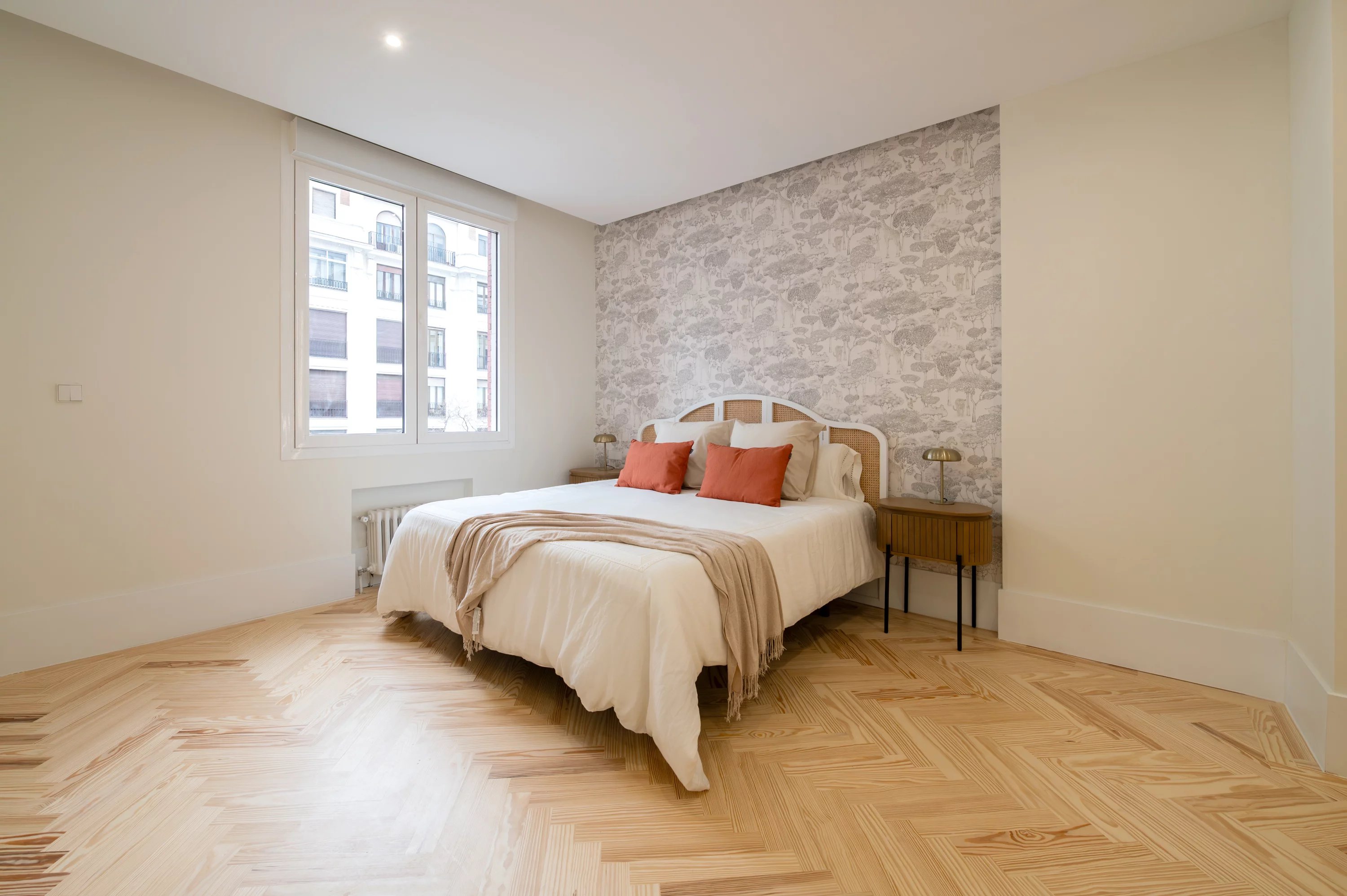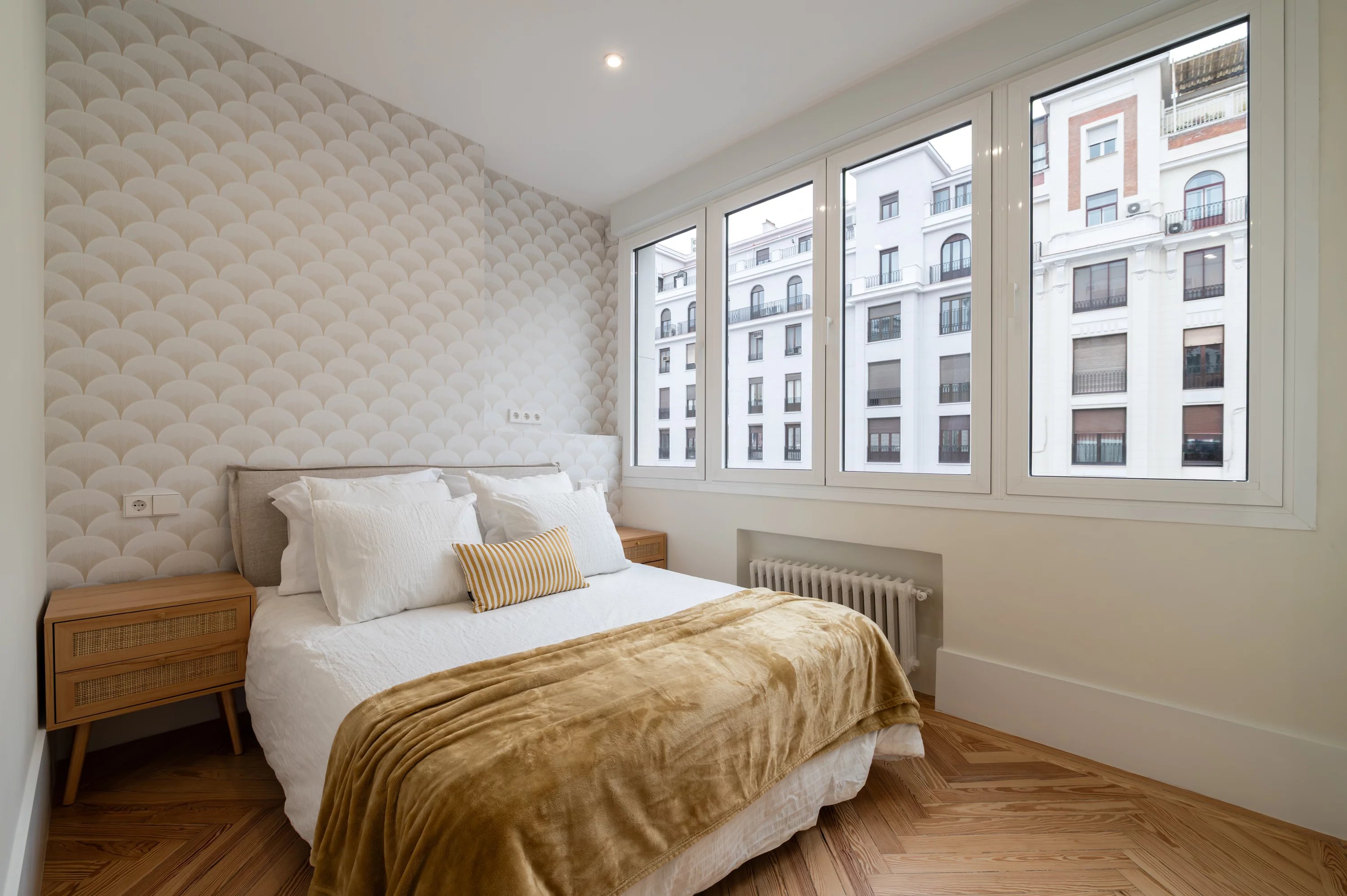 A sala principal, espaçosa e luminosa, torna-se o local ideal para desfrutar das vistas urbanas e do dinamismo de Madrid, enquanto a cozinha, completamente equipada, oferece um espaço prático e elegante para o dia a dia.
