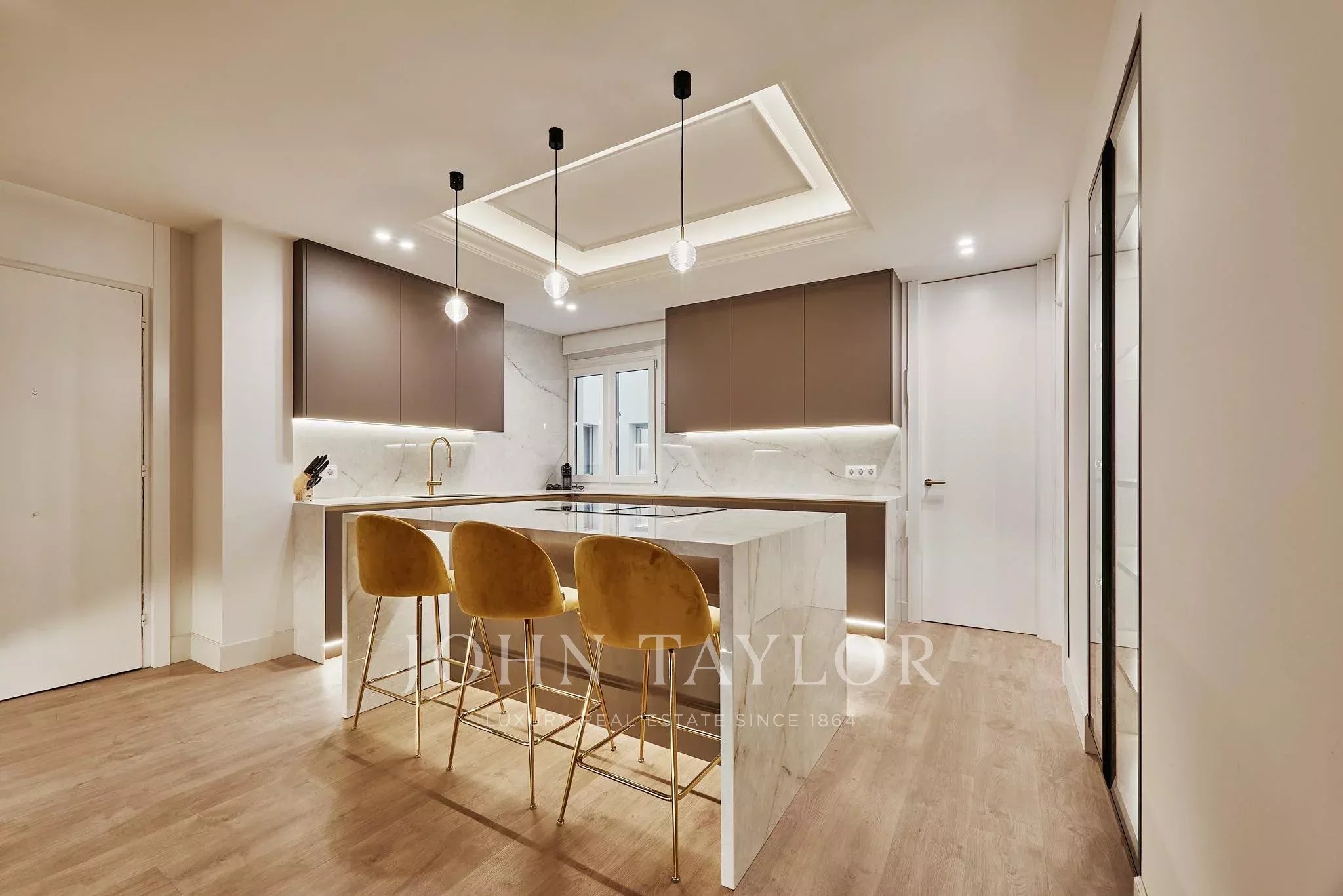 A área de dia está organizada em torno de uma ampla e luminosa sala de jantar com saída para o terraço, onde a luz natural inunda o espaço e aumenta a sensação de amplitude. A cozinha, de design contemporâneo e totalmente equipada, foi concebida para oferecer máxima funcionalidade, e é complementada por uma lavanderia independente que traz ordem e praticidade.