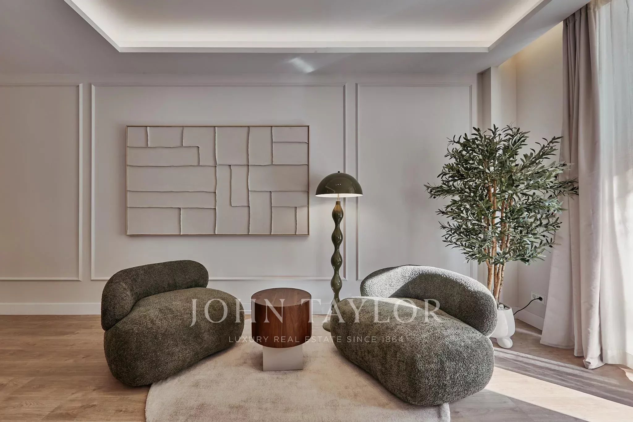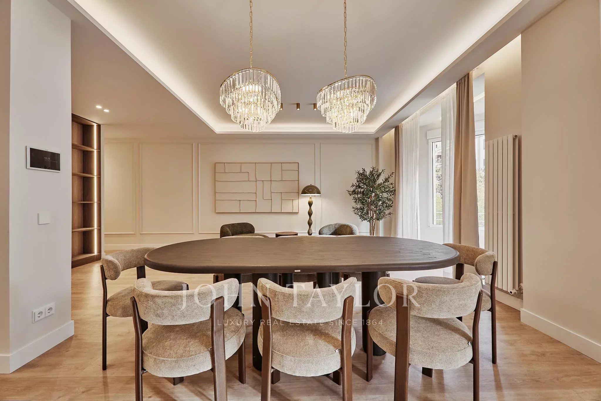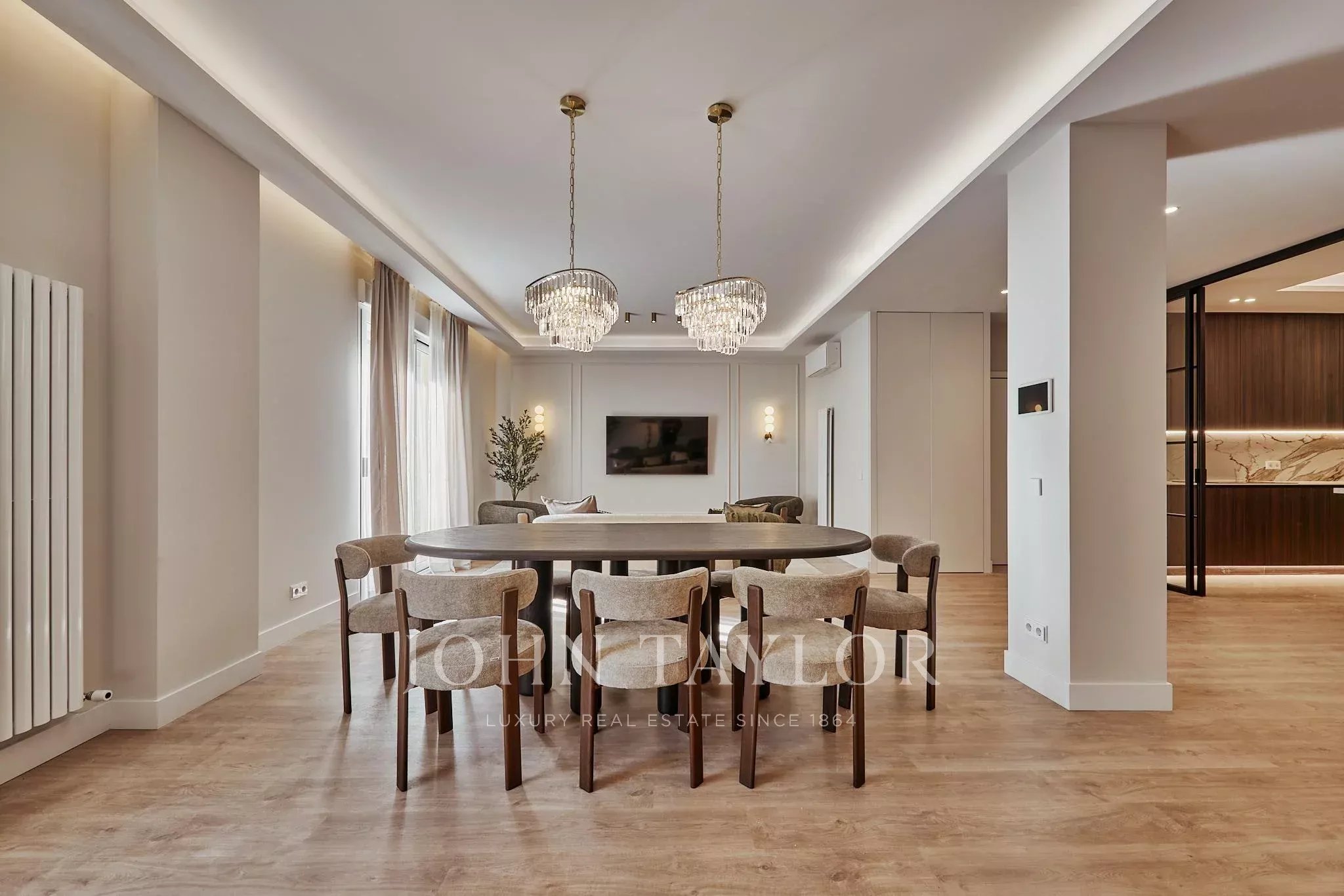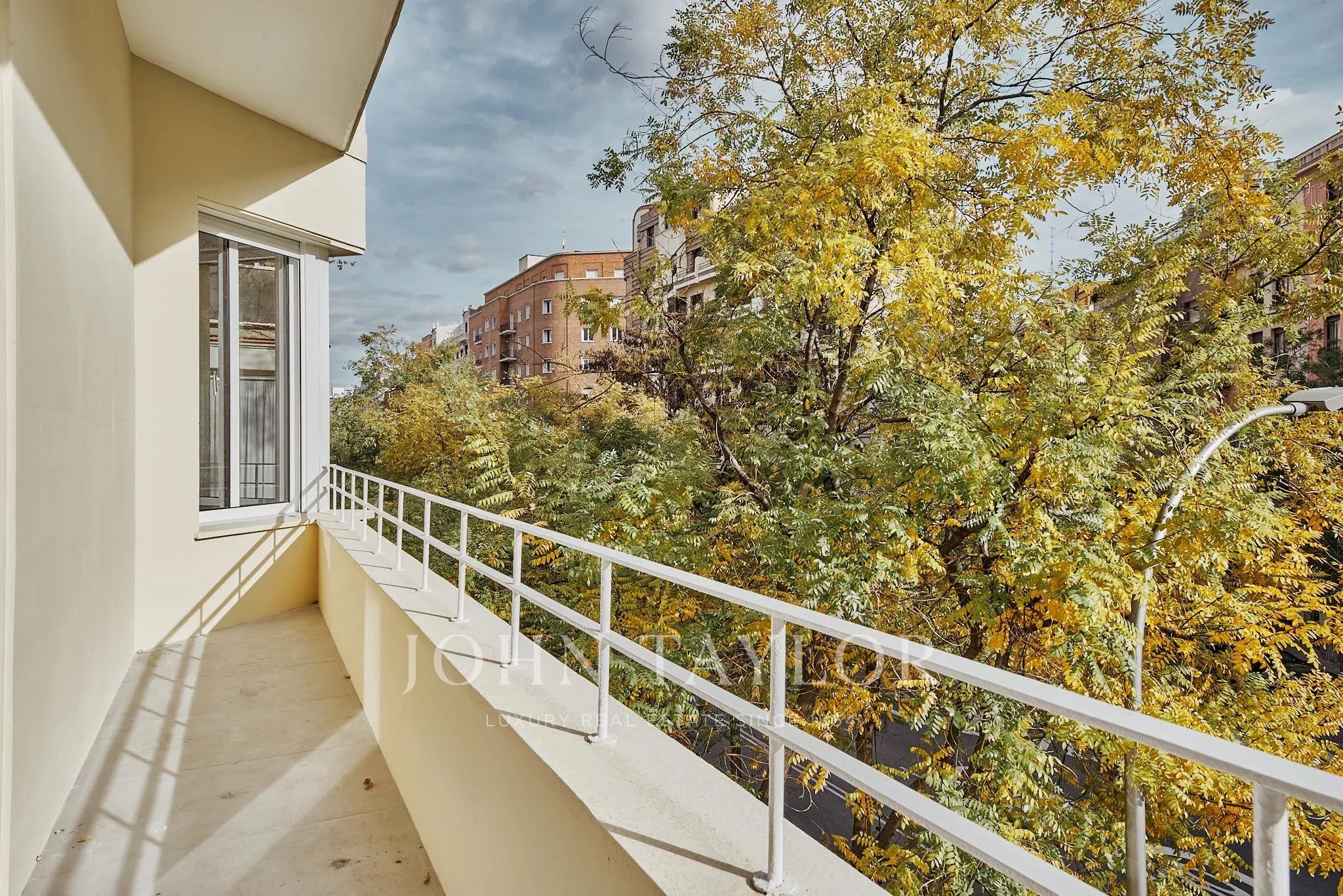 Localizada no segunda andar exterior de um edifício com elevador, a vivienda destaca-se pela sua generosa amplitude e seu caráter representativo em uma das artérias mais icónicas da capital. Foi cuidadosamente reformada com uma abordagem contemporânea que potencializa a fluidez dos espaços e o conforto em cada ambiente.