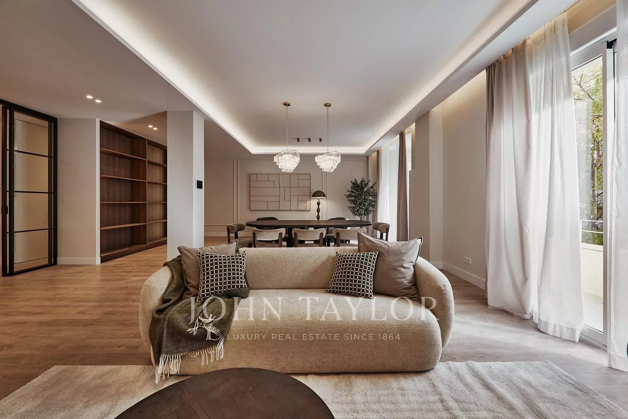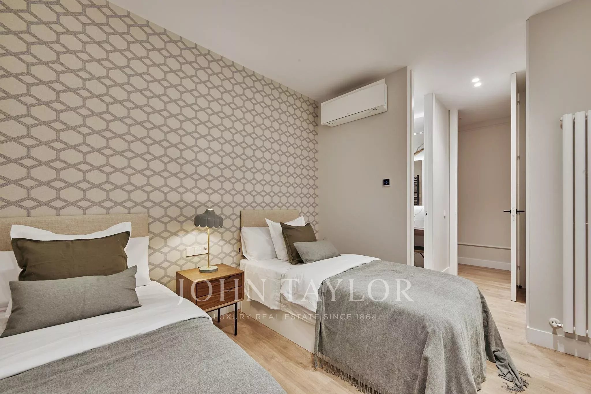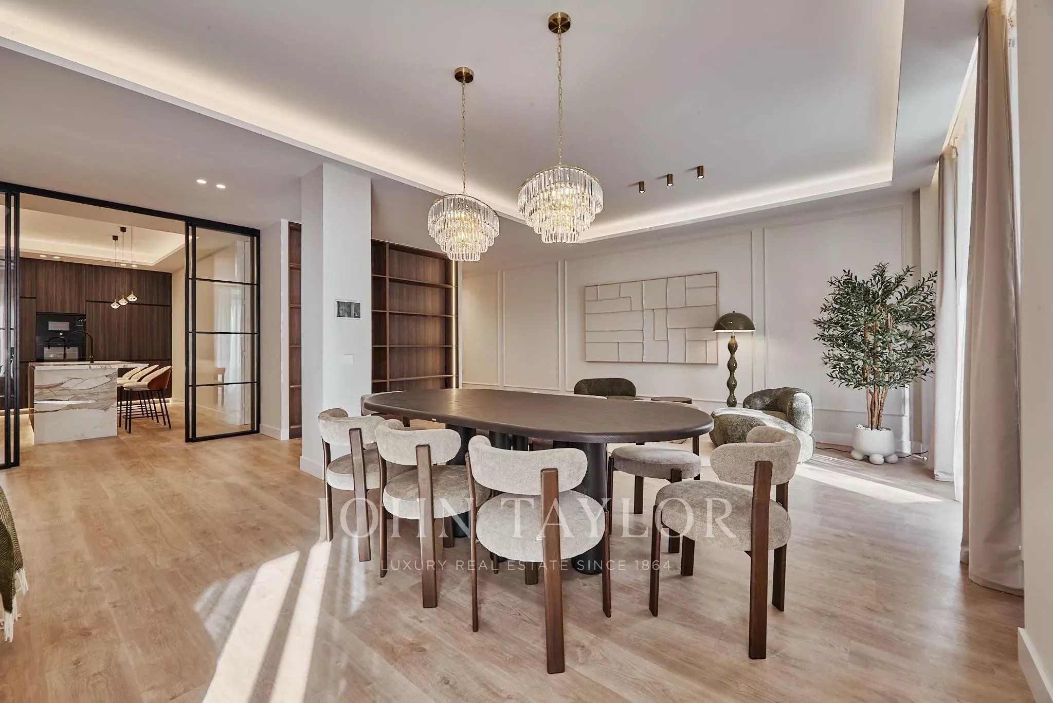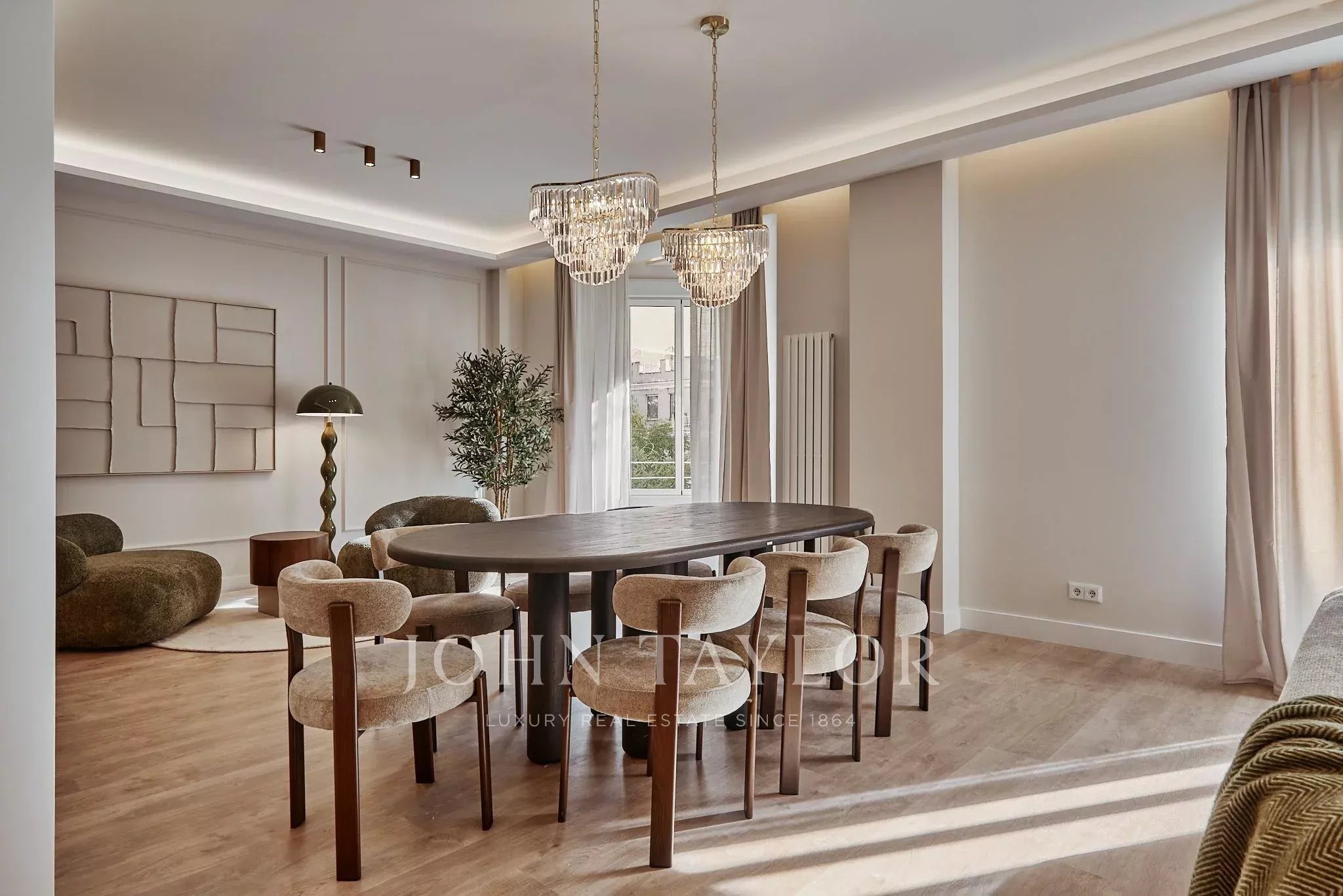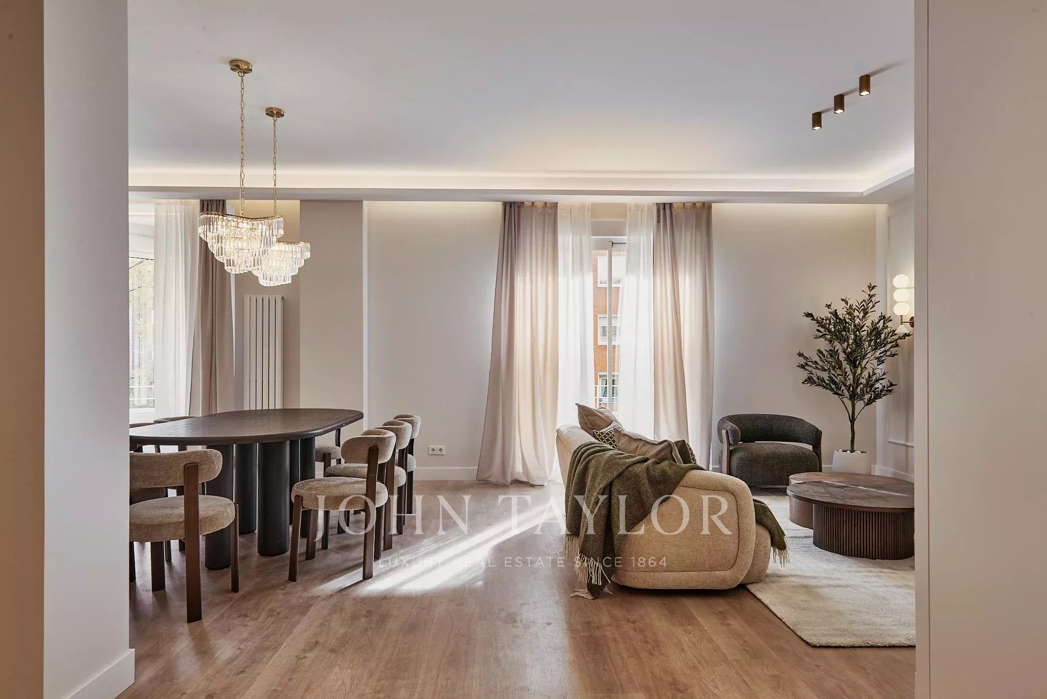 Localizada no segunda andar exterior de um edifício com elevador, a vivienda destaca-se pela sua generosa amplitude e seu caráter representativo em uma das artérias mais icónicas da capital. Foi cuidadosamente reformada com uma abordagem contemporânea que potencializa a fluidez dos espaços e o conforto em cada ambiente.