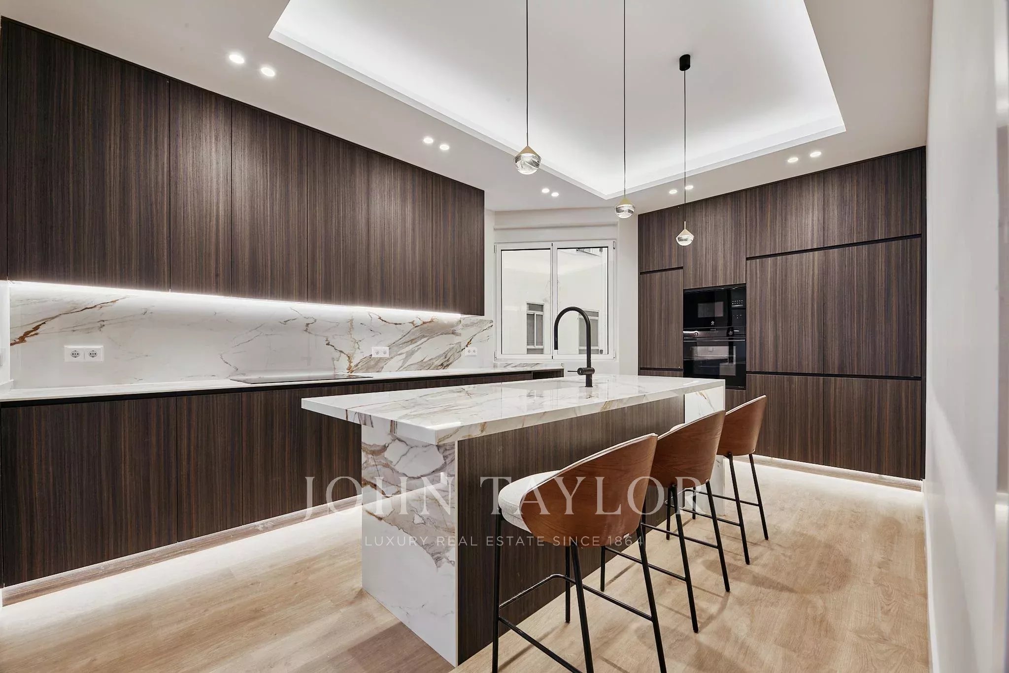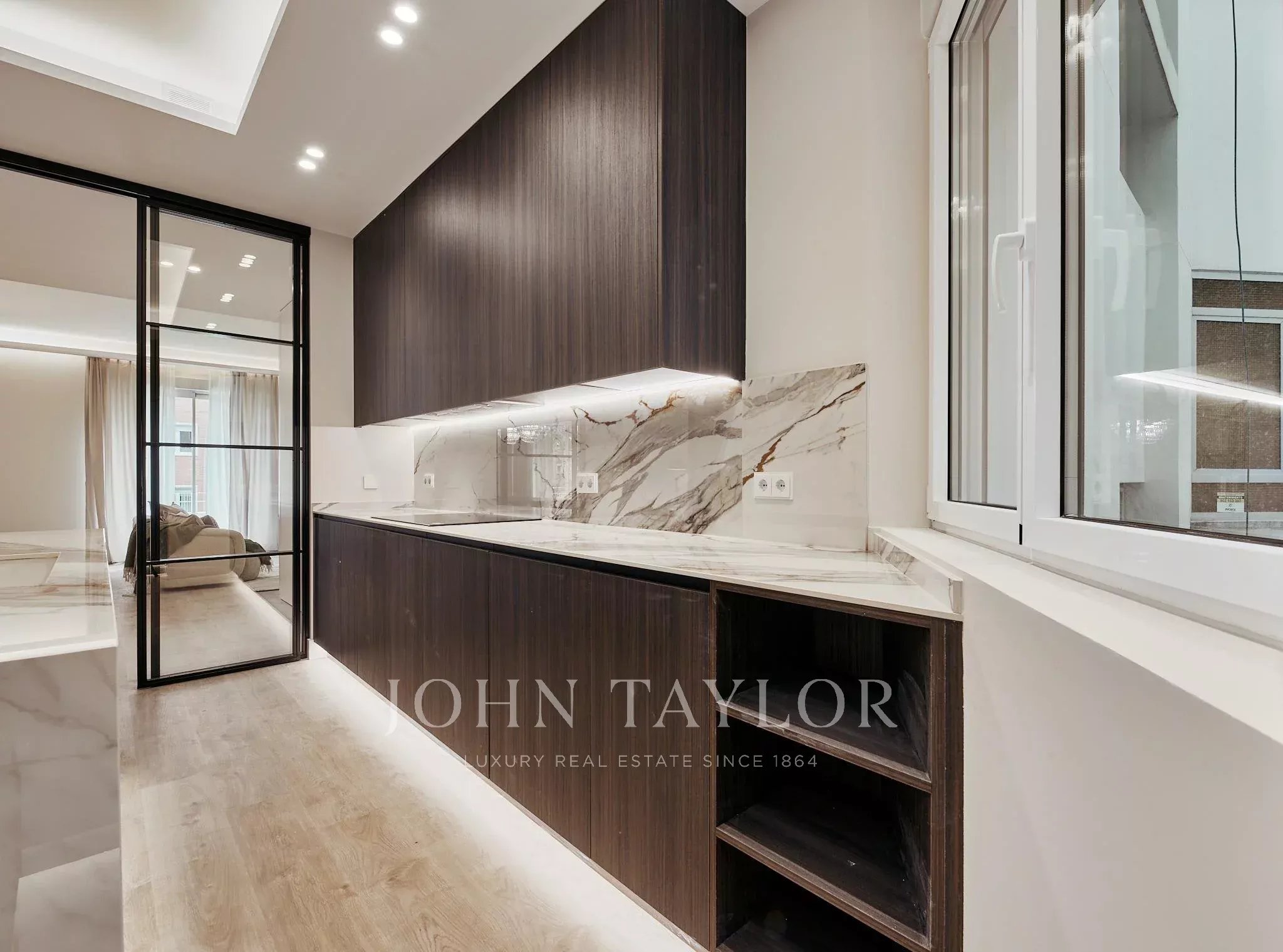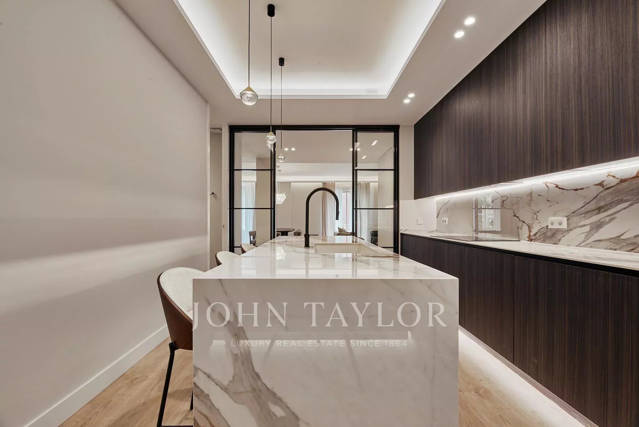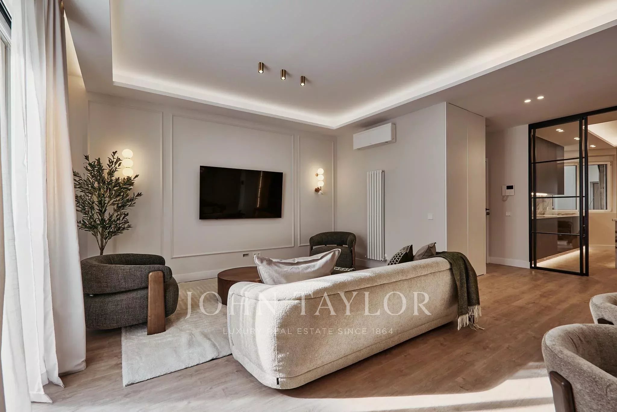 Localizada no segunda andar exterior de um edifício com elevador, a vivienda destaca-se pela sua generosa amplitude e seu caráter representativo em uma das artérias mais icónicas da capital. Foi cuidadosamente reformada com uma abordagem contemporânea que potencializa a fluidez dos espaços e o conforto em cada ambiente.