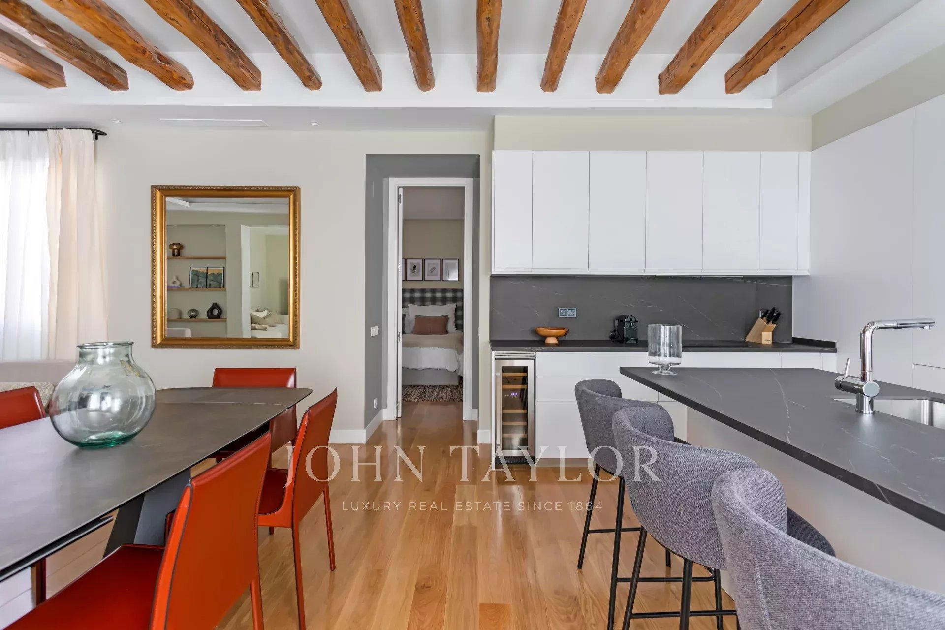 A grande sala de jantar e cozinha aberta (49m2) apresenta novamente as vigas originais do final do século XIX, surpreende pela luminosidade e pelo silêncio que convidam ao convívio ou à contemplação. O interiorismo e o mobiliário foram cuidados até os mínimos detalhes para alcançar uma harmonia dificilmente superável. A cozinha conta com os melhores eletrodomésticos disponíveis no mercado e é entregue totalmente equipada.