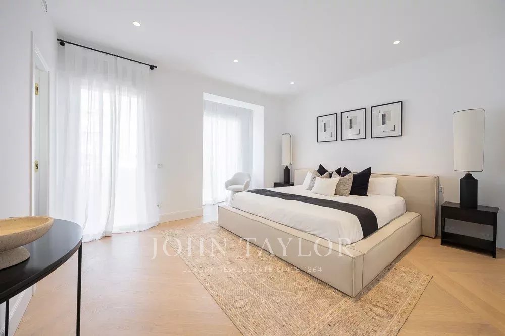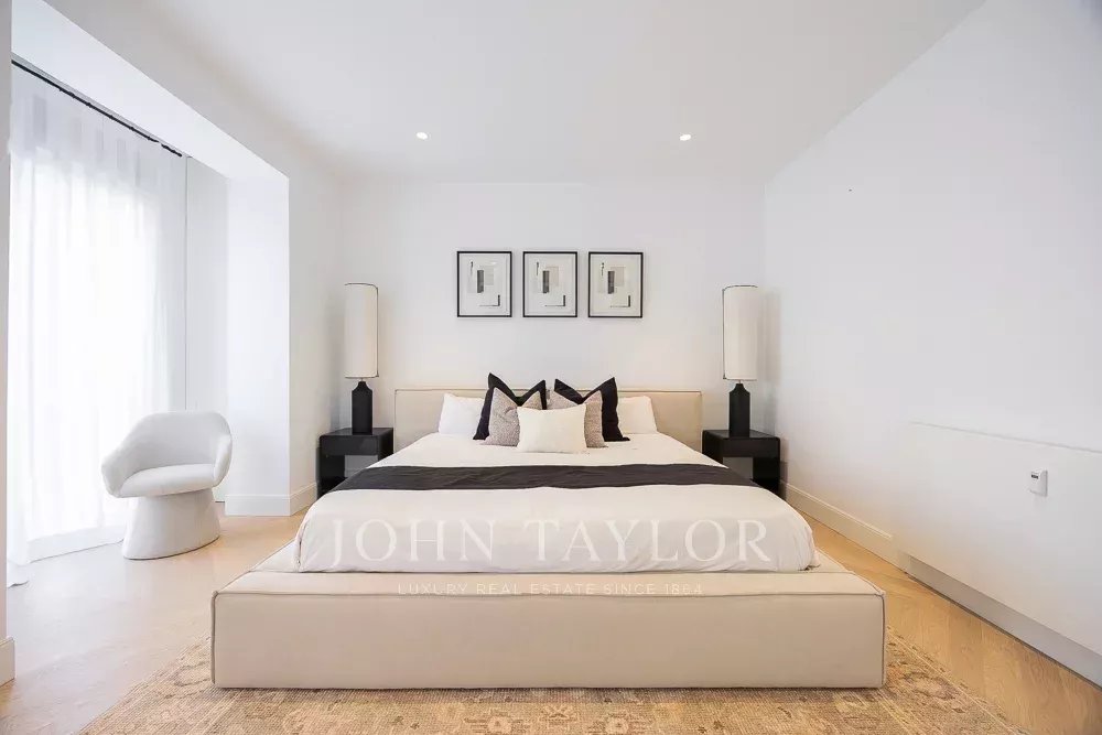 A área privada inclui três quartos, todos com casa de banho privativa, bem como um escritório confortável para trabalhar a partir de casa. O quarto principal oferece um espaço amplo e um quarto de vestir, e tem vista para um grande pátio, proporcionando uma excelente luz natural.