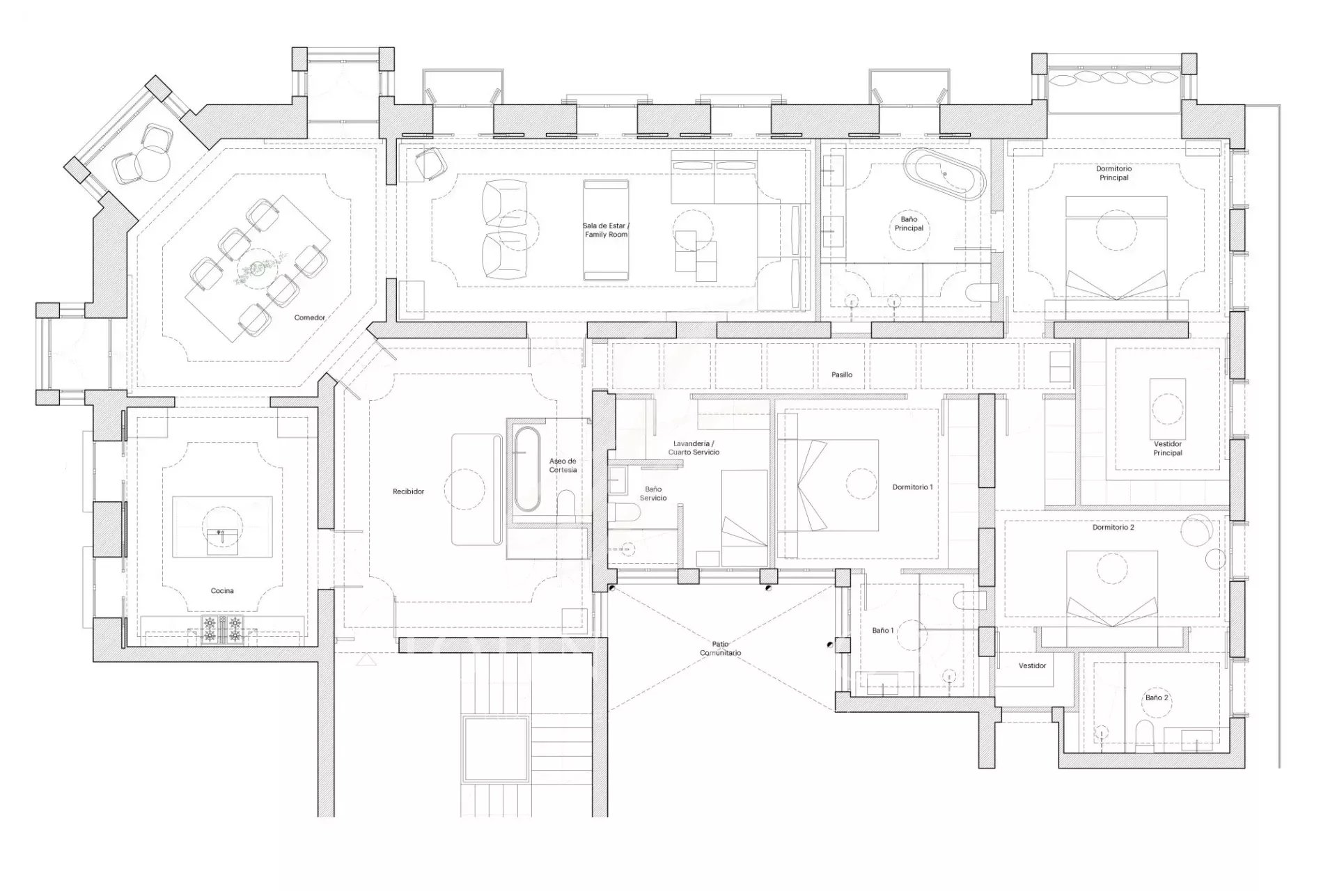 Uma configuração possível seria a de 3 quartos grandes com casa de banho privativa e 1 quarto de serviço. Nesta configuração, haveria uma grande sala de jantar no canto, uma cozinha exterior de 20 m2 e uma grande sala de estar também exterior.
