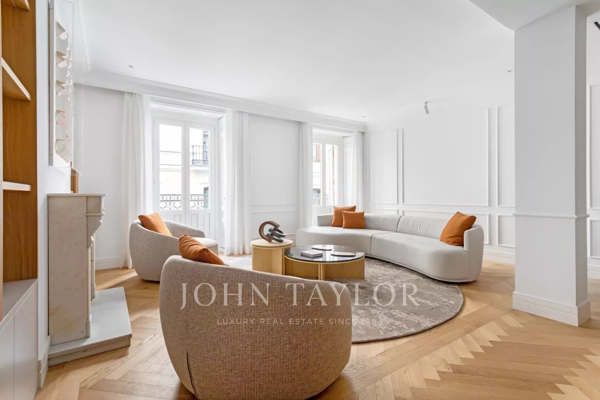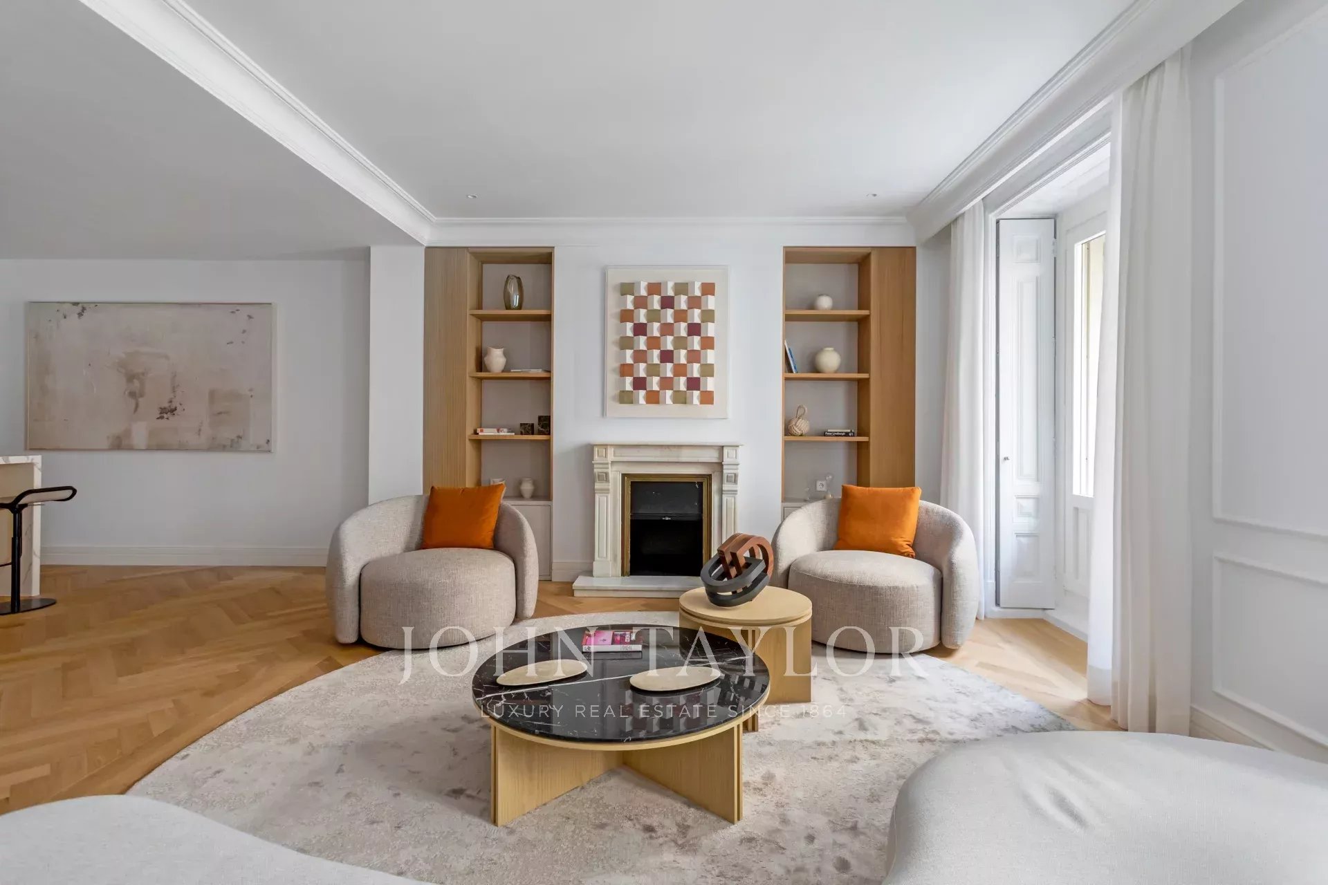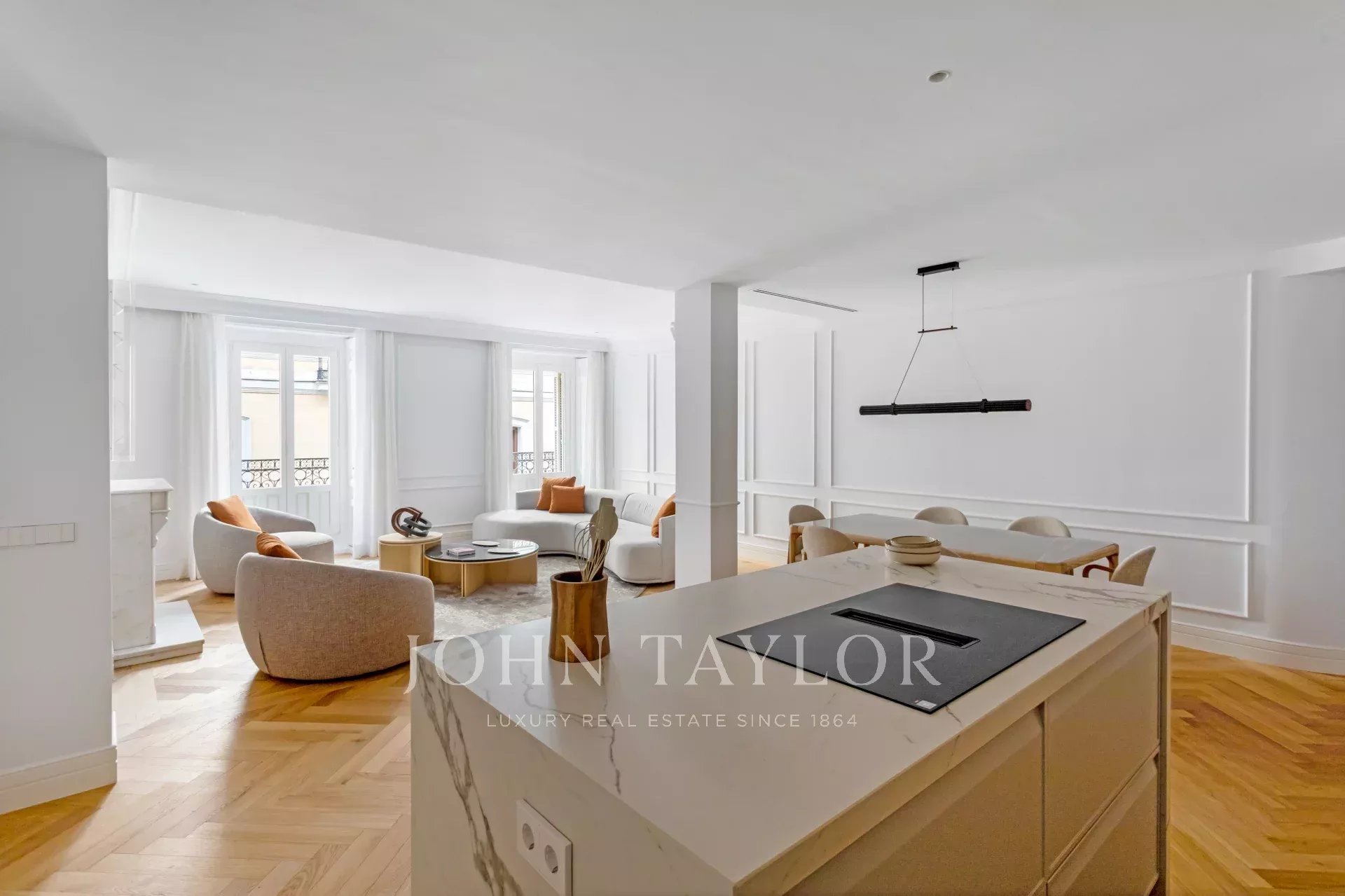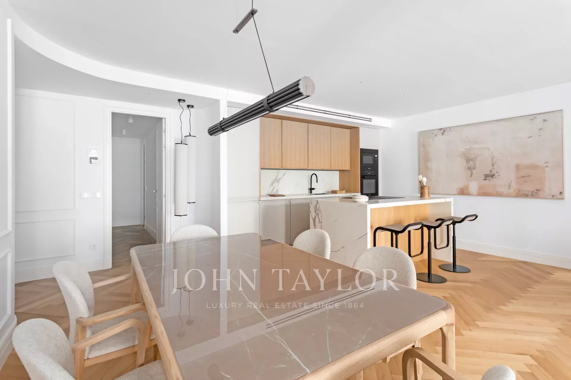 Situado no primeiro andar de um edifício clássico, o imóvel combina o encanto da arquitetura tradicional de Madrid com um design interior contemporâneo e funcional.