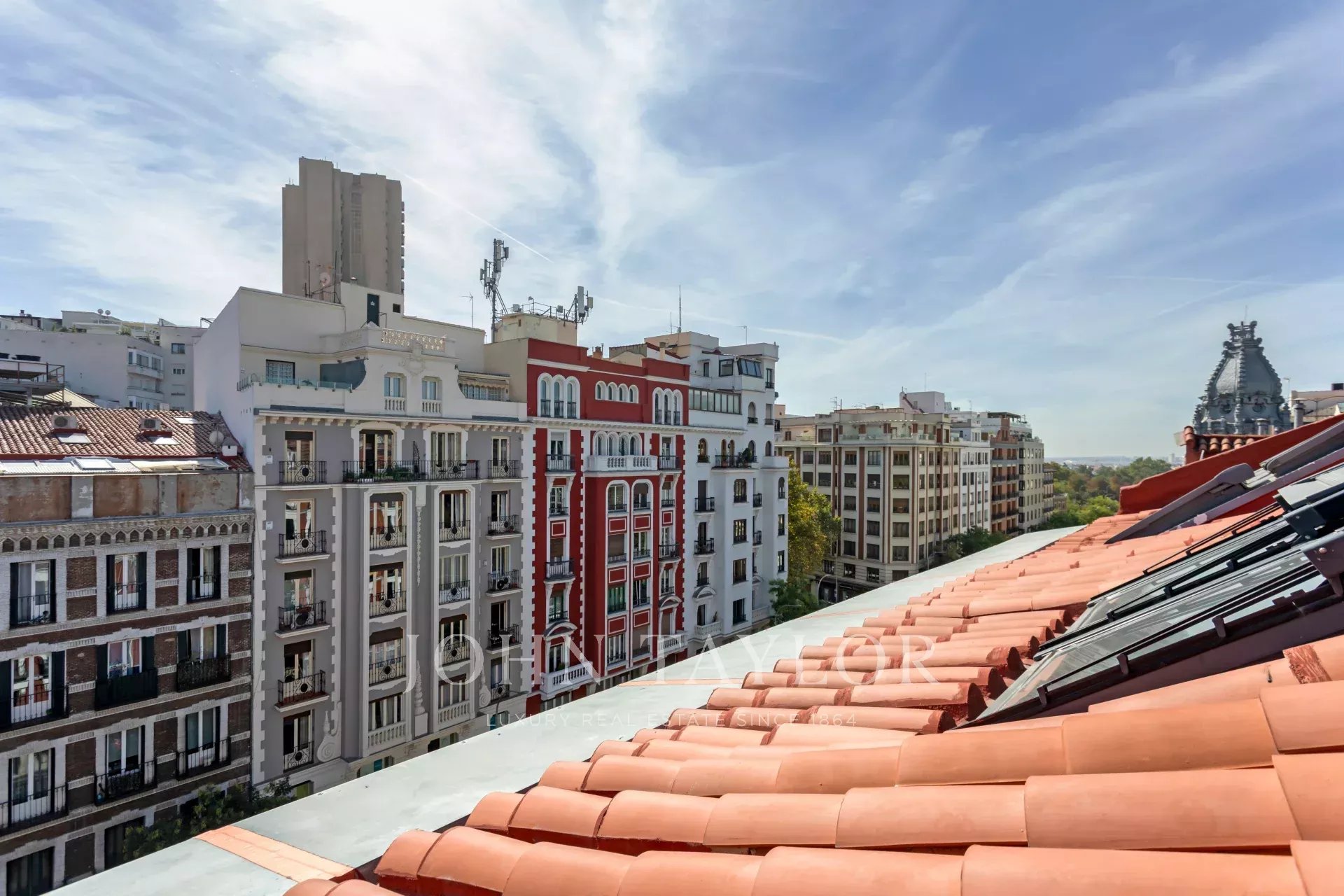 Apresentamos em exclusivo esta penthouse única com terraço e vista para as cúpulas e telhados mais emblemáticos do bairro de Salamanca, a apenas um minuto a pé do Parque do Retiro.