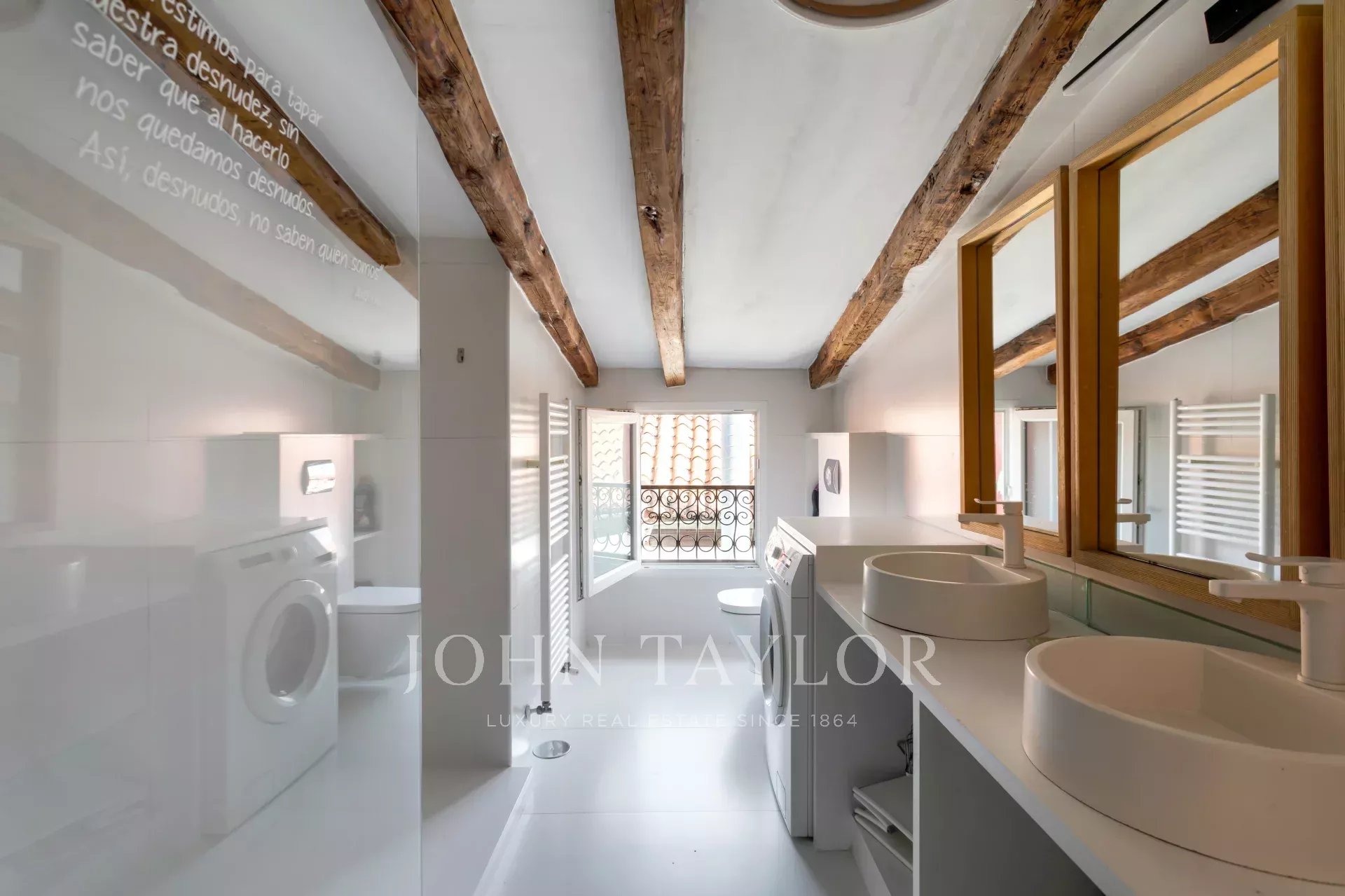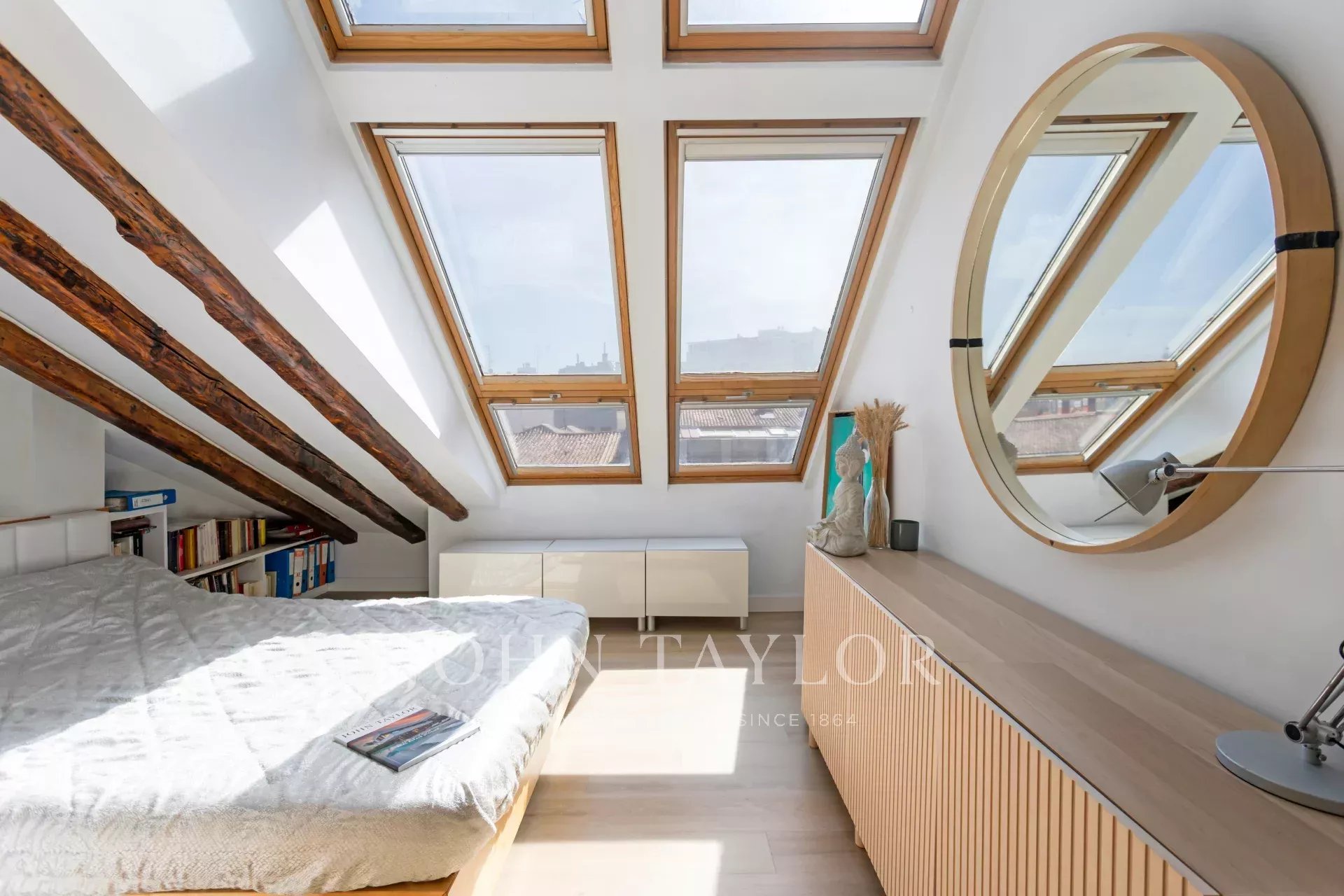 A sala e o quarto têm janelas de sótão com vista para a rua Alcalá, de onde se podem admirar belos edifícios clássicos e parte do Parque do Retiro. Esta é uma penthouse para os amantes do sol e da luz natural.