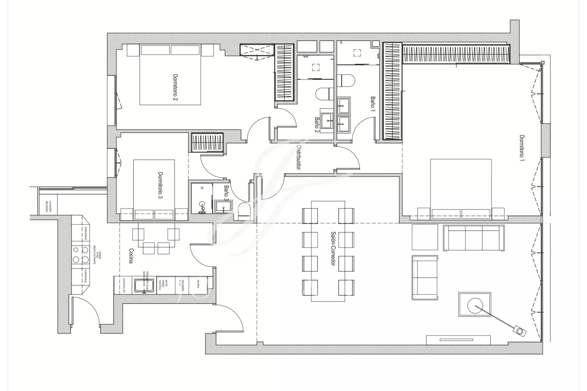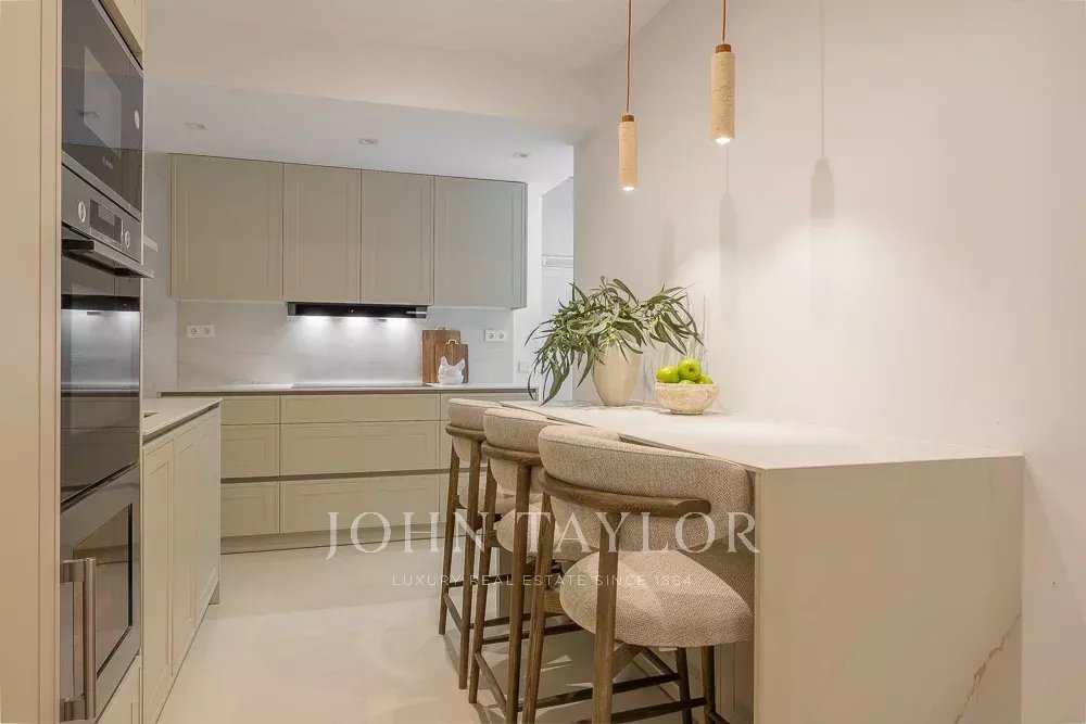A propriedade é composta por uma grande área social de mais de 50m², com áreas de estar e jantar luminosas e espaçosas. Ao lado e através de portas de correr acedemos à cozinha, totalmente equipada e com ilha, bem como zona separada para máquina de lavar e secar roupa.