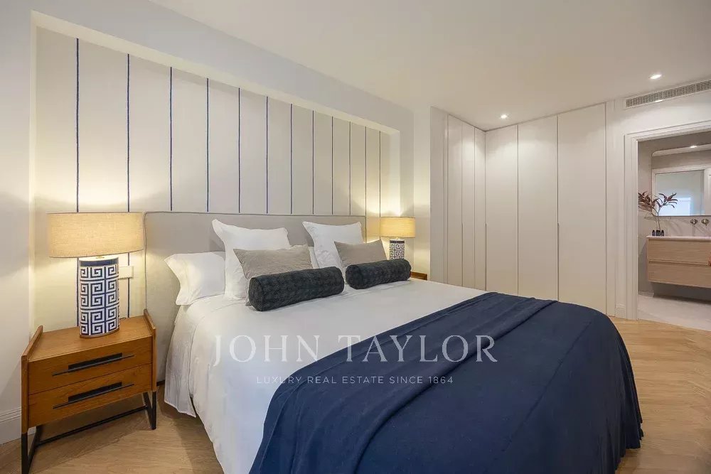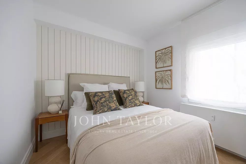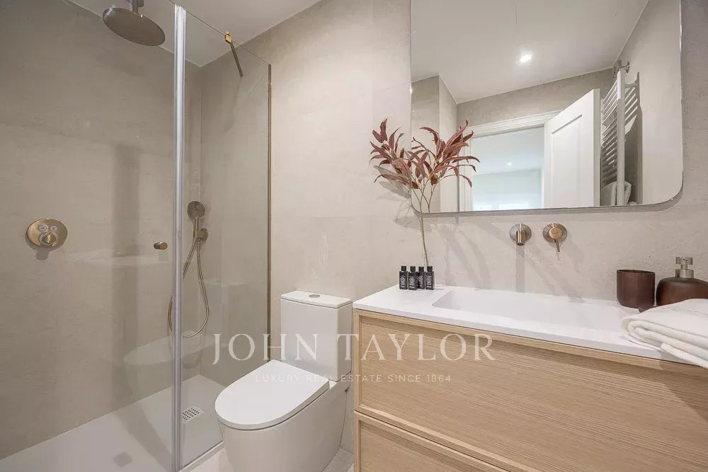 A zona de dormir inclui três quartos e três casas de banho, todas em suite. O quarto principal destaca-se pela sua grande dimensão, muito acima da média da zona, com duas grandes janelas com vista para a rua e uma casa de banho completa em suite.