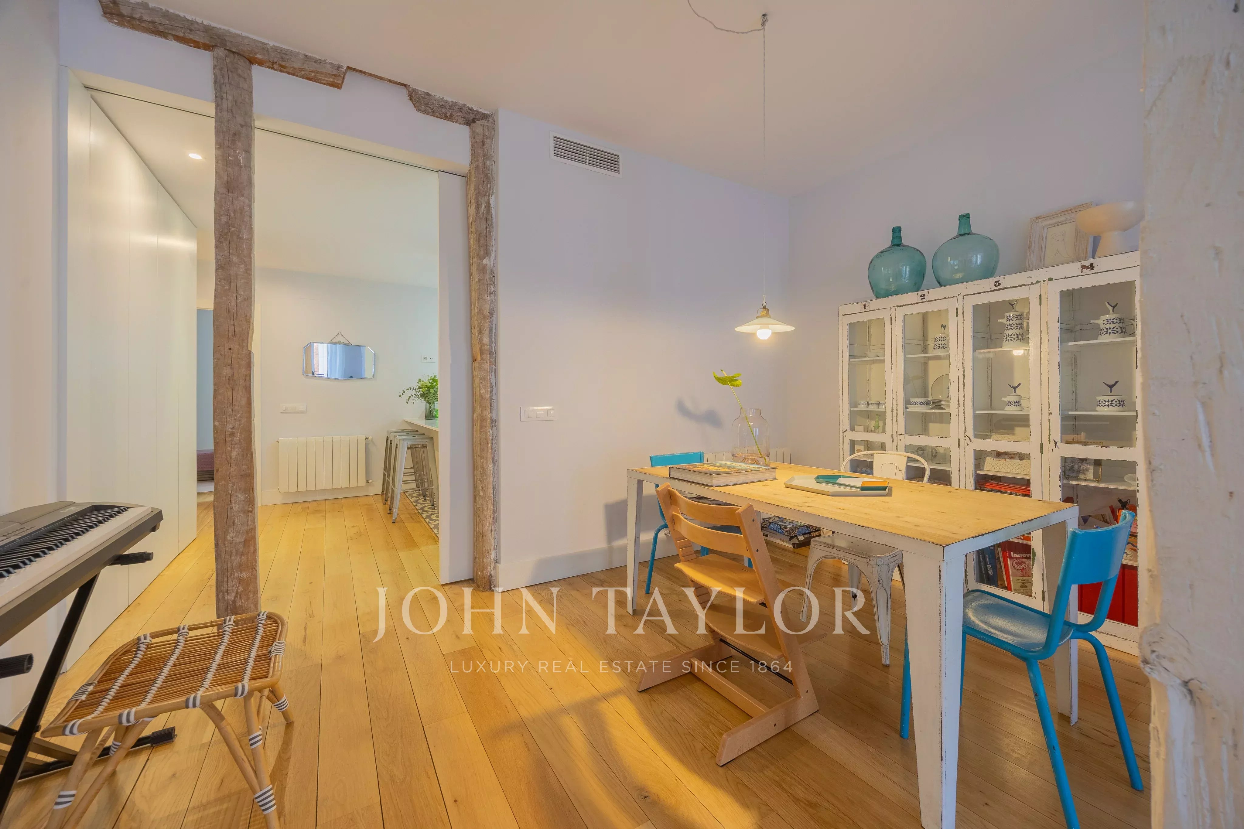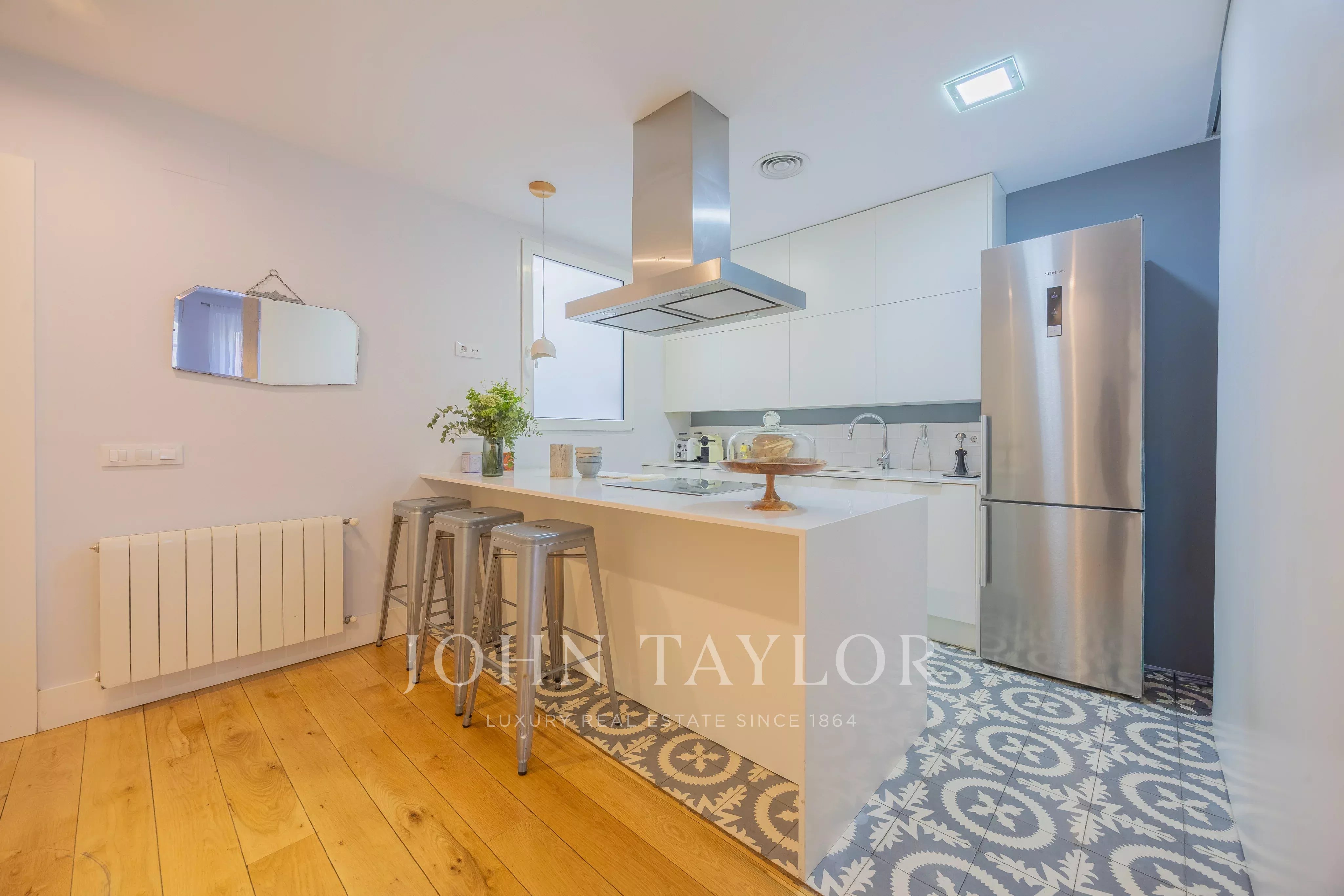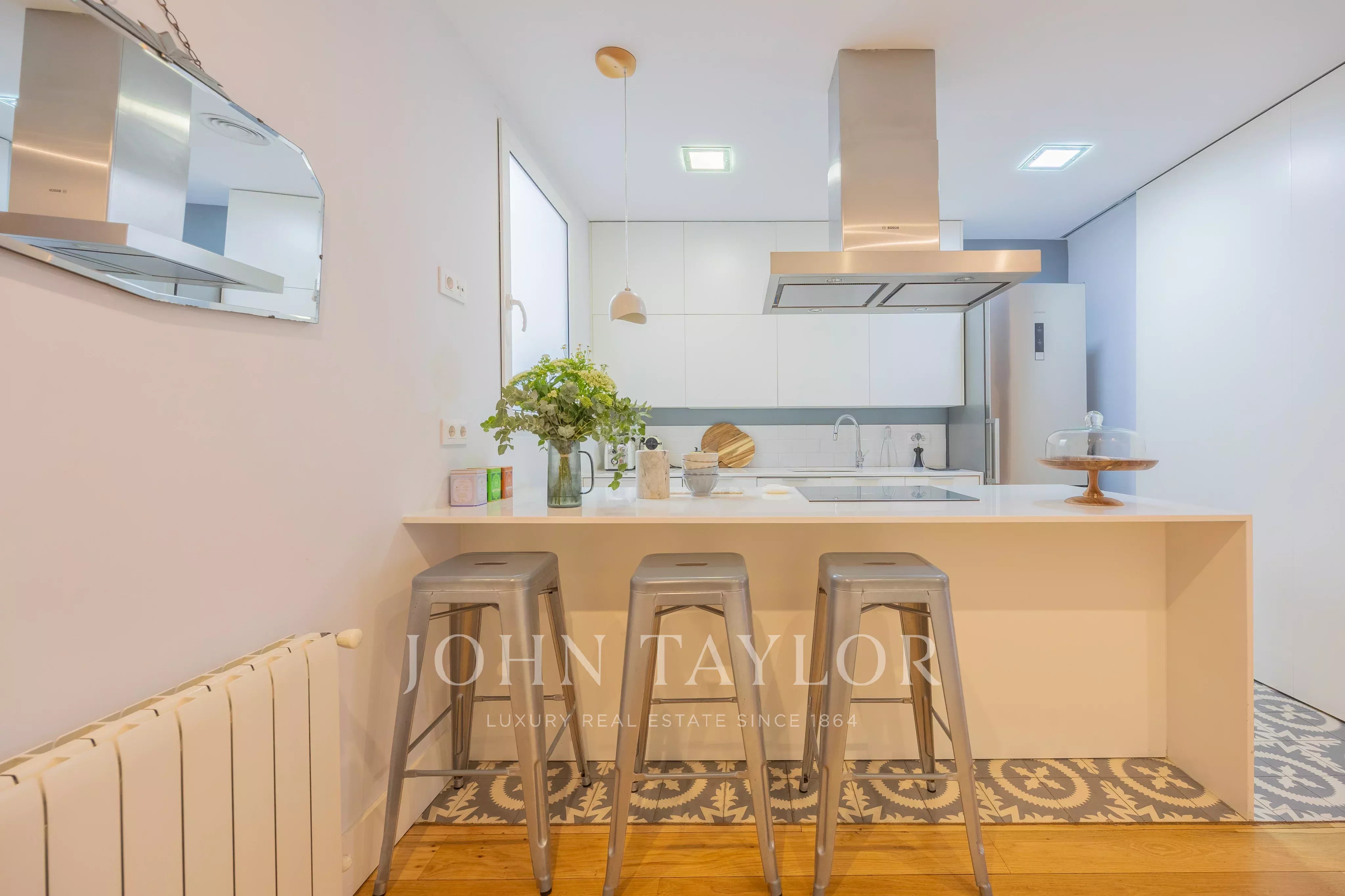 A habitação dispõe de dois quartos amplos, uma sala de estar e jantar luminosa com grandes janelas e um ambiente moderno e acolhedor graças ao seu piso de madeira e decoração cuidada. A cozinha, totalmente equipada, integra-se perfeitamente com a área de estar, oferecendo funcionalidade e design contemporâneo. Detalhes como ar condicionado, videoporteiro e zelador garantem o máximo conforto e segurança no dia a dia, criando uma casa adaptada às necessidades atuais. O apartamento destaca-se pela sua excelente distribuição, que otimiza cada metro quadrado e aproveita ao máximo a luz natural.