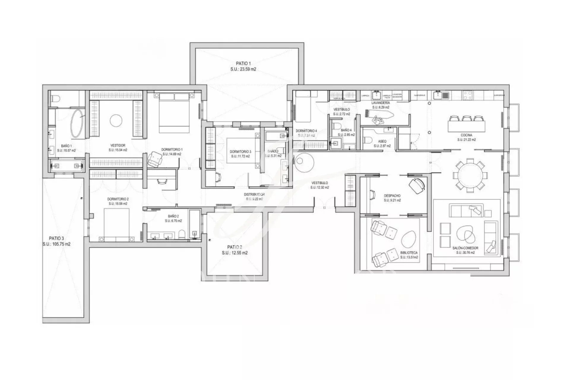 Situado no terceiro andar de um edifício clássico de 1900, no procurado bairro de Justicia, este apartamento familiar de 251 m2 é composto por quatro quartos com casas de banho privativas, bem como uma área de escritório, uma biblioteca separada e uma área de lavandaria completa. A sala de estar/jantar e a cozinha estão situadas no exterior inundado de luz, com as suas 4 varandas com vista para a rua e os seus tectos altos com molduras.