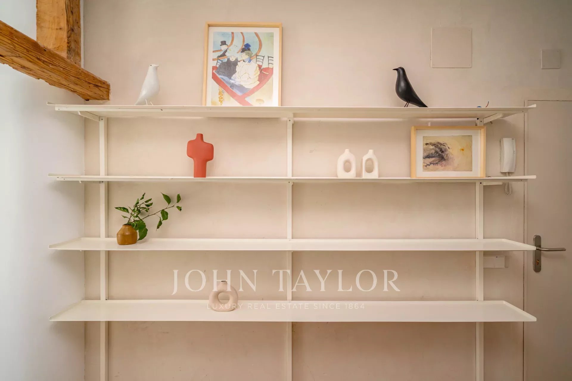 O apartamento inclui muitos detalhes: pilares e vigas de madeira estruturais originais do edifício, projeto de iluminação quente, mobiliário feito à medida, chuveiros com azulejos italianos, etc.