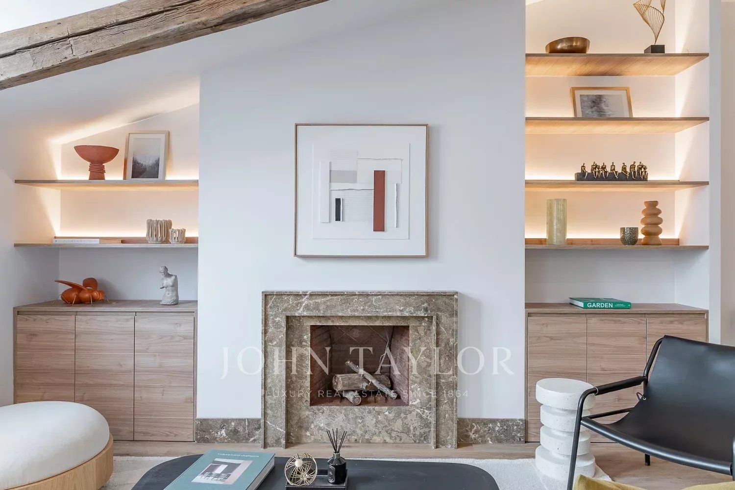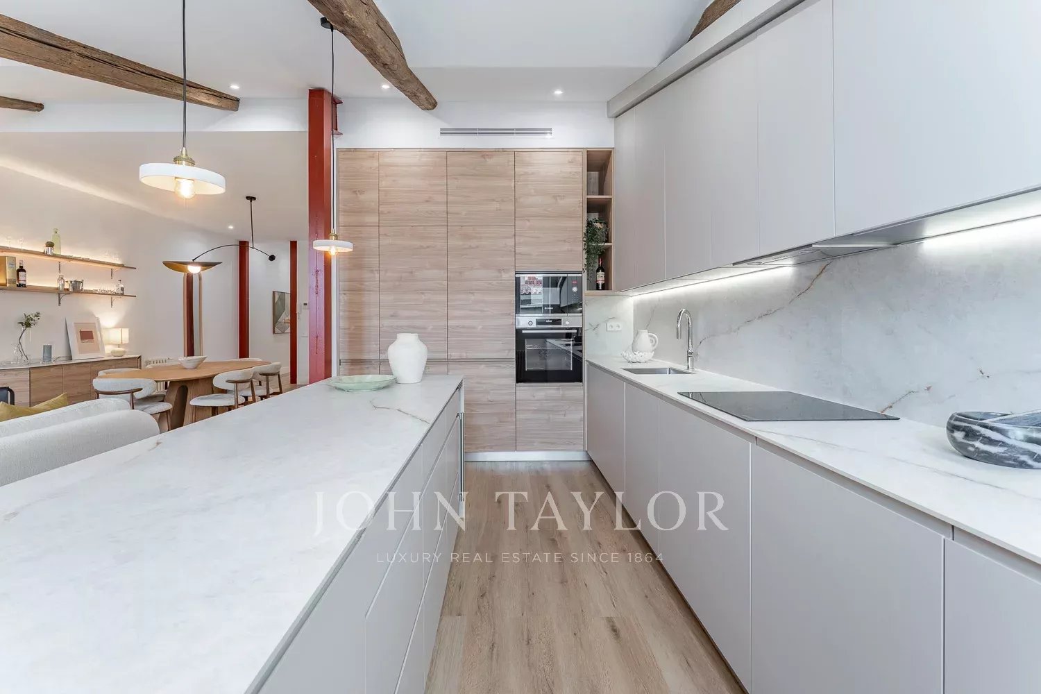 A sua imponente sala de estar, coroada por tectos altos e uma lareira acolhedora, está perfeitamente integrada com a sala de jantar, o bar e uma cozinha de design em plano aberto com uma ilha generosa e uma grande capacidade de arrumação. Um espaço criado para desfrutar, partilhar e viver.
