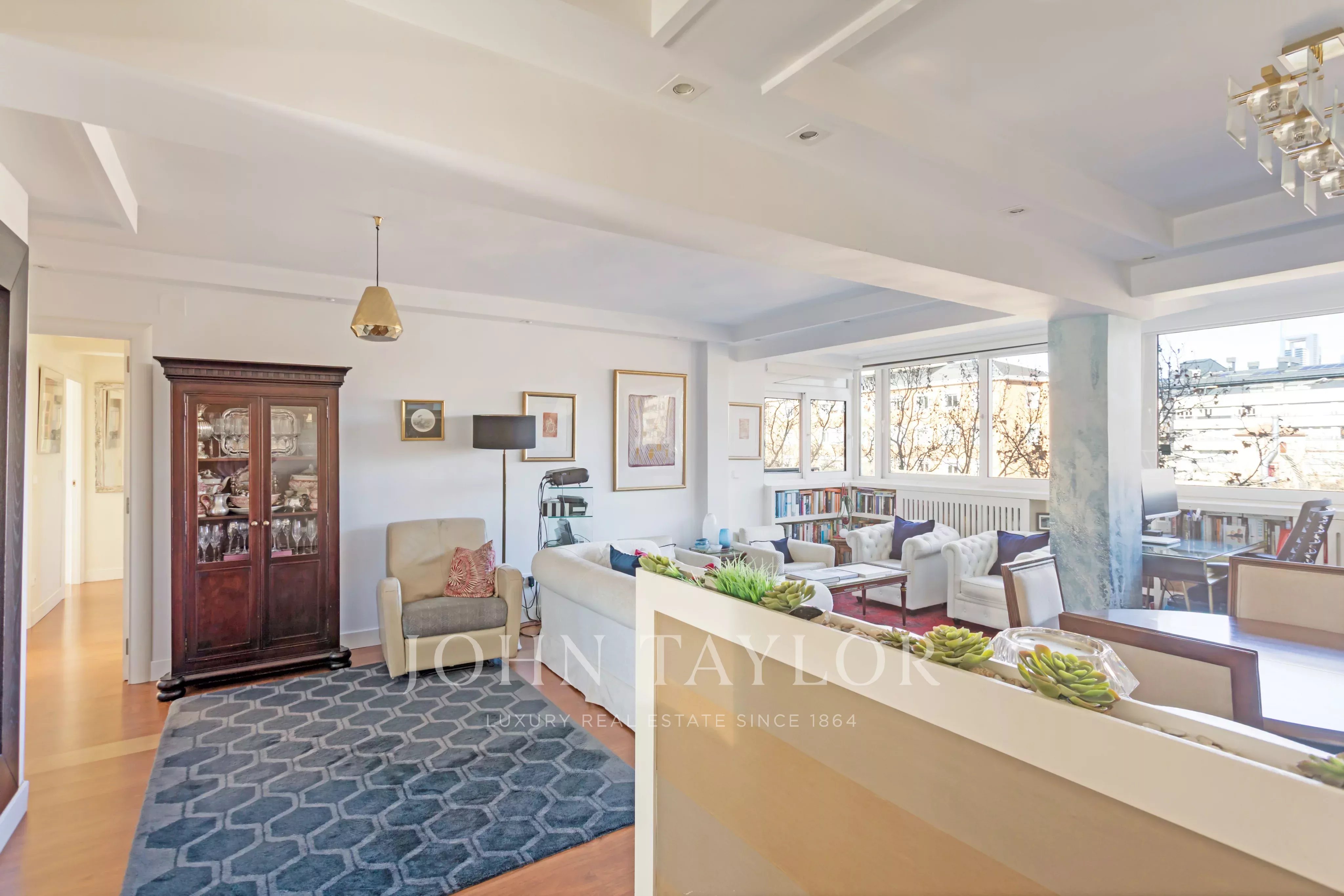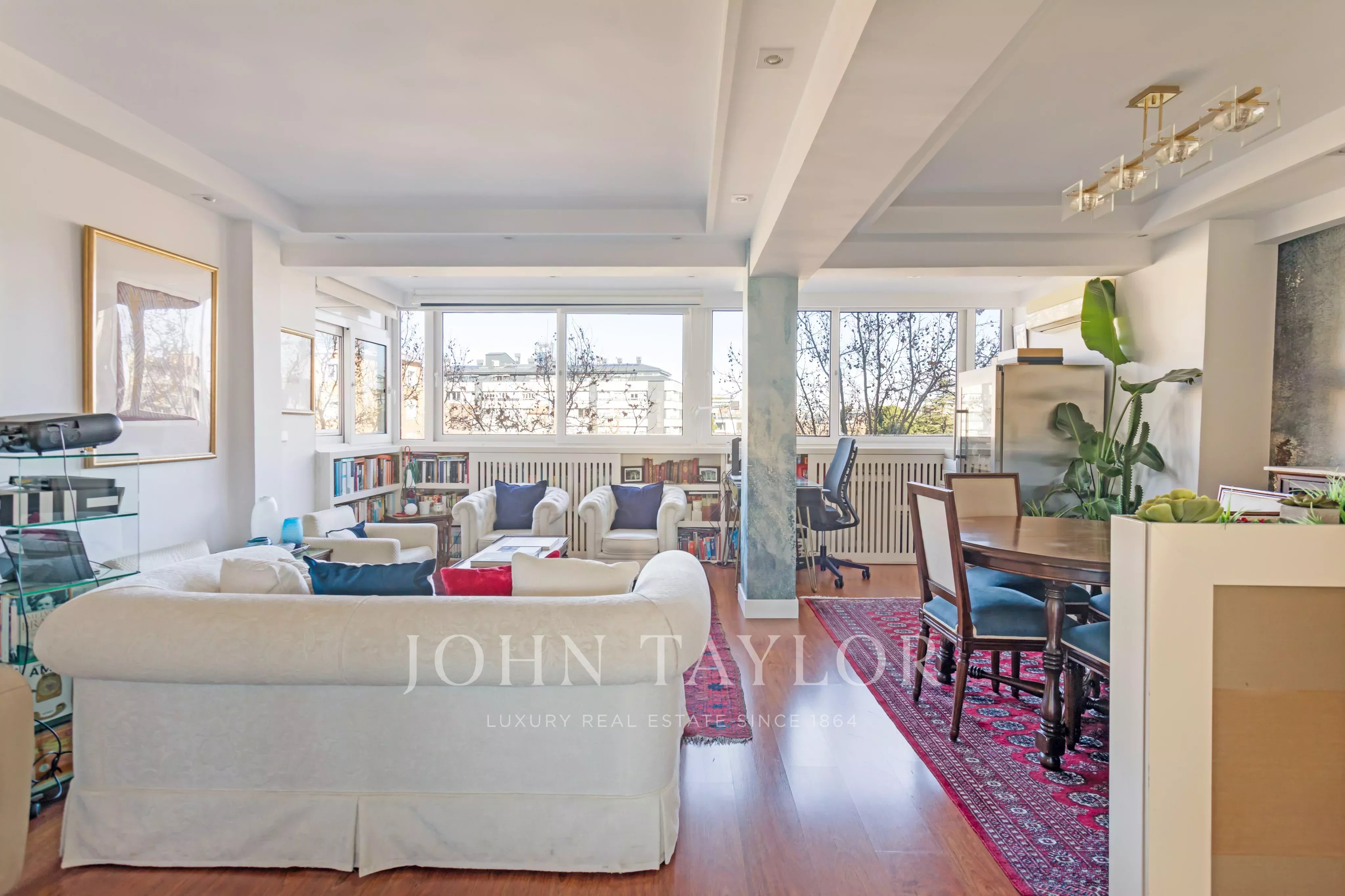 A área de estar com um salão acolhedor banhado em luz natural graças às grandes janelas que oferecem vistas desobstruídas e grande luminosidade ao longo do dia.