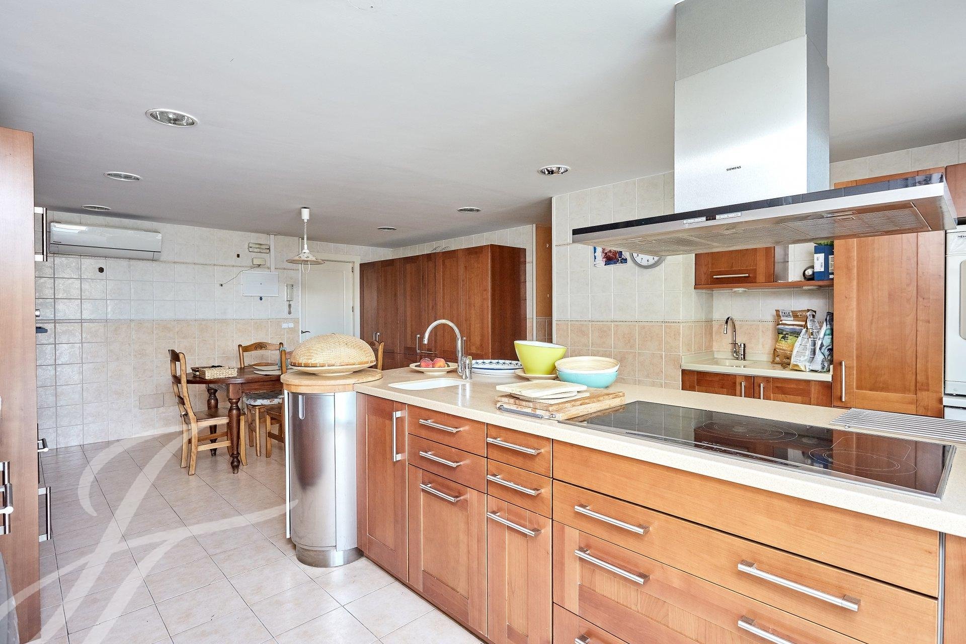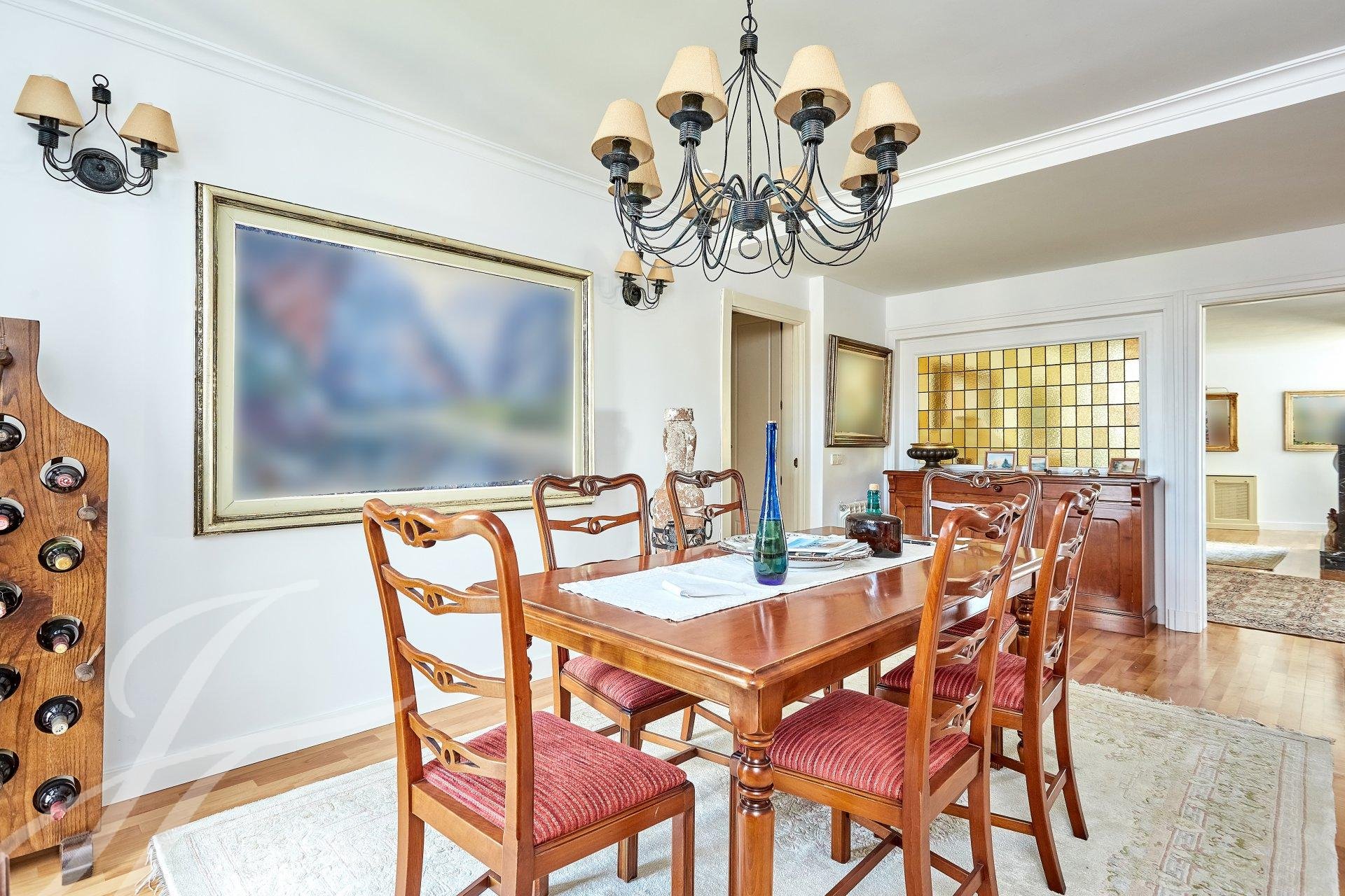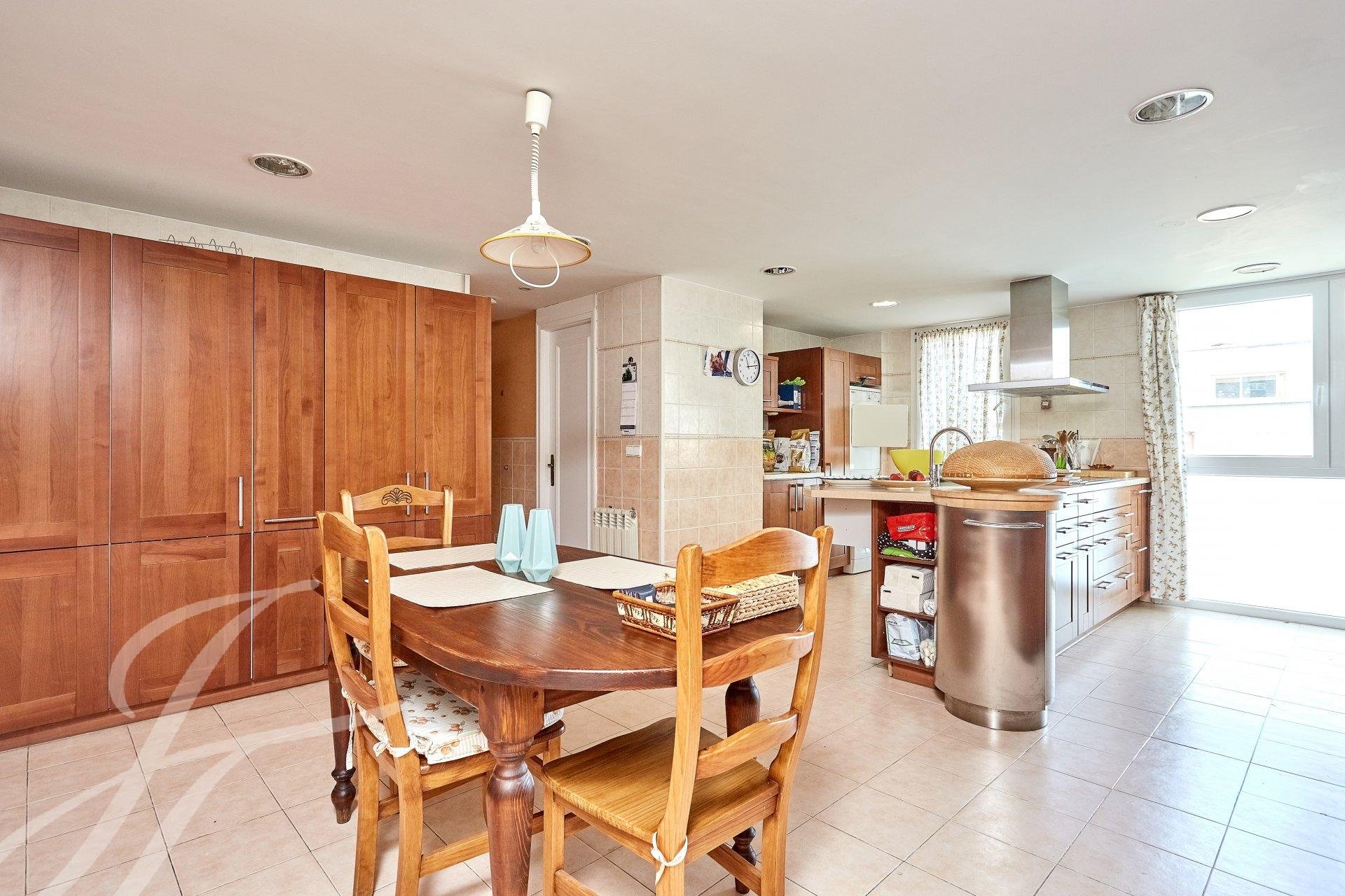 Deixando para trás a zona de descanso, acedemos à sala de jantar com acesso direto à grande cozinha com escritório e quarto de empregada com casa de banho separada.