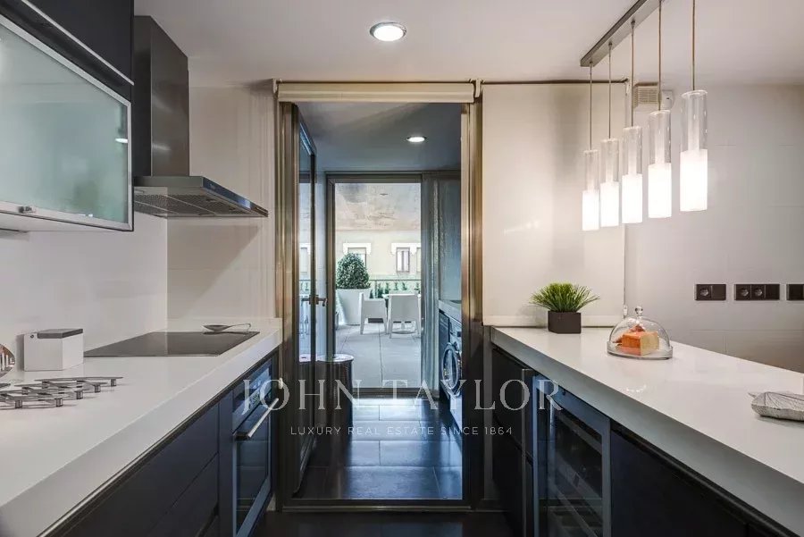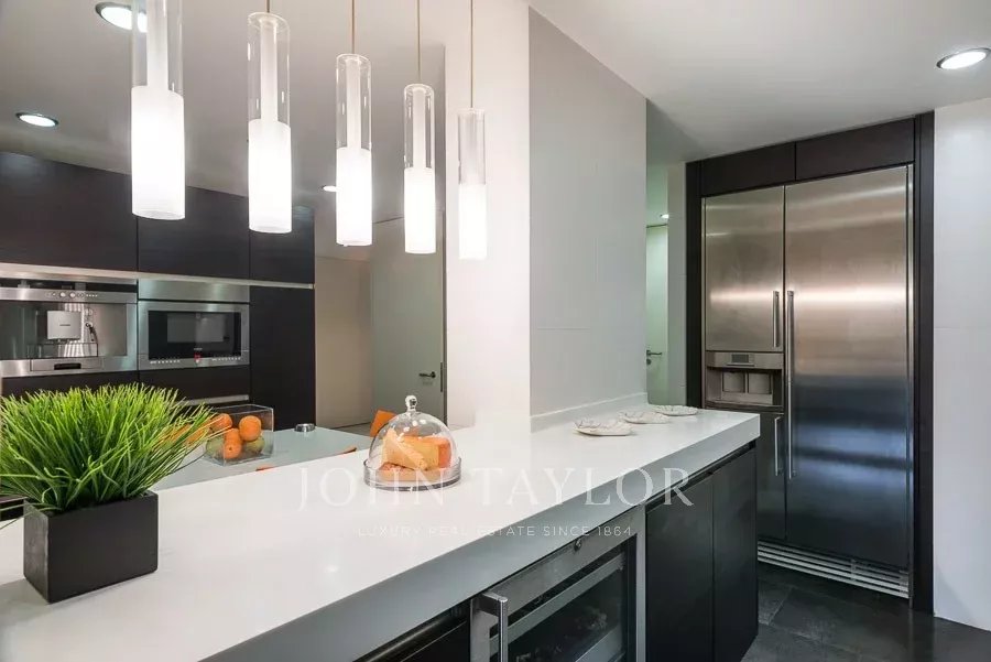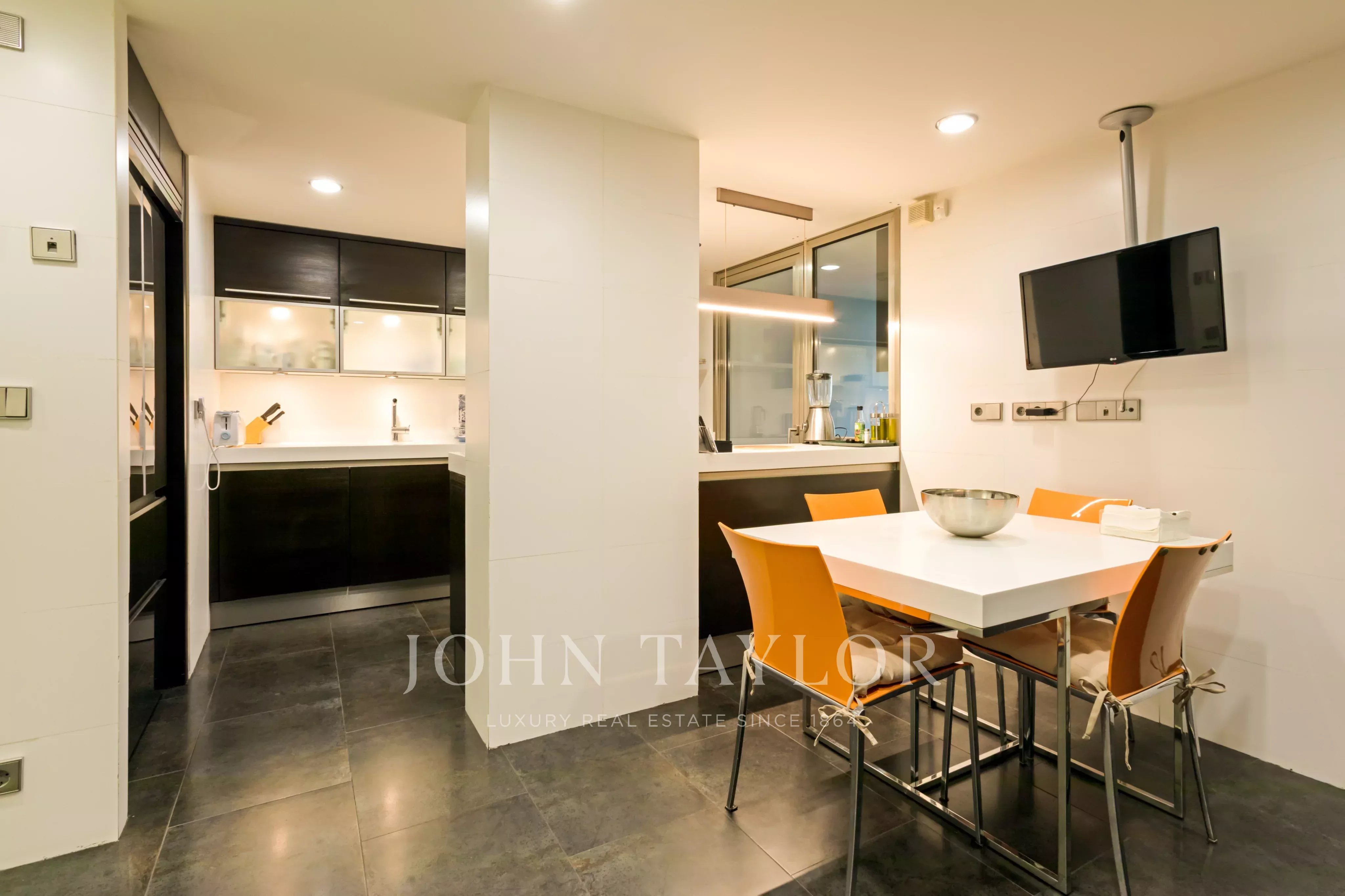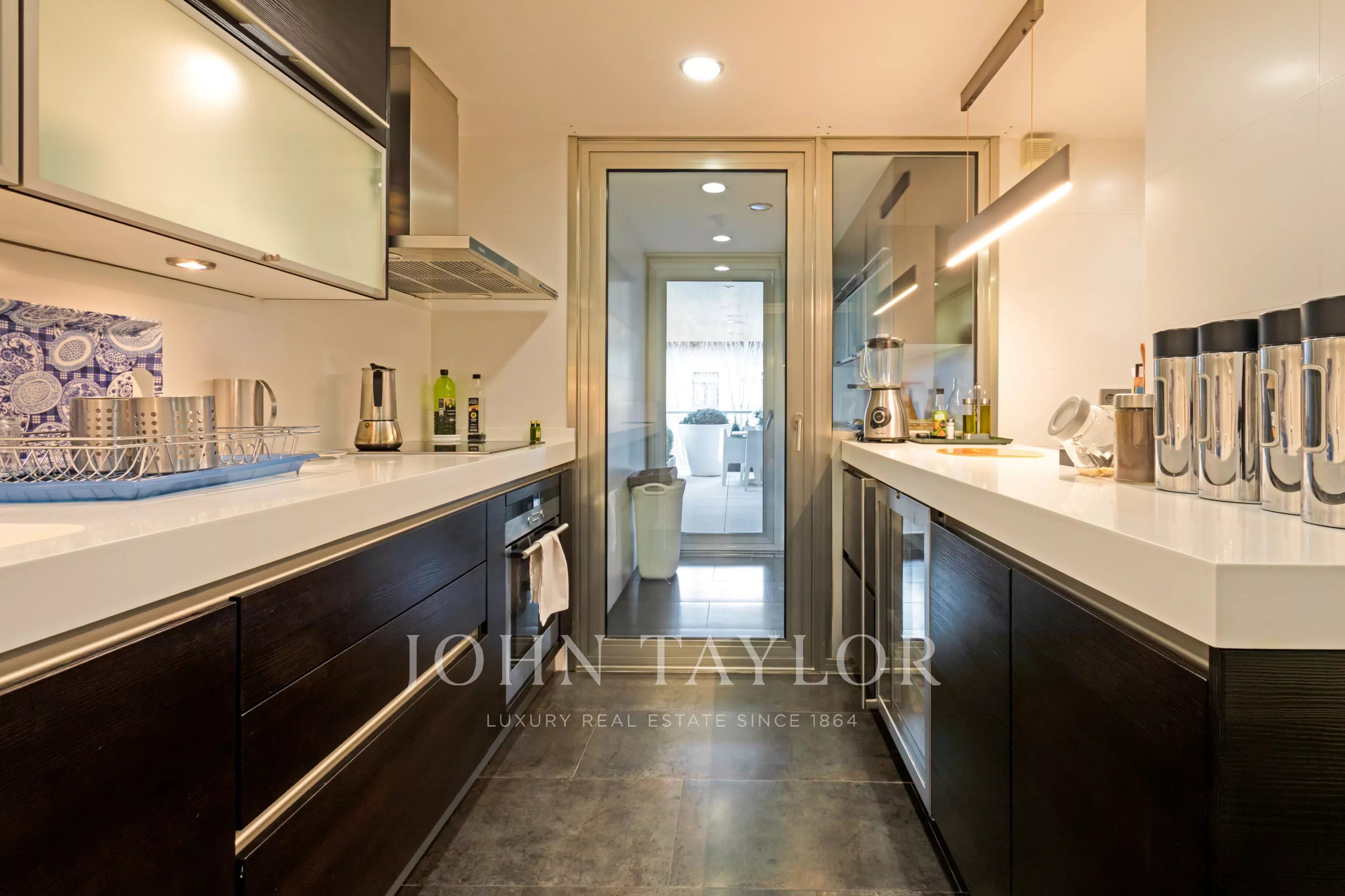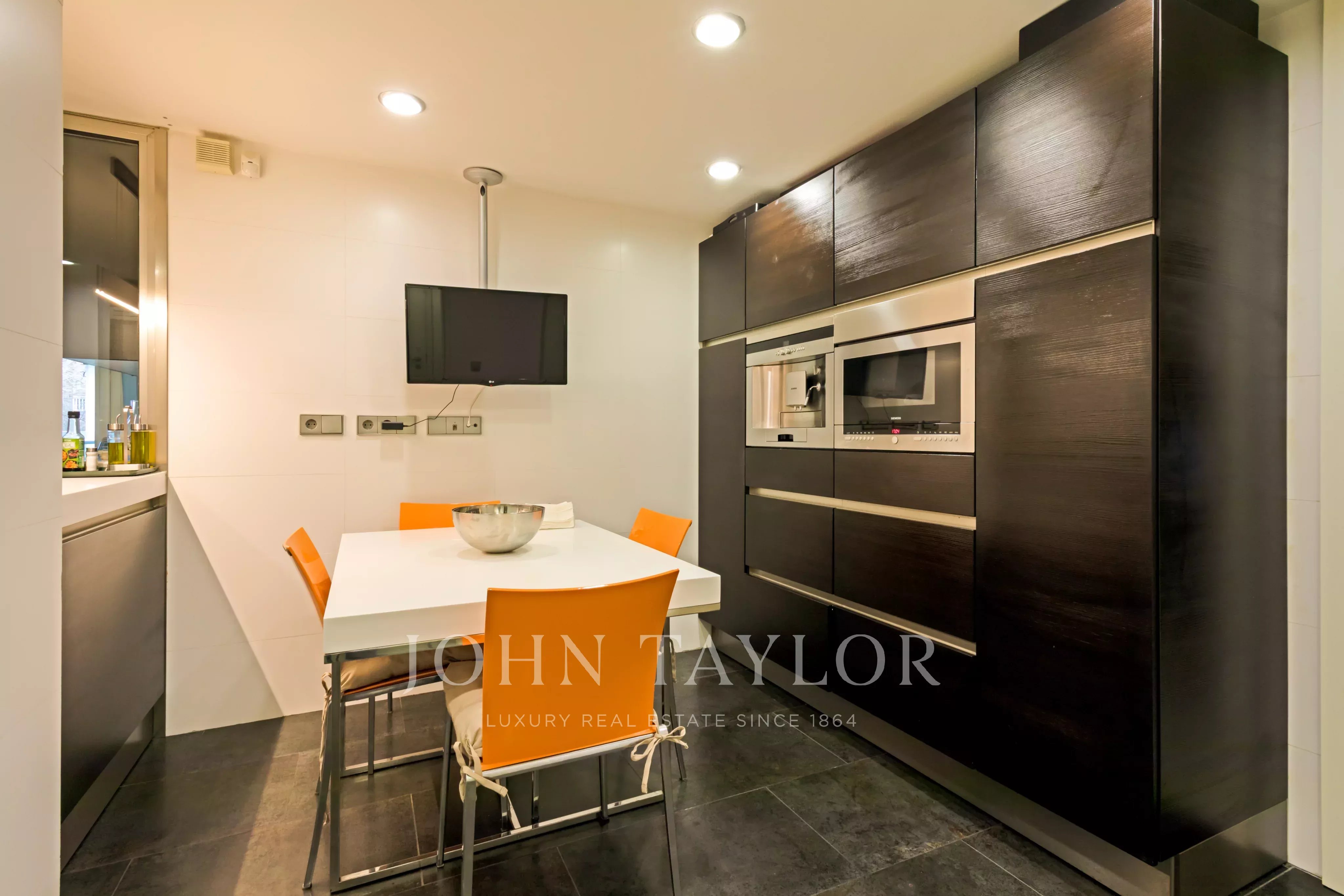 Ampla zona de cozinha totalmente equipada, com terraço de estar virado a nascente. É de salientar a amplitude das divisões, bem como uma elevada capacidade de arrumação proporcionada pelos seus inúmeros roupeiros embutidos do chão ao teto. A propriedade tem aquecimento individual por piso radiante e ar condicionado canalizado.