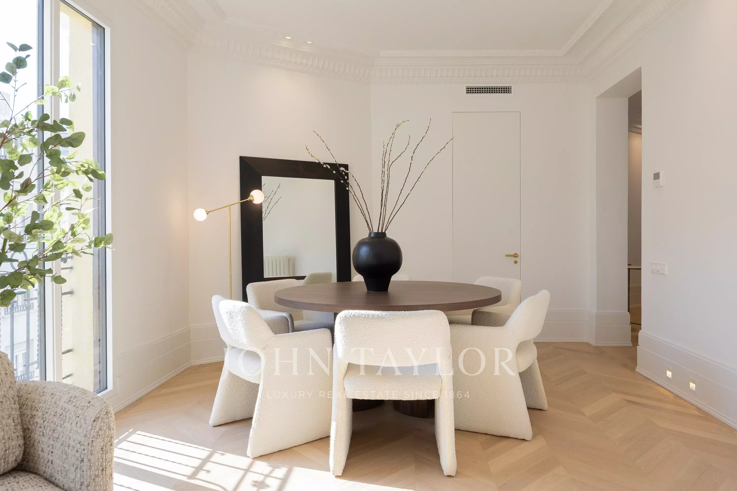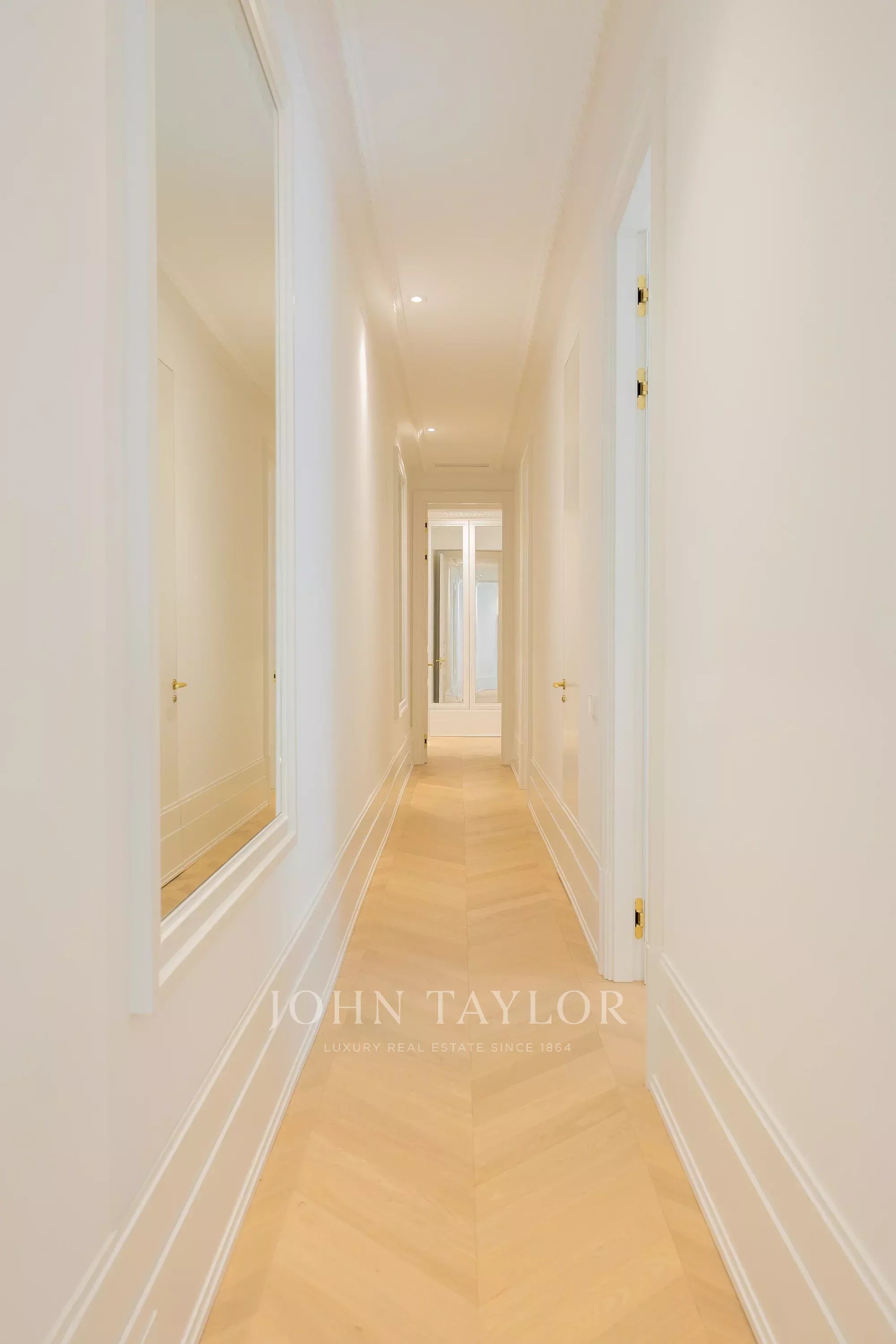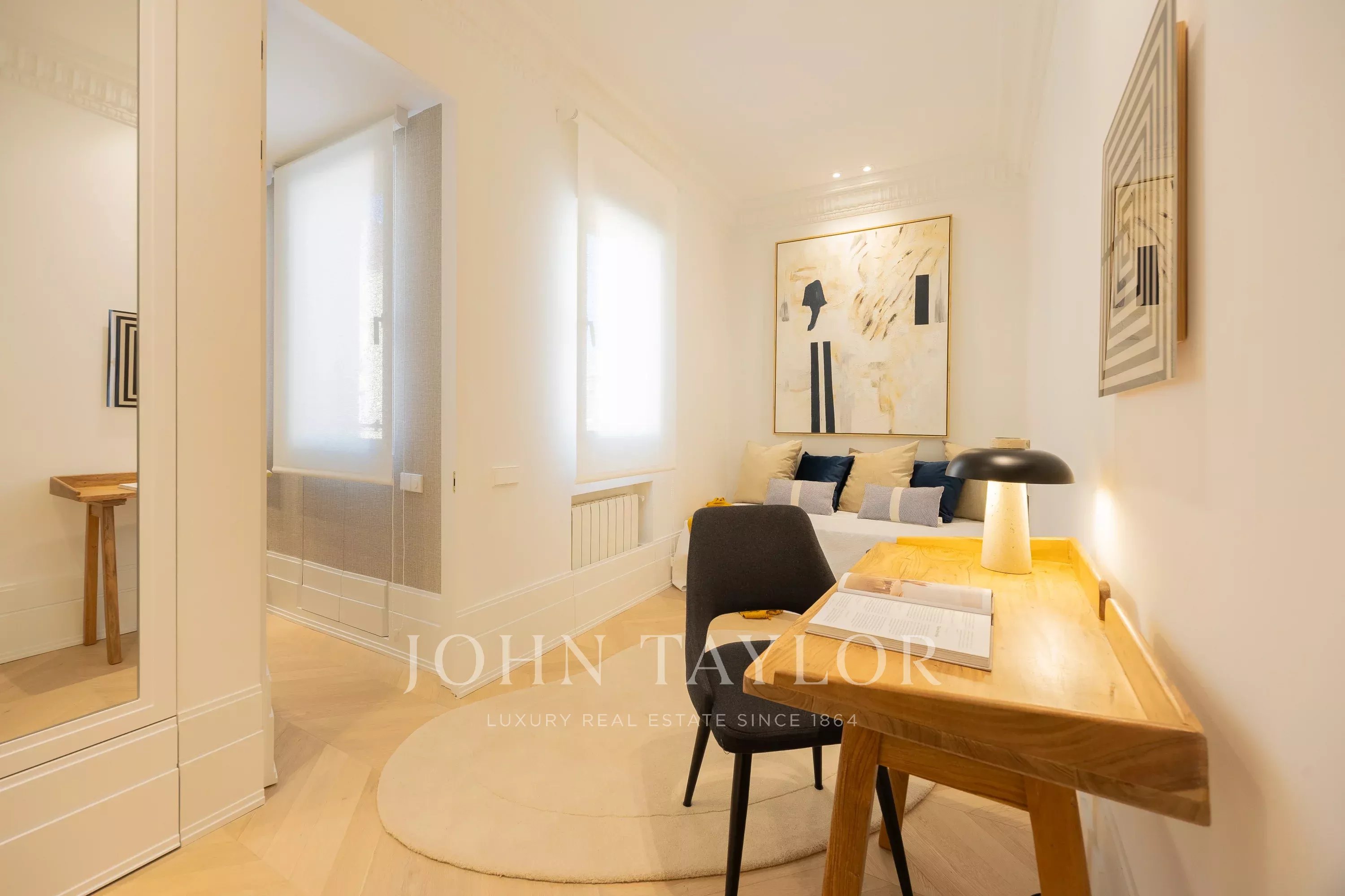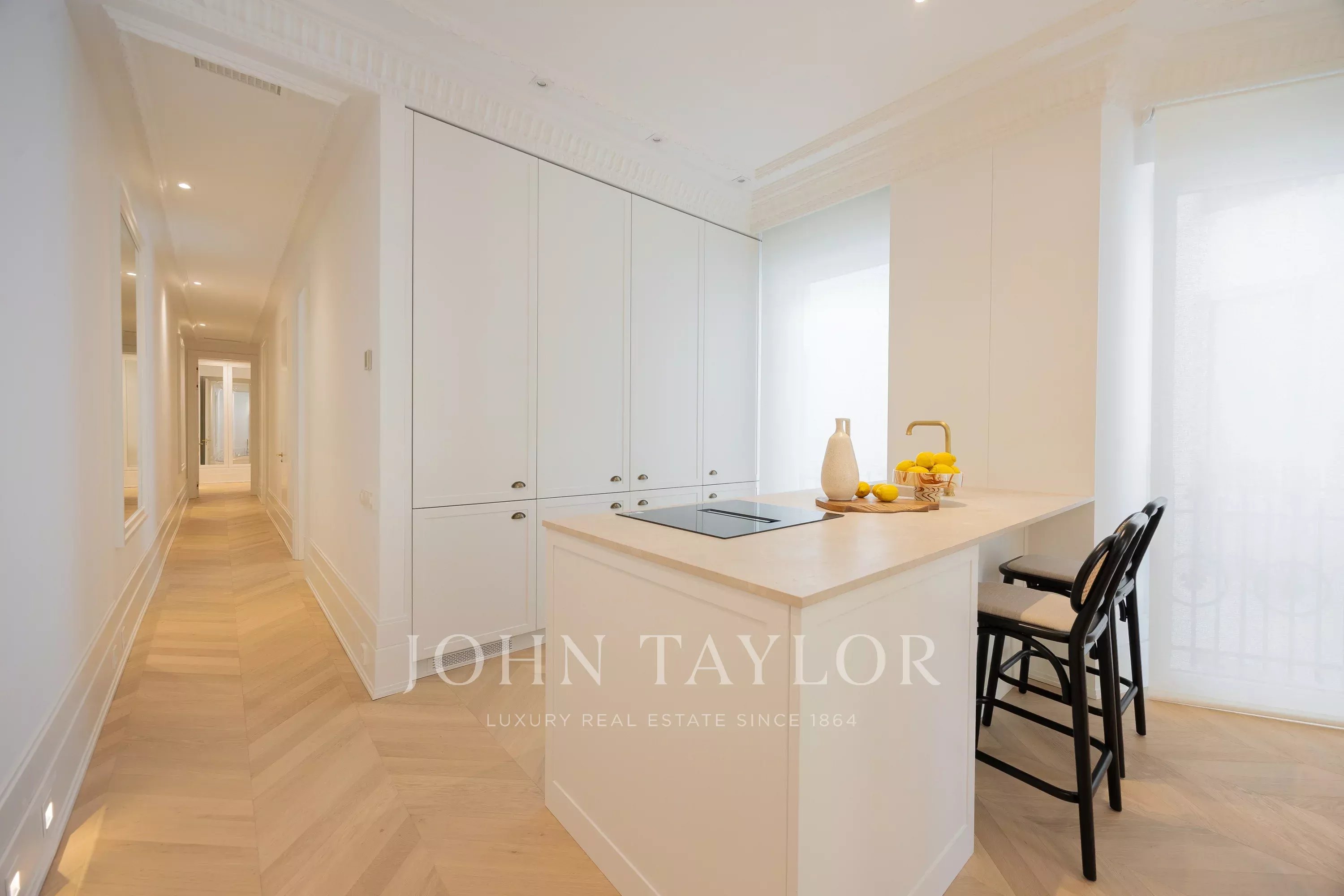 Vivienda exclusiva de 145 m² situada en una quinta planta exterior en el prestigioso barrio de Trafalgar, Chamberí, en un edificio de cuidada fachada clásica.
