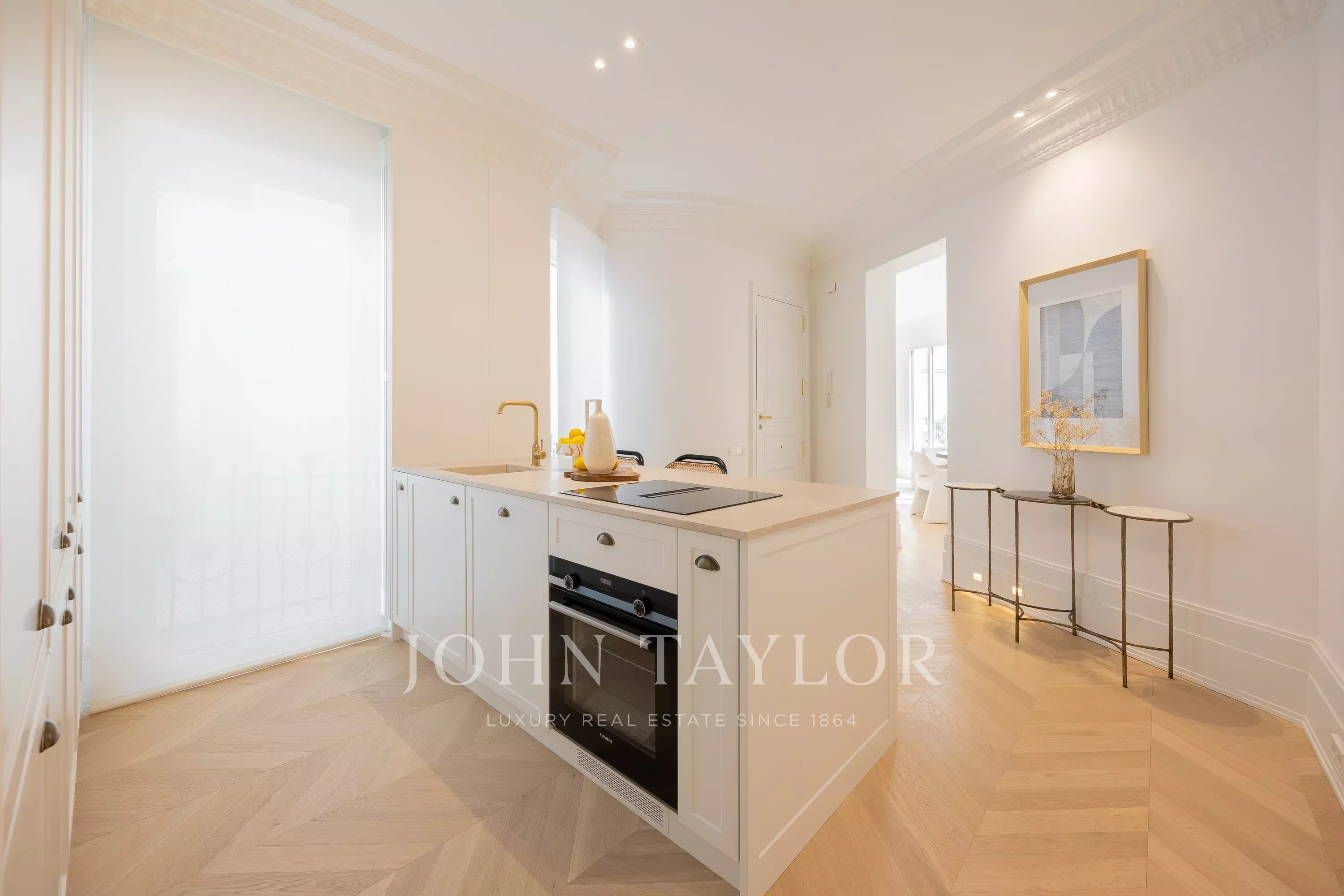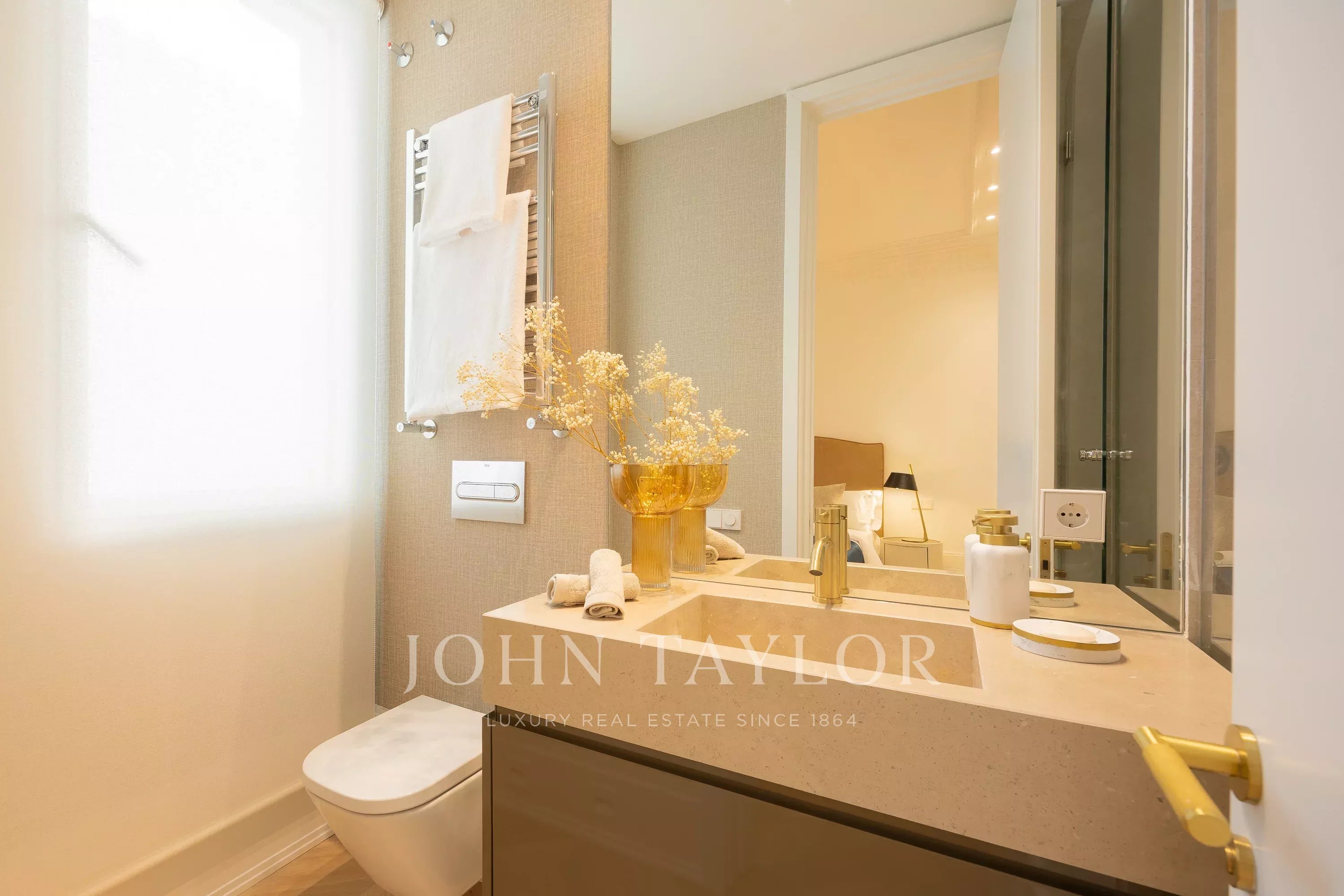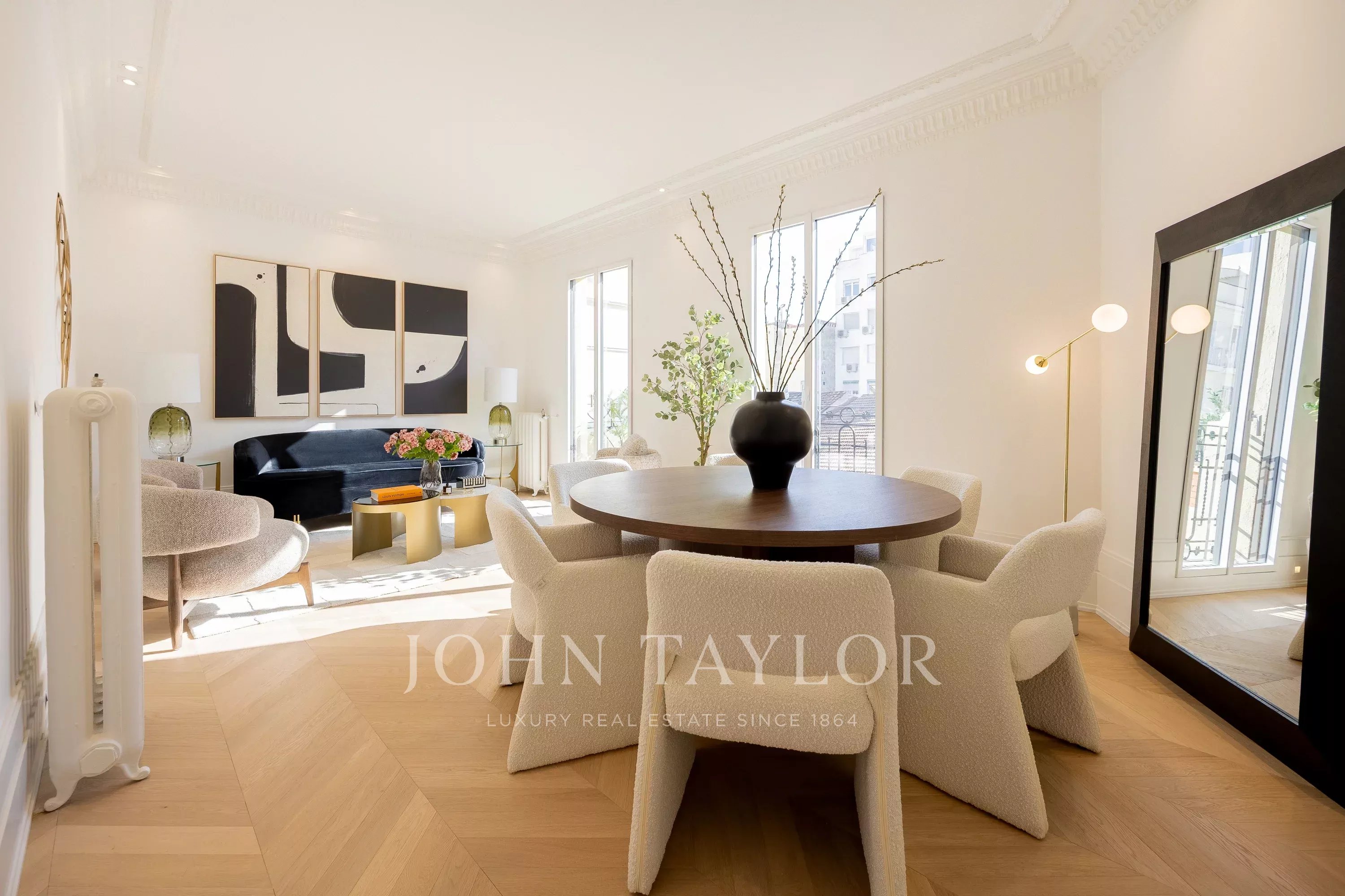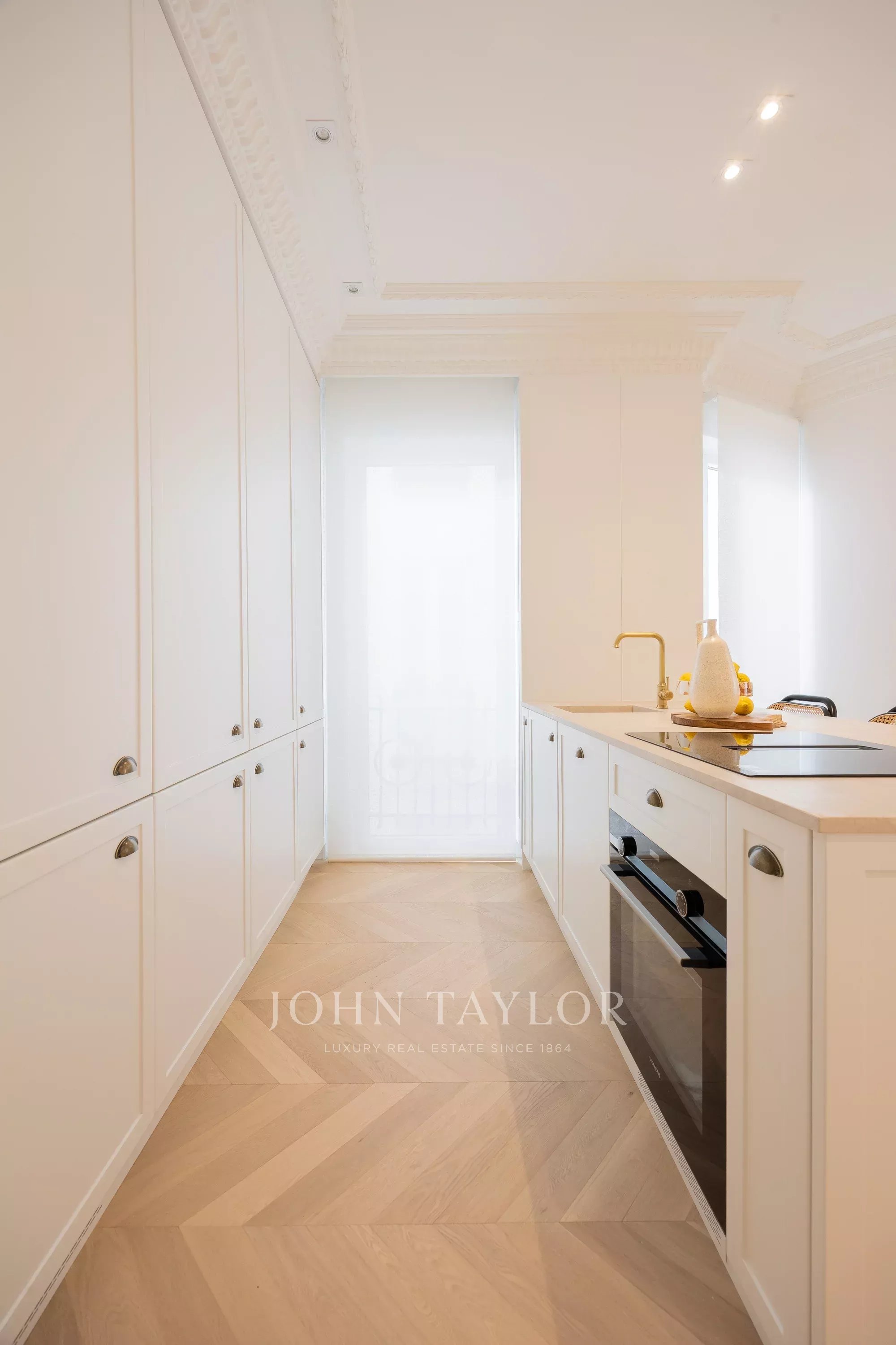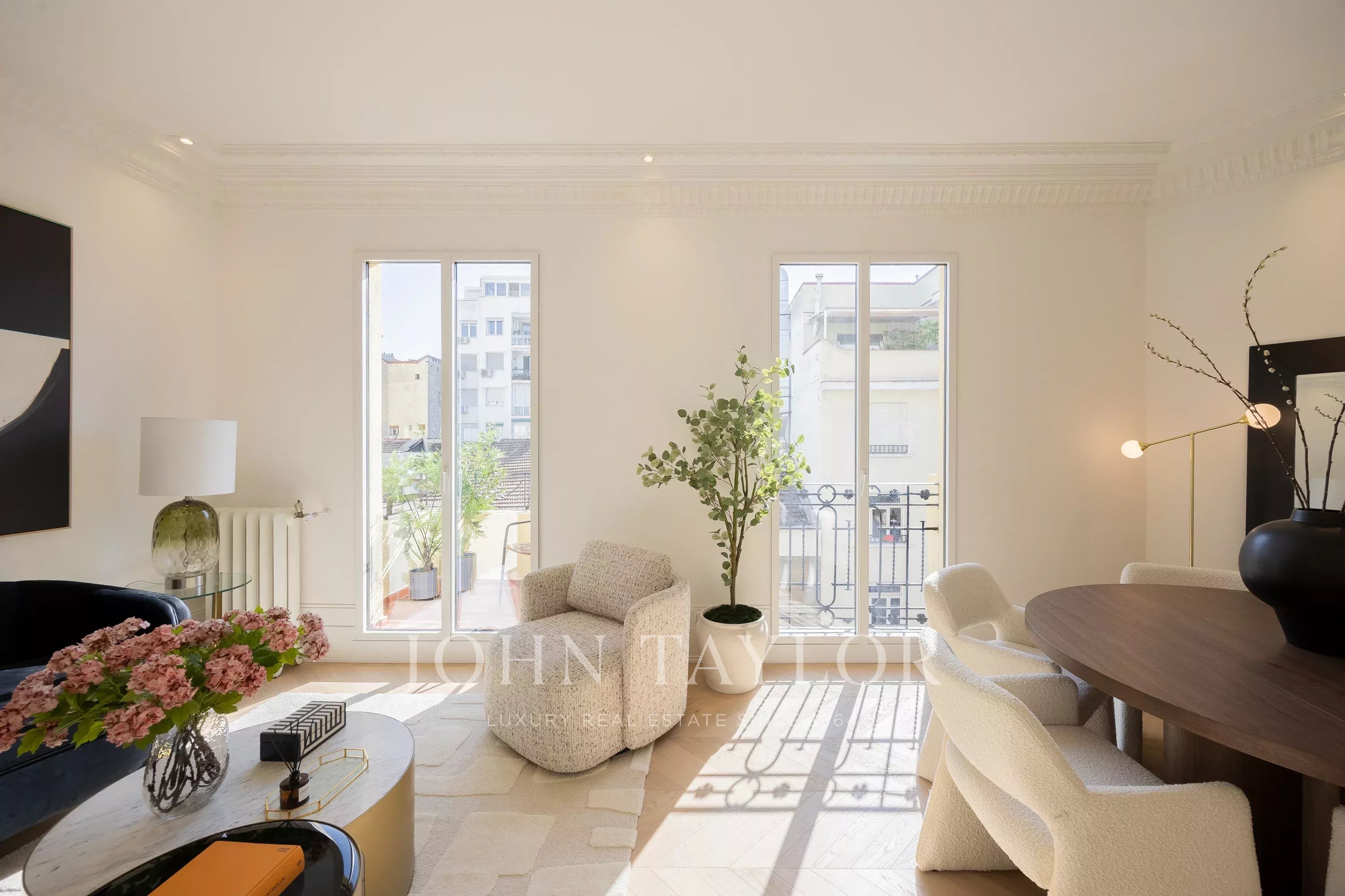 Vivienda exclusiva de 145 m² situada en una quinta planta exterior en el prestigioso barrio de Trafalgar, Chamberí, en un edificio de cuidada fachada clásica.