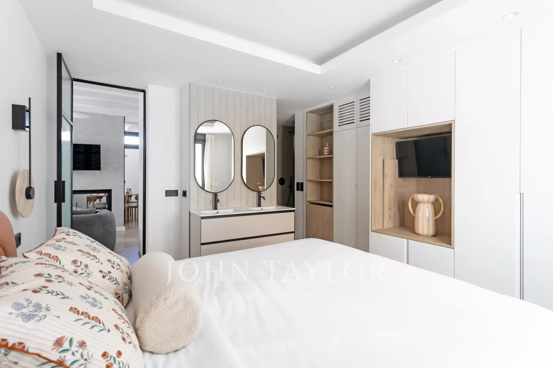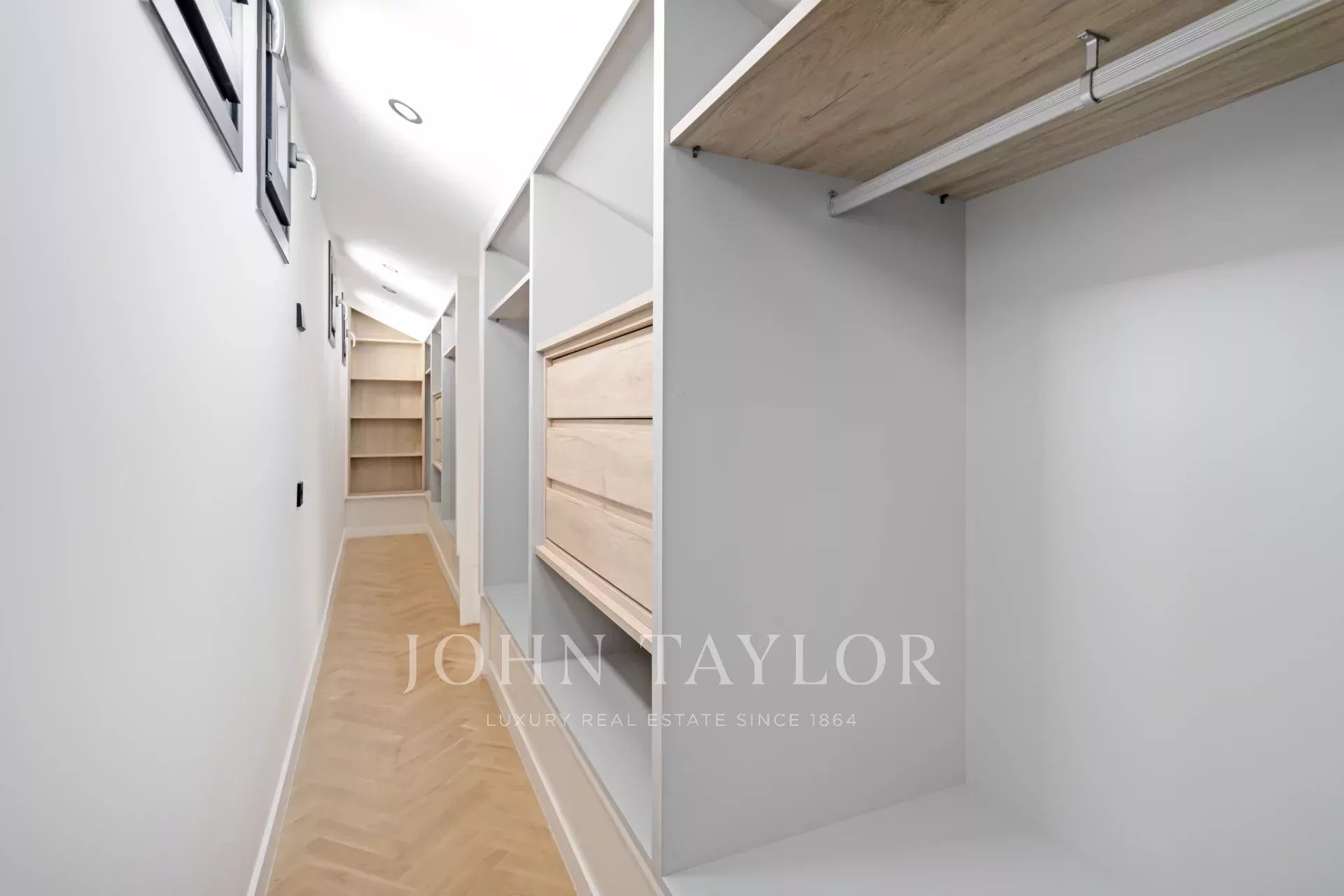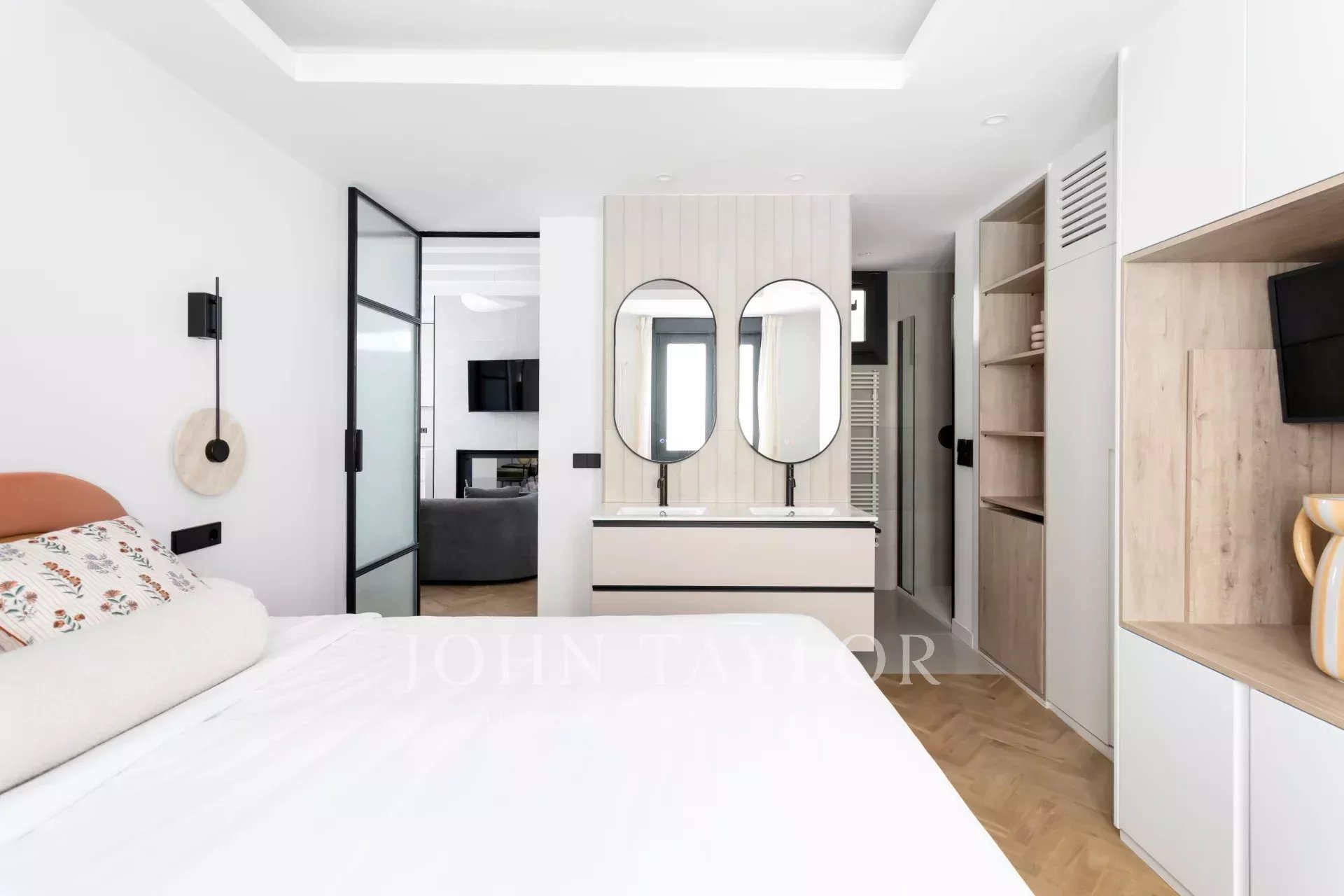 Os dois quartos, com roupeiros embutidos e casas de banho privativas, são muito espaçosos e têm muita luz natural. O quarto principal tem um quarto de vestir no piso superior.