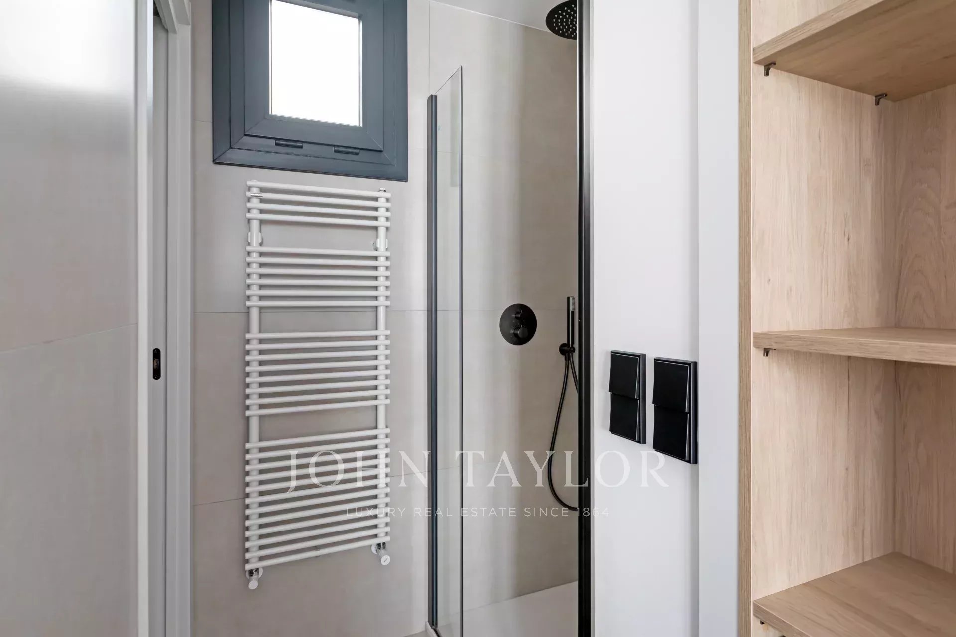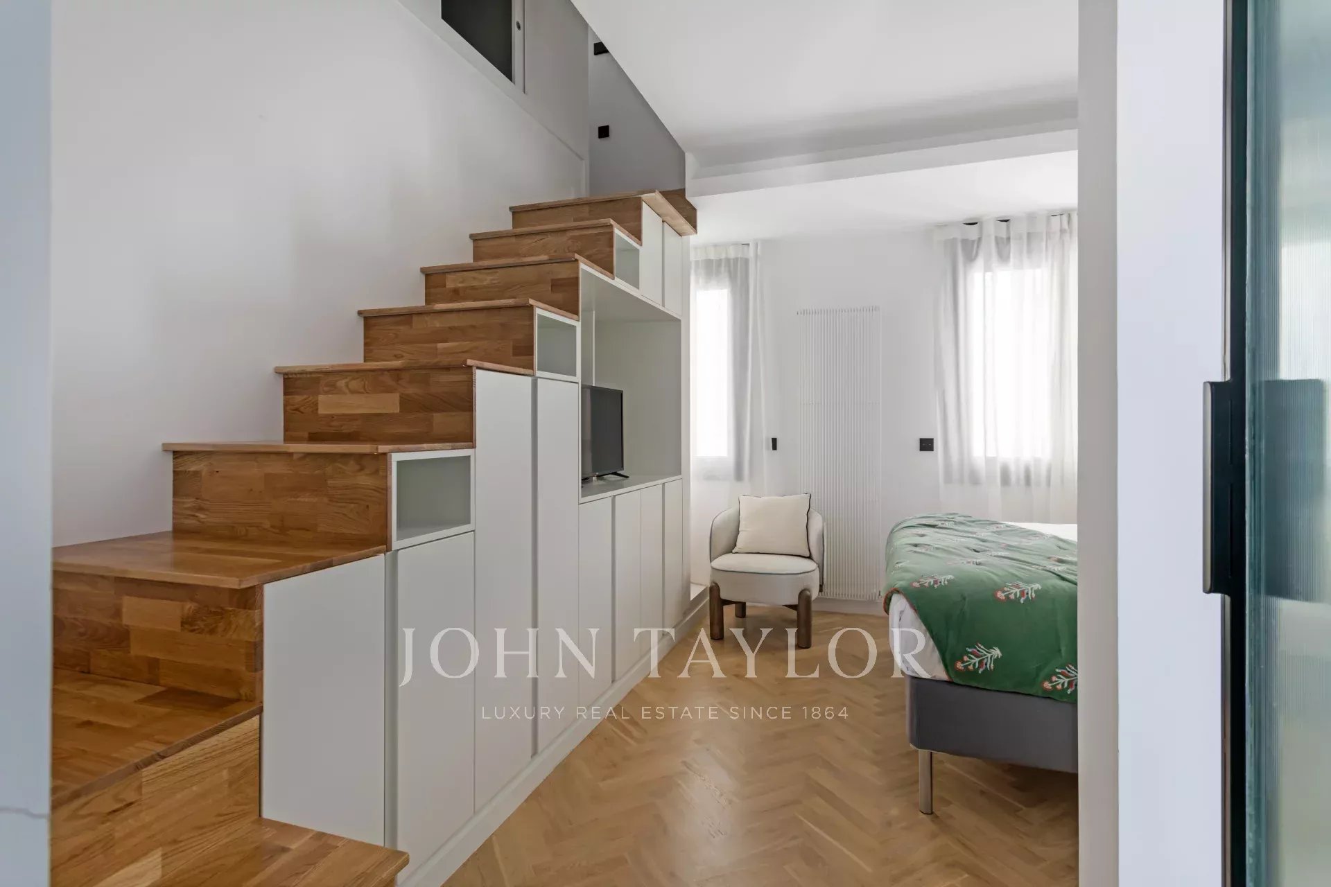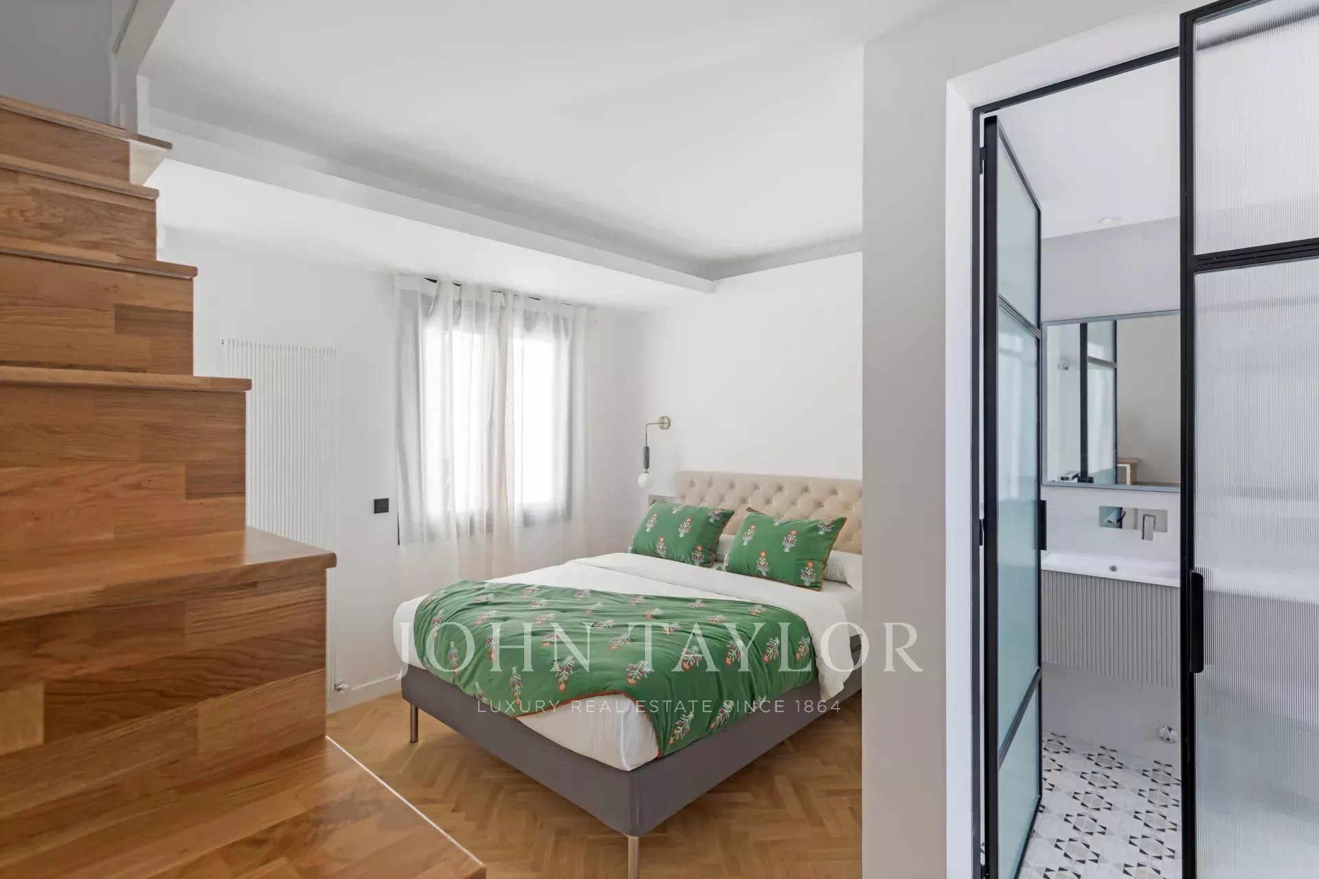 Os dois quartos, com roupeiros embutidos e casas de banho privativas, são muito espaçosos e têm muita luz natural. O quarto principal tem um quarto de vestir no piso superior.