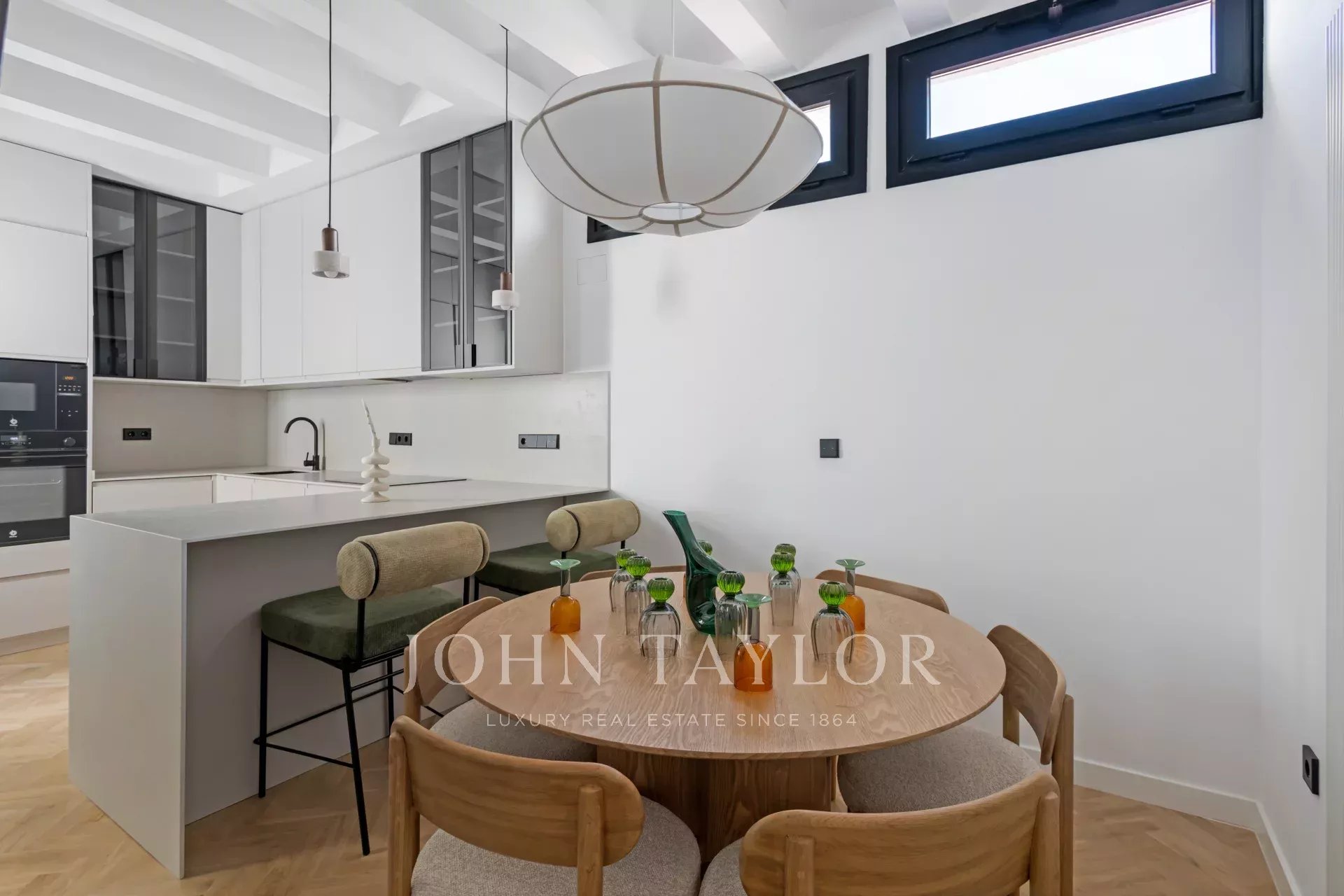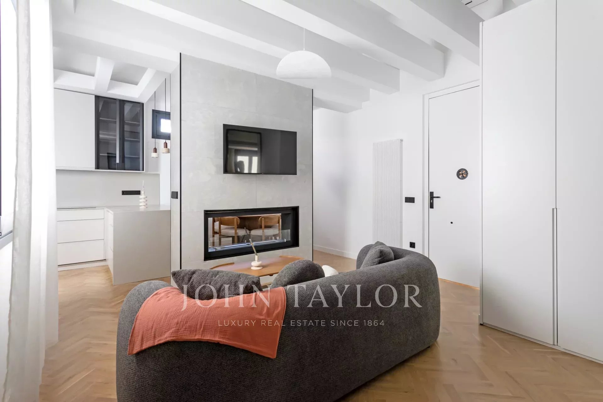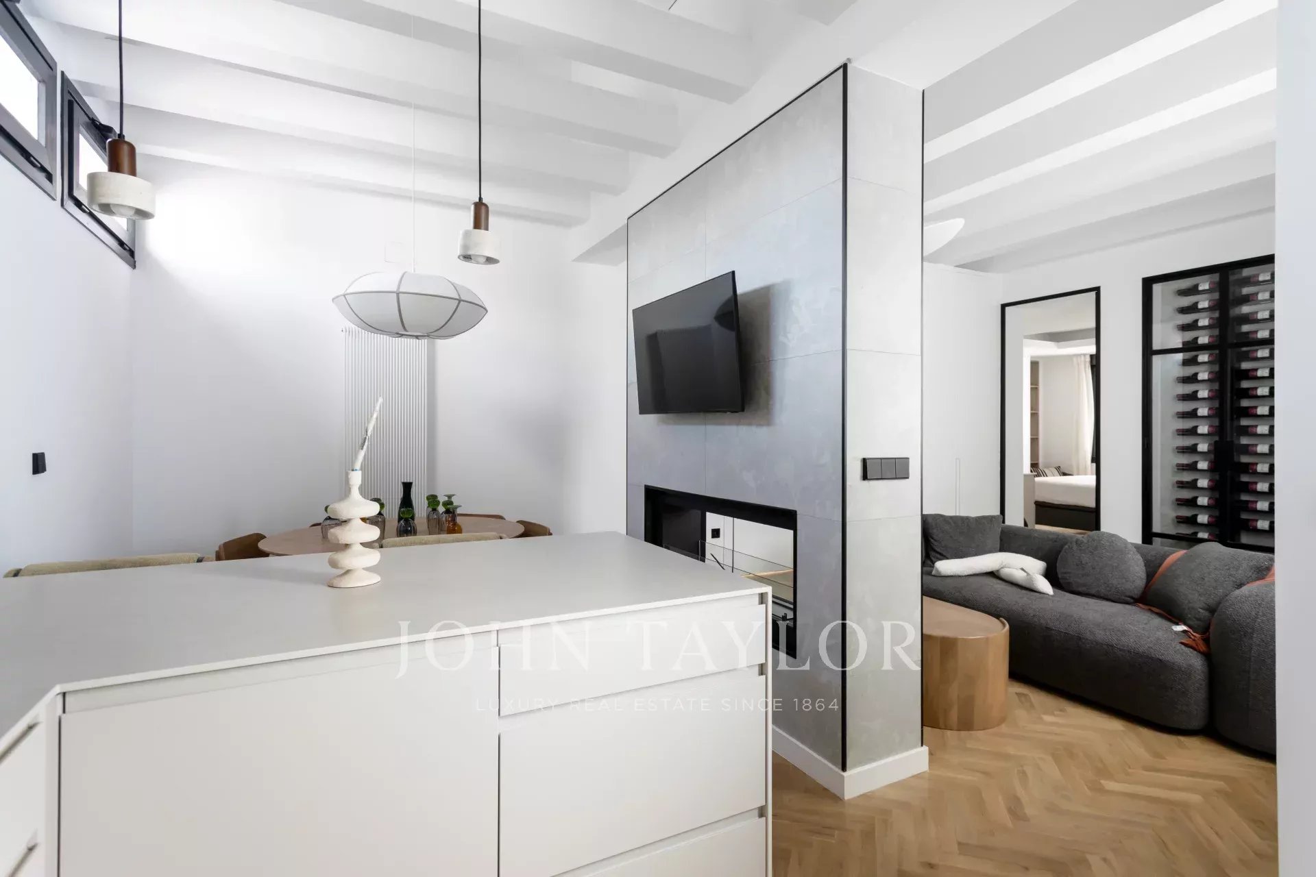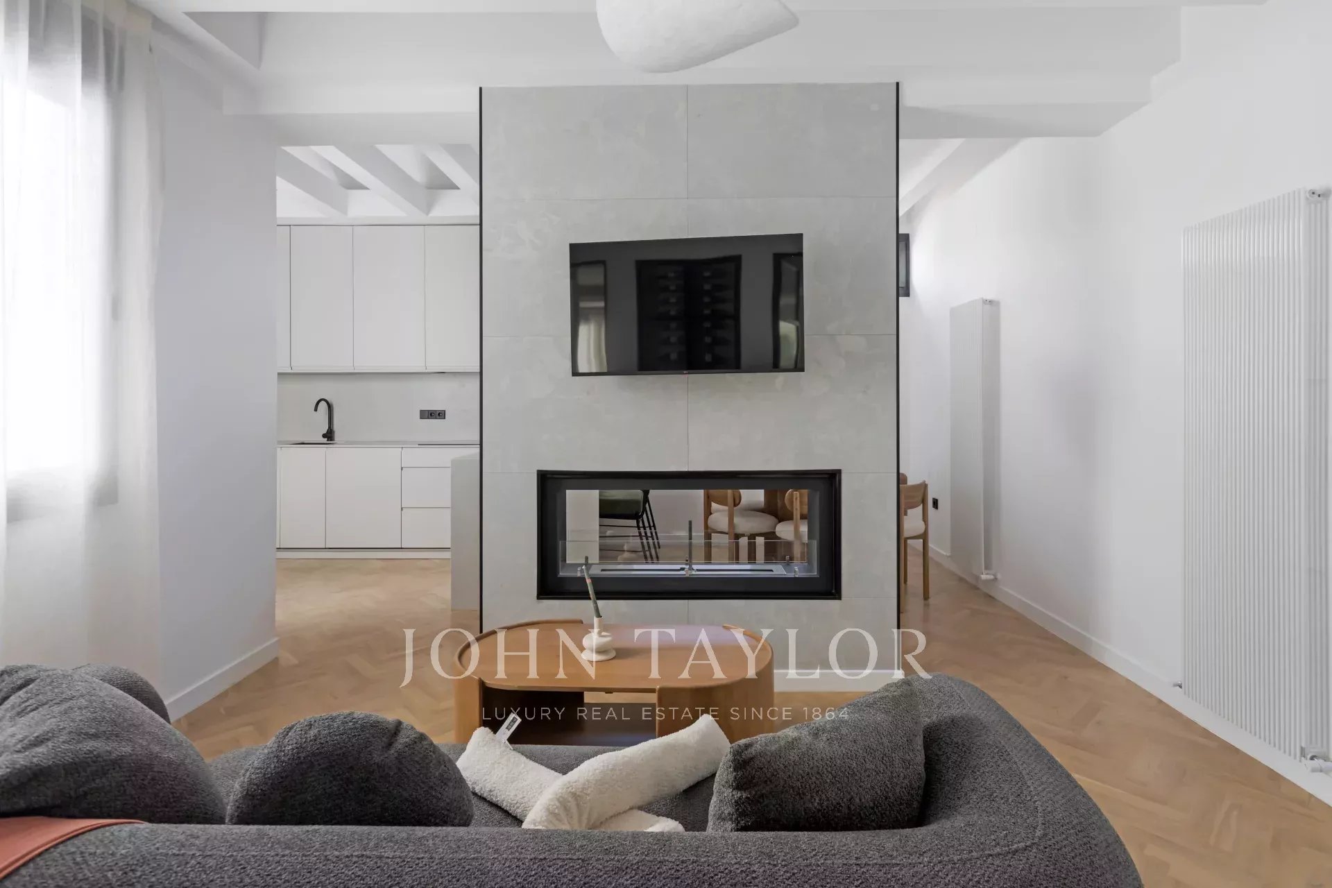 Requintado apartamento de 89m² situado no quarto andar de um edifício clássico na rua Santa Engracia, entre a Plaza de Chamberi e a Plaza de Alonso Martinez. A remodelação, efectuada com excelente gosto e materiais de alta qualidade, aproveitou de forma inteligente o espaço e a luz para conseguir um ambiente alegre, moderno e acolhedor.