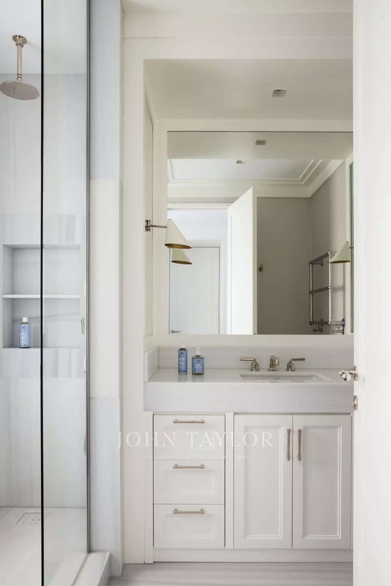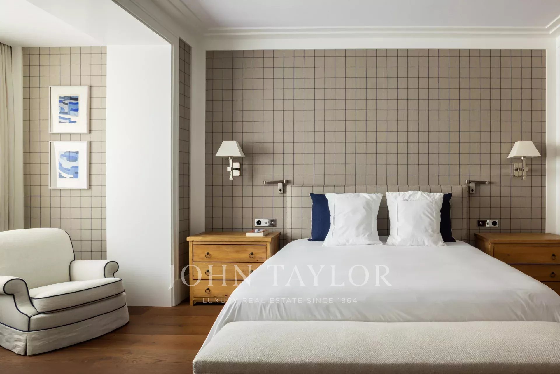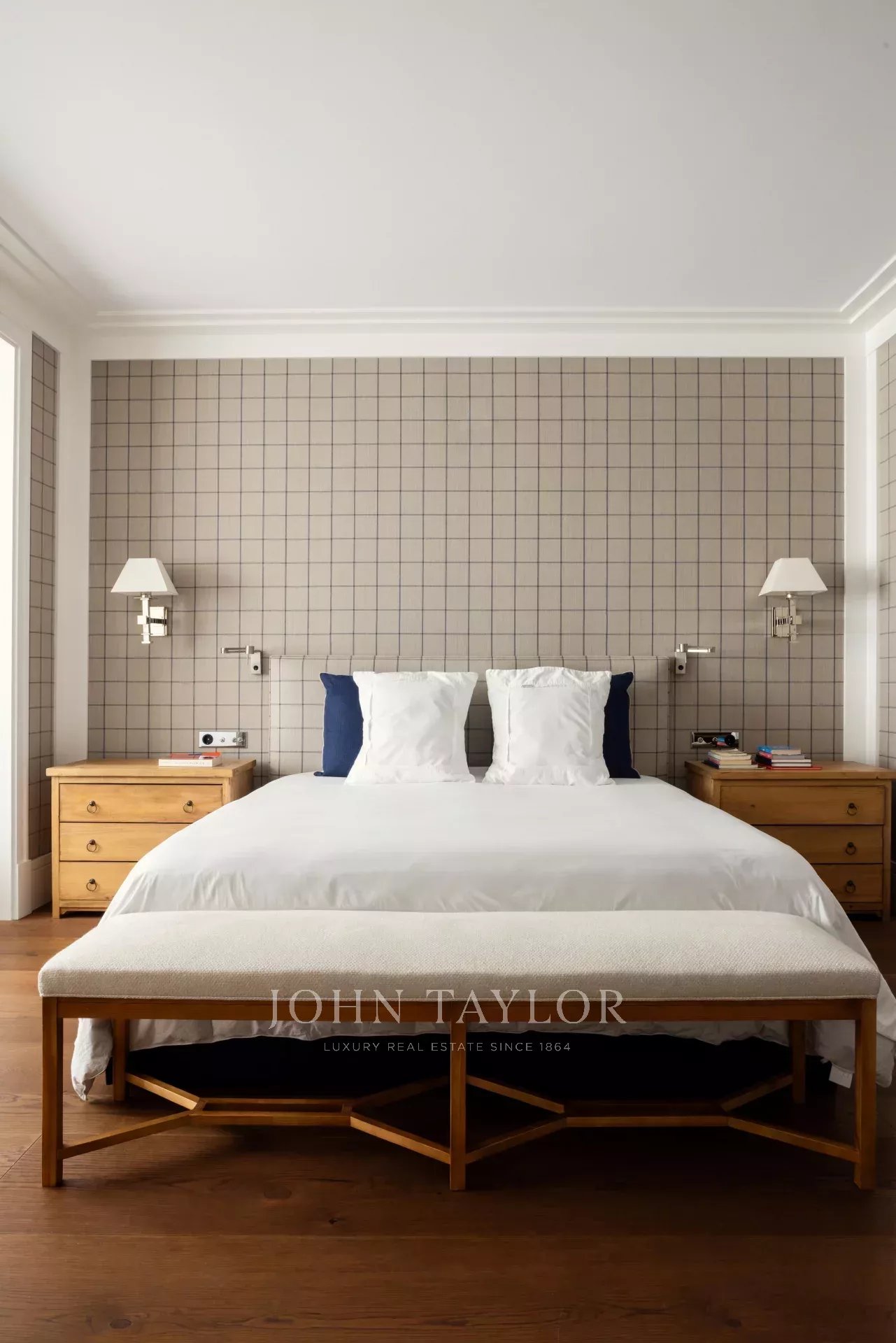 A suite principal destaca-se pelo seu majestoso quarto de vestir e pelo design inovador da casa de banho, estruturada em duas cabines separadas para lavatório e sanita, acompanhadas por uma espaçosa casa de banho com duche, banheira e zona de toucador.